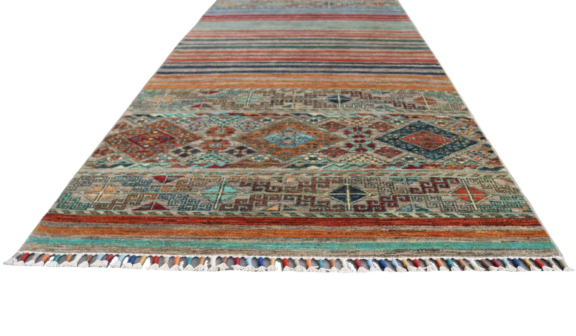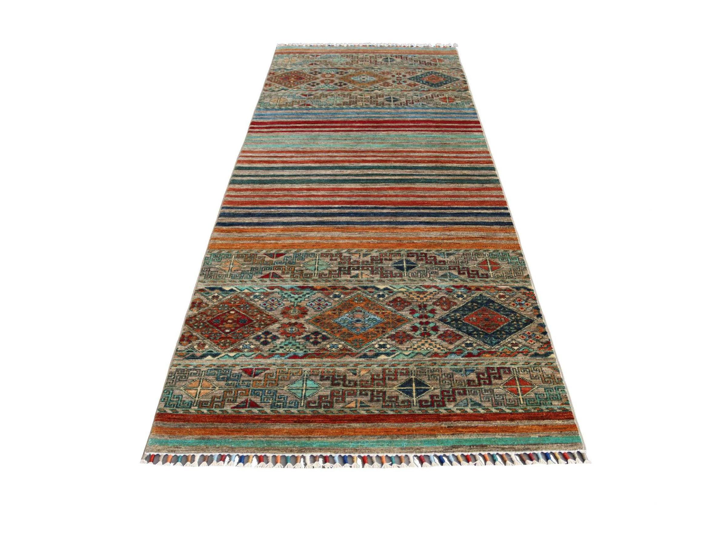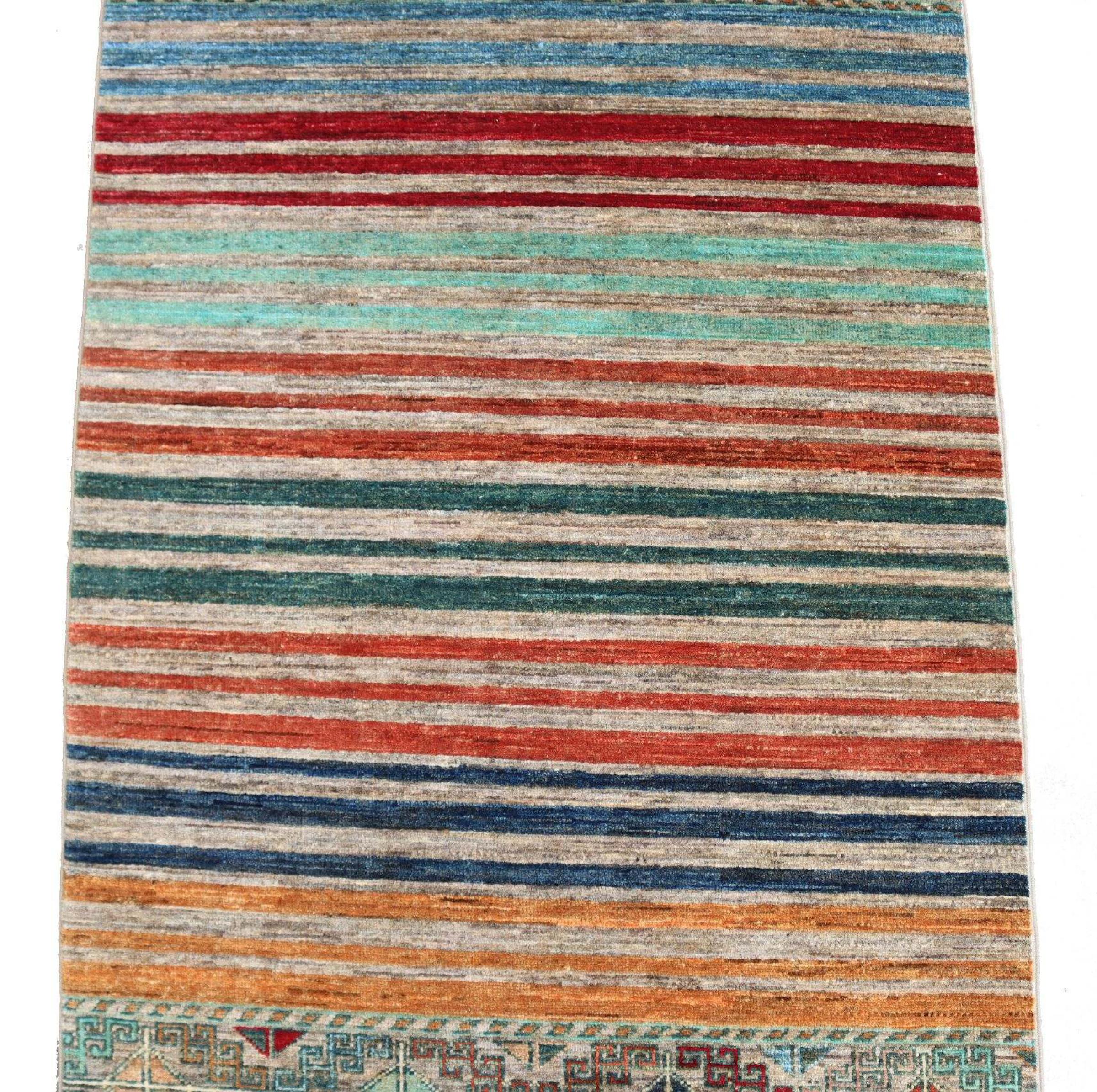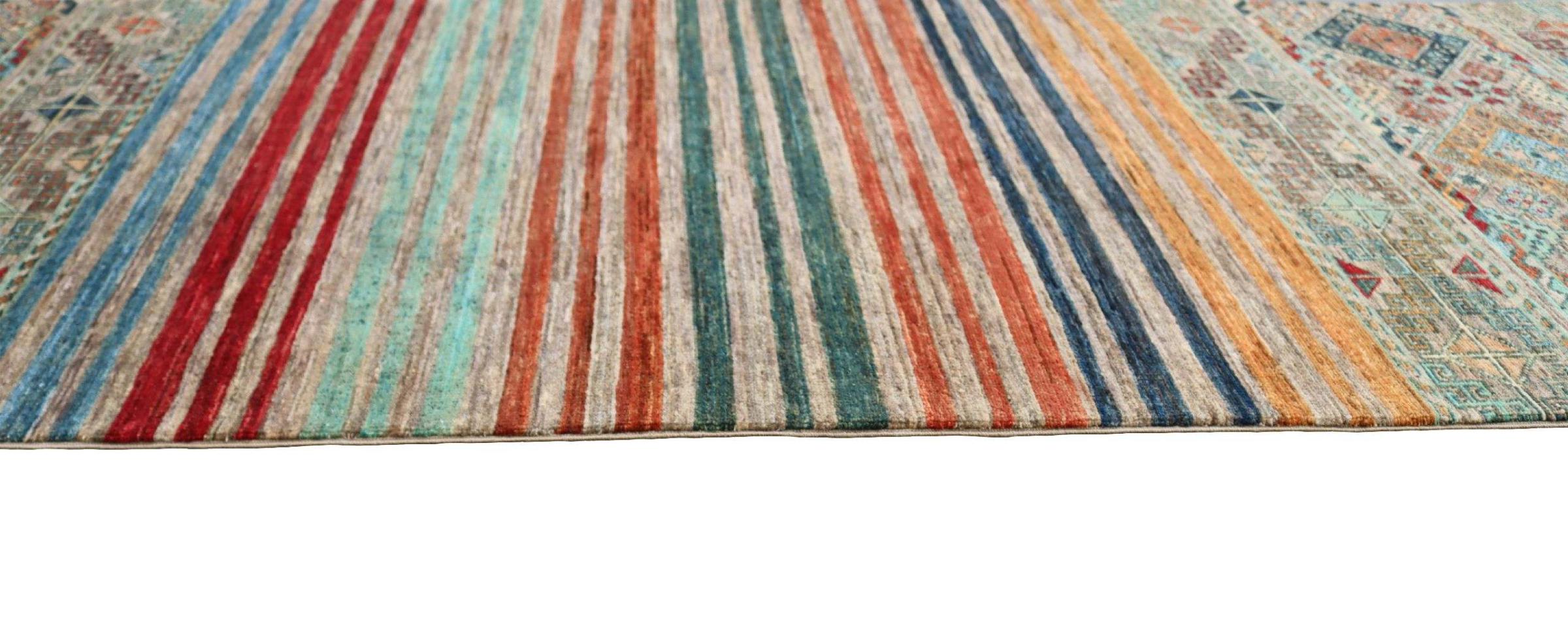 Esta alfombra de Arijana Shaal fue anudada a mano en Pakistán con la mejor artesanía. Promete una calidad muy alta y por lo tanto ofrece un placer duradero. El patrón de las rayas es variado y excitante. Se inspiró en el conocido diseño Moharamati. Si las alfombras monocromáticas son demasiado aburridas para ti, seguro que te encantará esta Arijana Shaal.