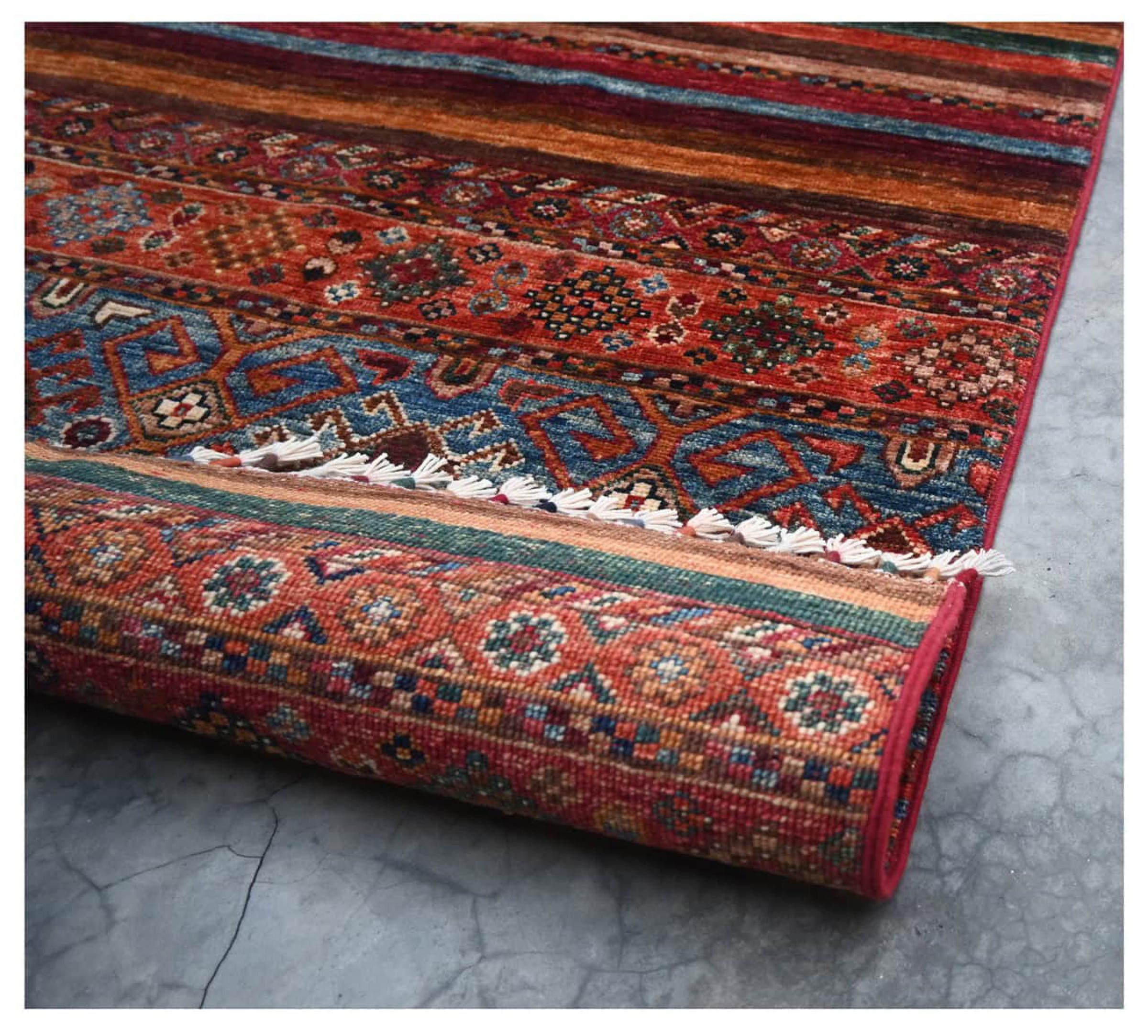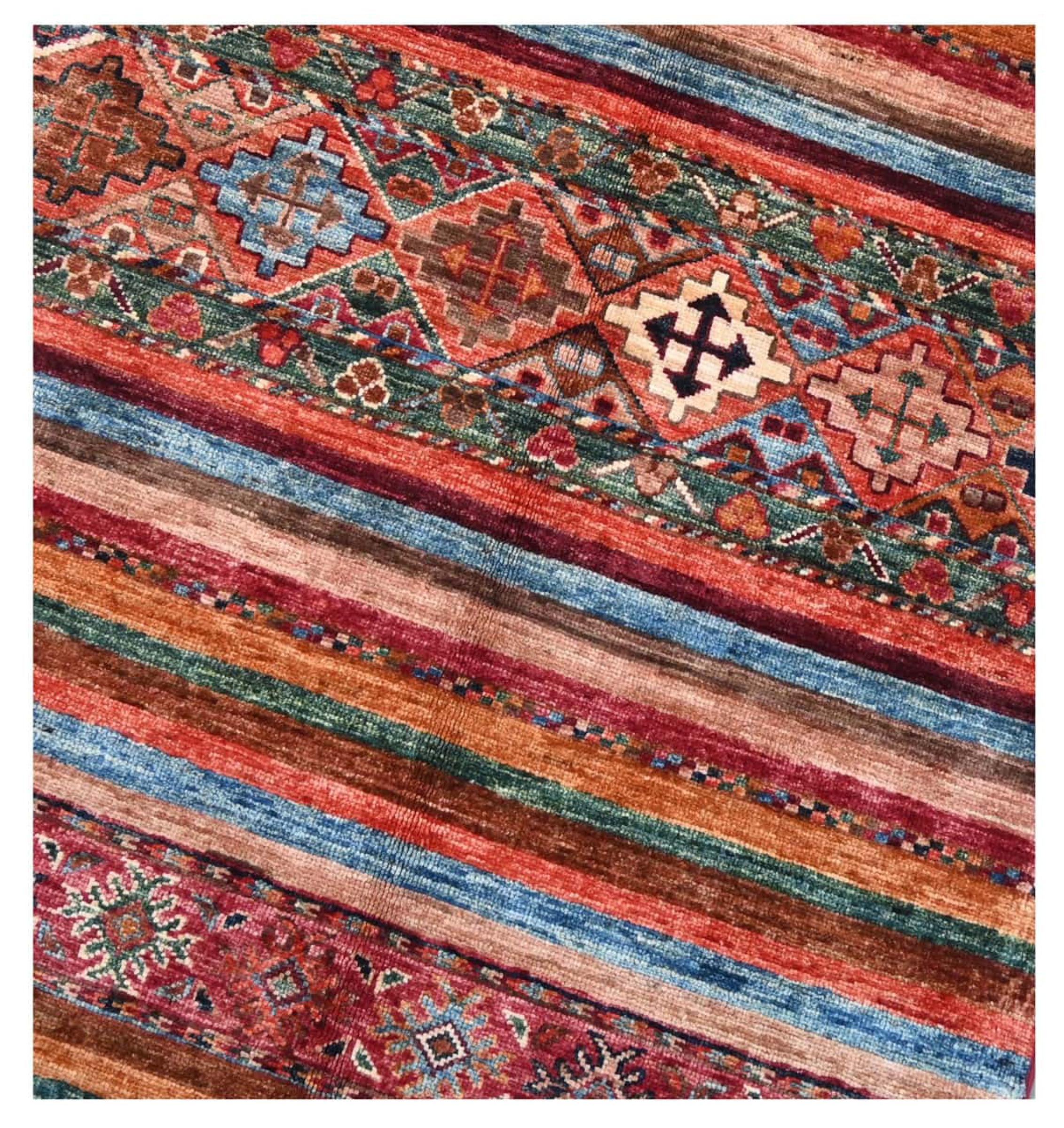 Esta alfombra de Arijana Shaal fue anudada a mano en Pakistán con la mejor artesanía. Promete una calidad muy alta y por lo tanto ofrece un placer duradero. El patrón de las rayas es variado y excitante. Se inspiró en el conocido diseño Moharamati. Si las alfombras monocromáticas son demasiado aburridas para ti, seguro que te encantará esta Arijana Shaal.