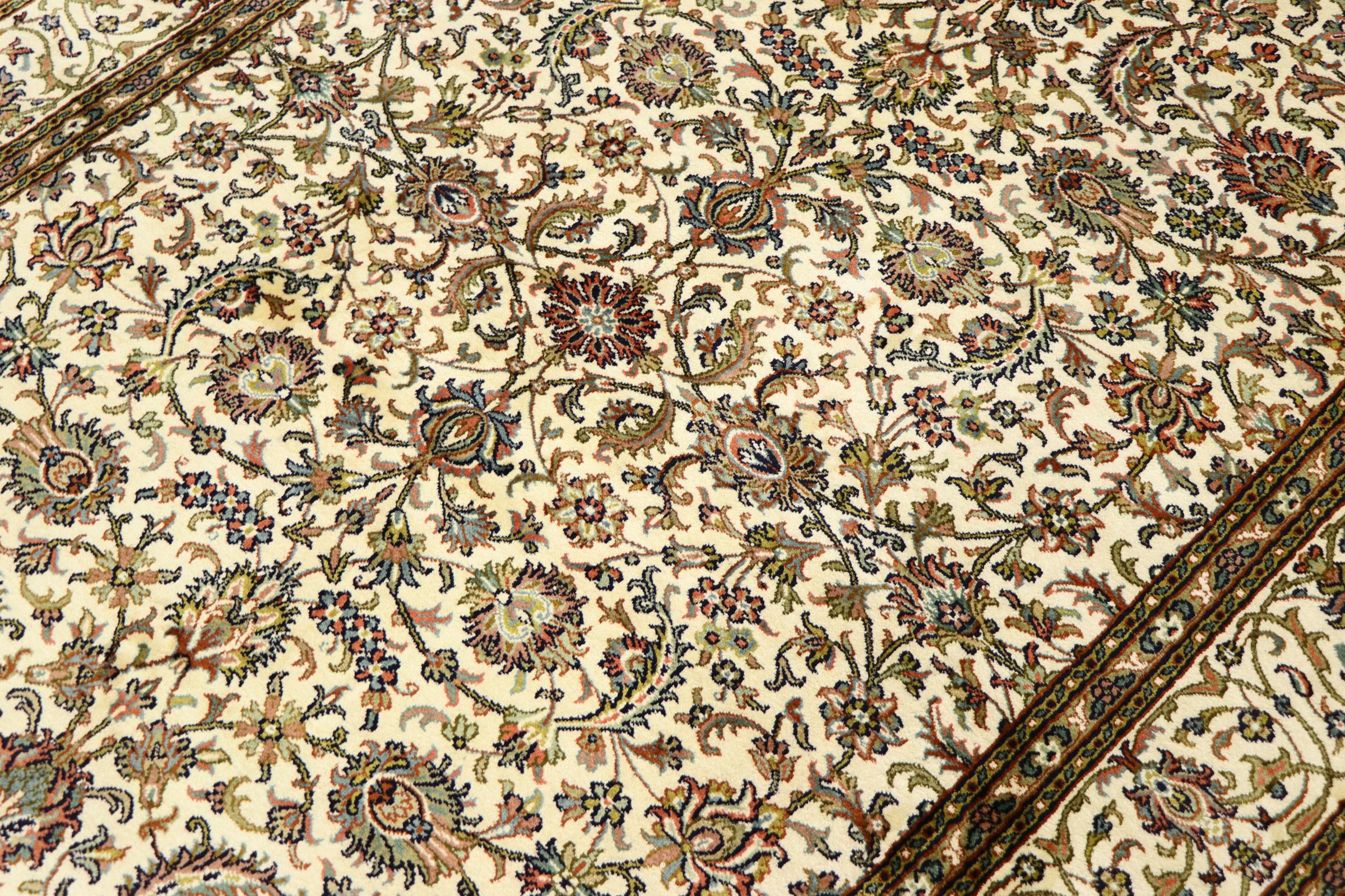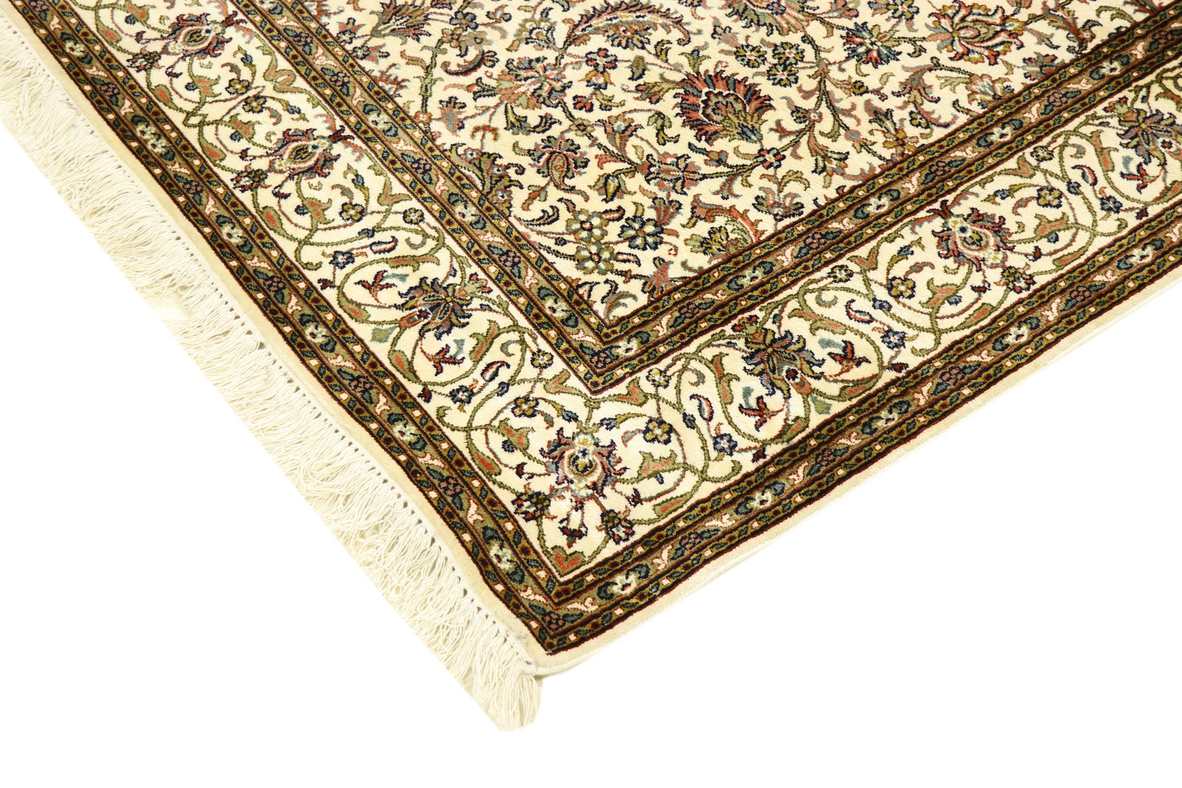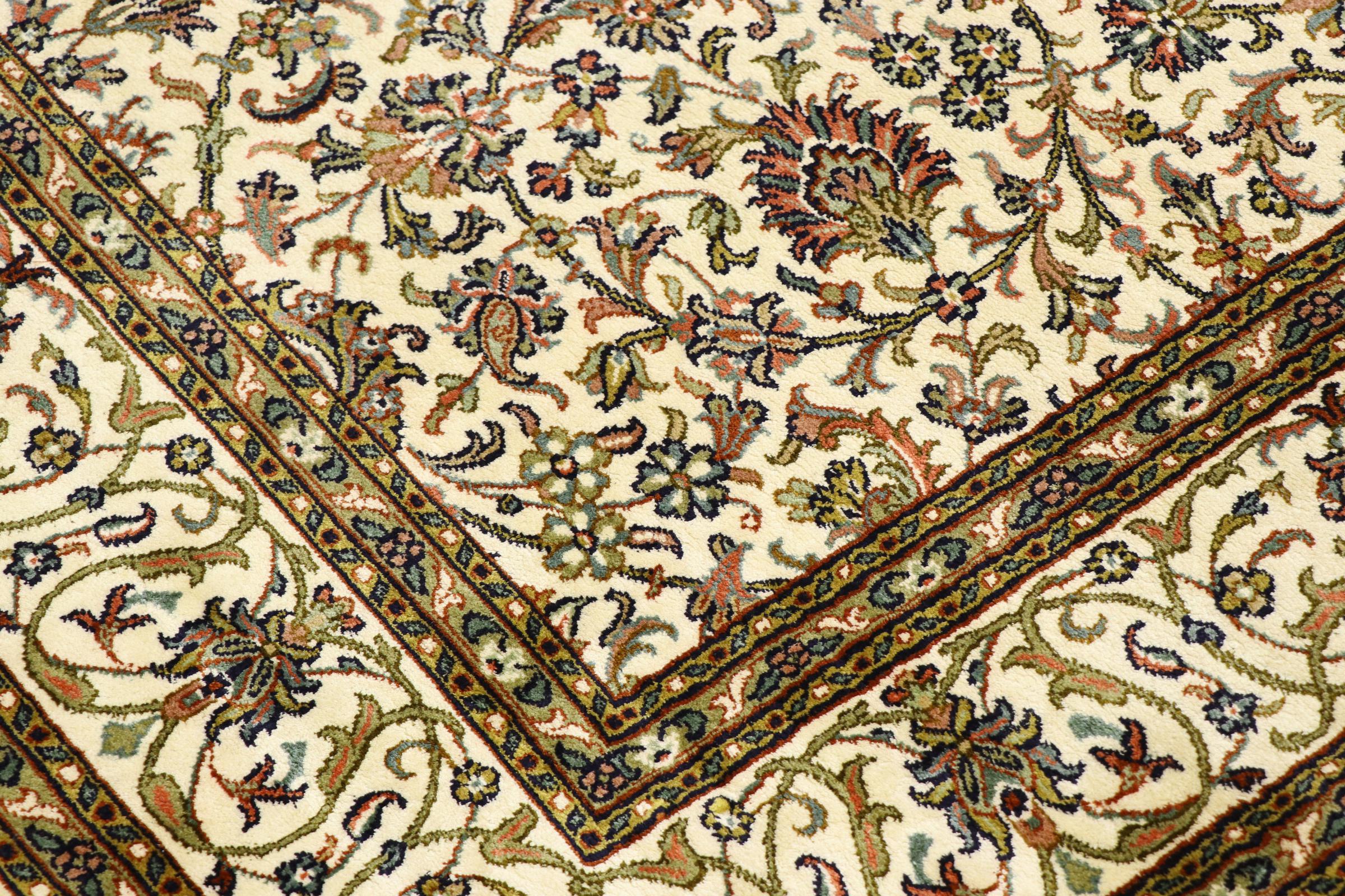 Esta alfombra de seda anudada a mano procedente de Cachemira refleja la habilidad de los tejedores de alfombras indios. No sólo está hecha de seda pura, sino que su densidad de nudos es tan fina que sólo tejedores muy experimentados pueden crear una obra así. La fina seda natural es un elemento fascinante. No sólo tiene un tacto especialmente suave, sino que permite que sus colores brillen en las facetas más diversas. Dependiendo de la incidencia de la luz, salen a la luz detalles y colores completamente nuevos que seguirán impresionando durante años. Se puede contemplar una alfombra así durante horas y olvidarse del tiempo: una experiencia que no se puede capturar en una foto.