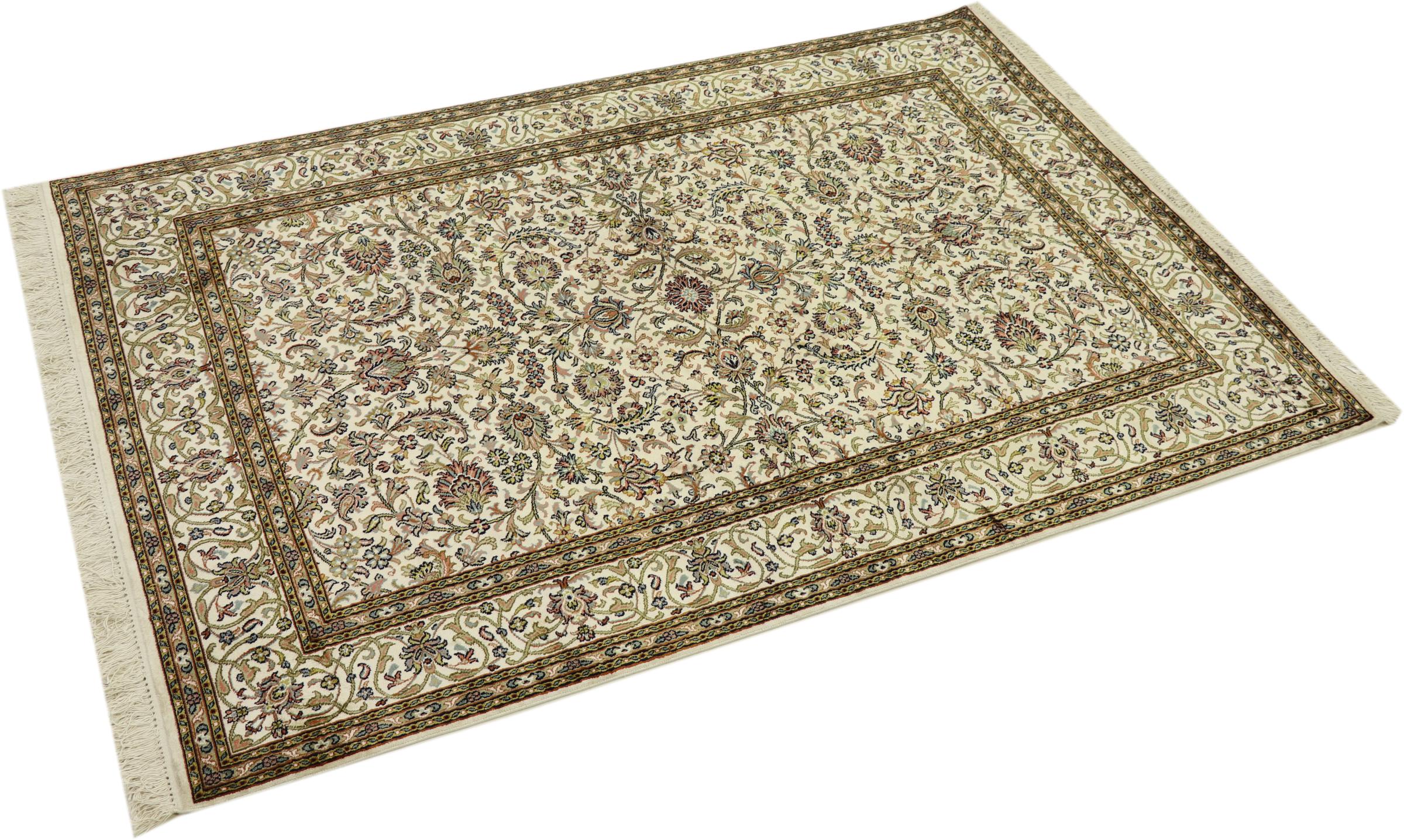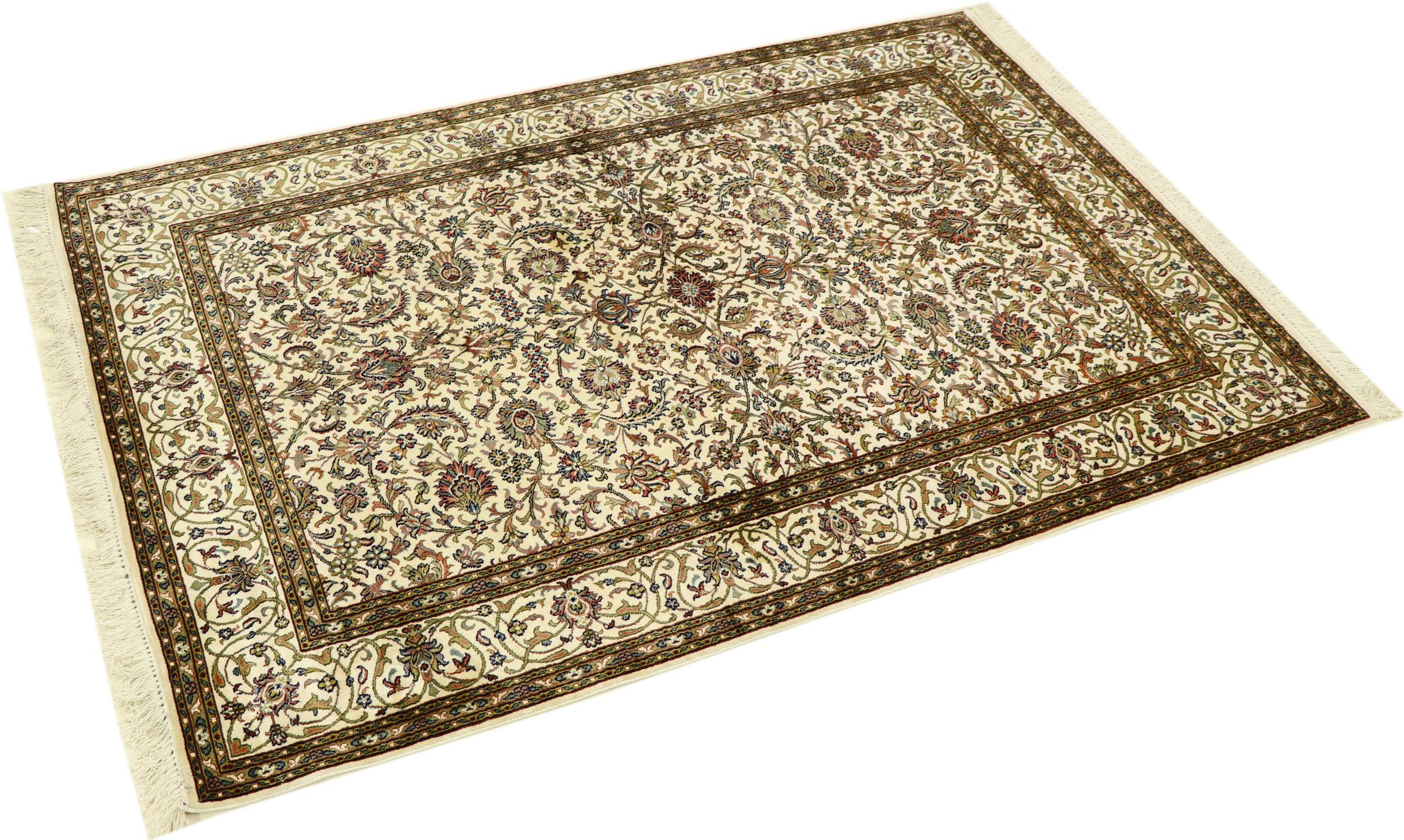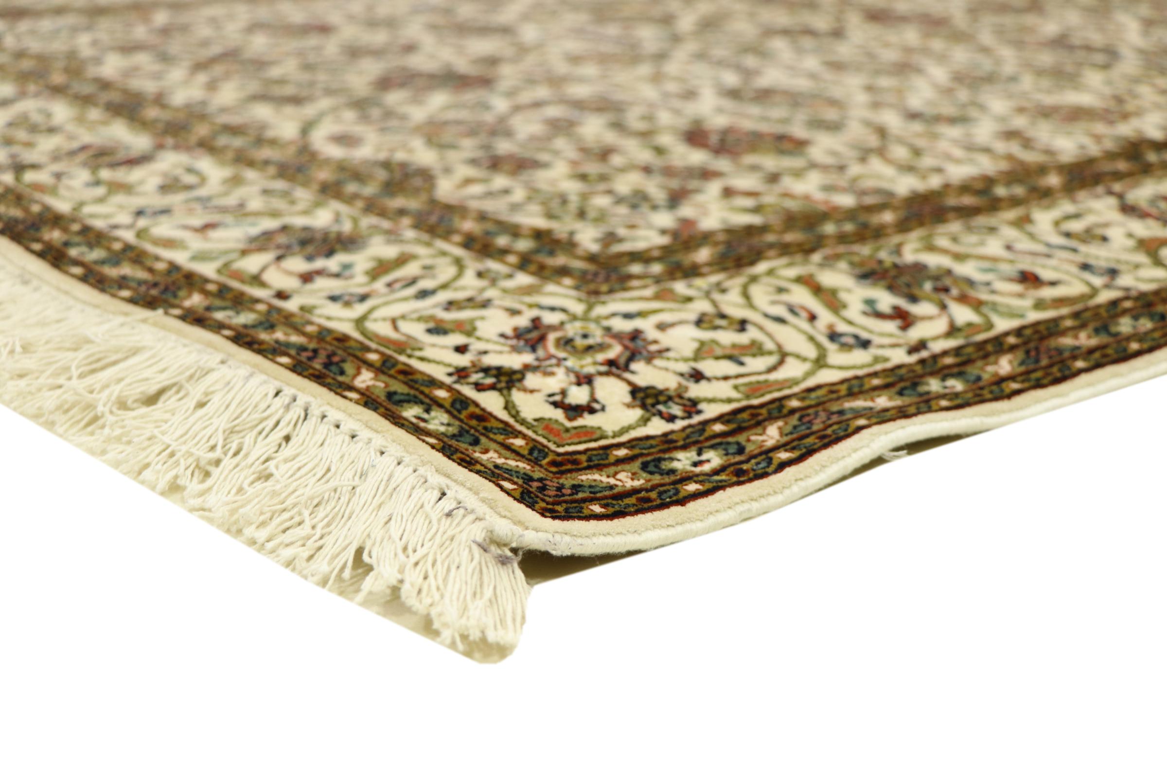 Esta alfombra de seda anudada a mano procedente de Cachemira refleja la habilidad de los tejedores de alfombras indios. No sólo está hecha de seda pura, sino que su densidad de nudos es tan fina que sólo tejedores muy experimentados pueden crear una obra así. La fina seda natural es un elemento fascinante. No sólo tiene un tacto especialmente suave, sino que permite que sus colores brillen en las facetas más diversas. Dependiendo de la incidencia de la luz, salen a la luz detalles y colores completamente nuevos que seguirán impresionando durante años. Se puede contemplar una alfombra así durante horas y olvidarse del tiempo: una experiencia que no se puede capturar en una foto.