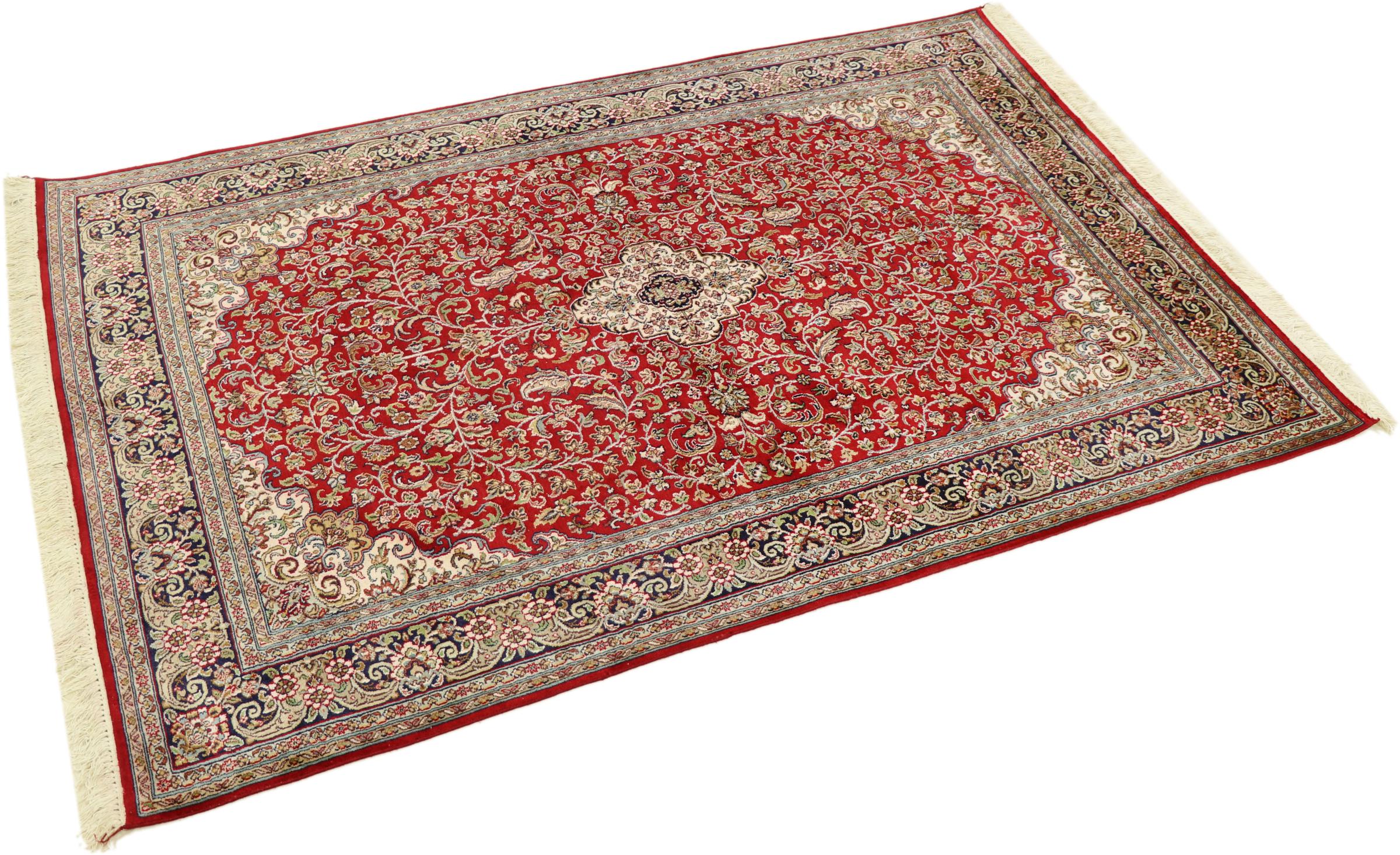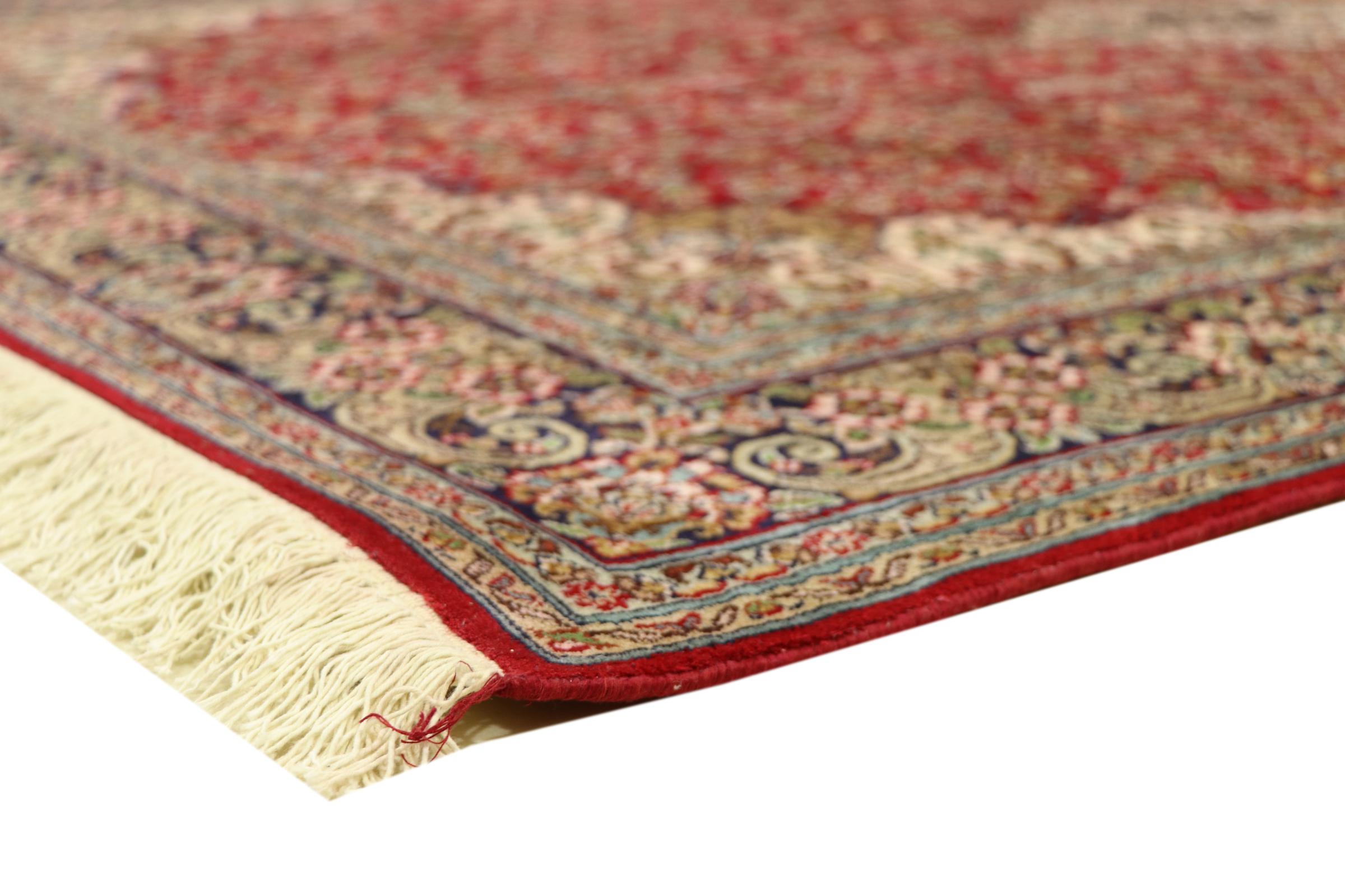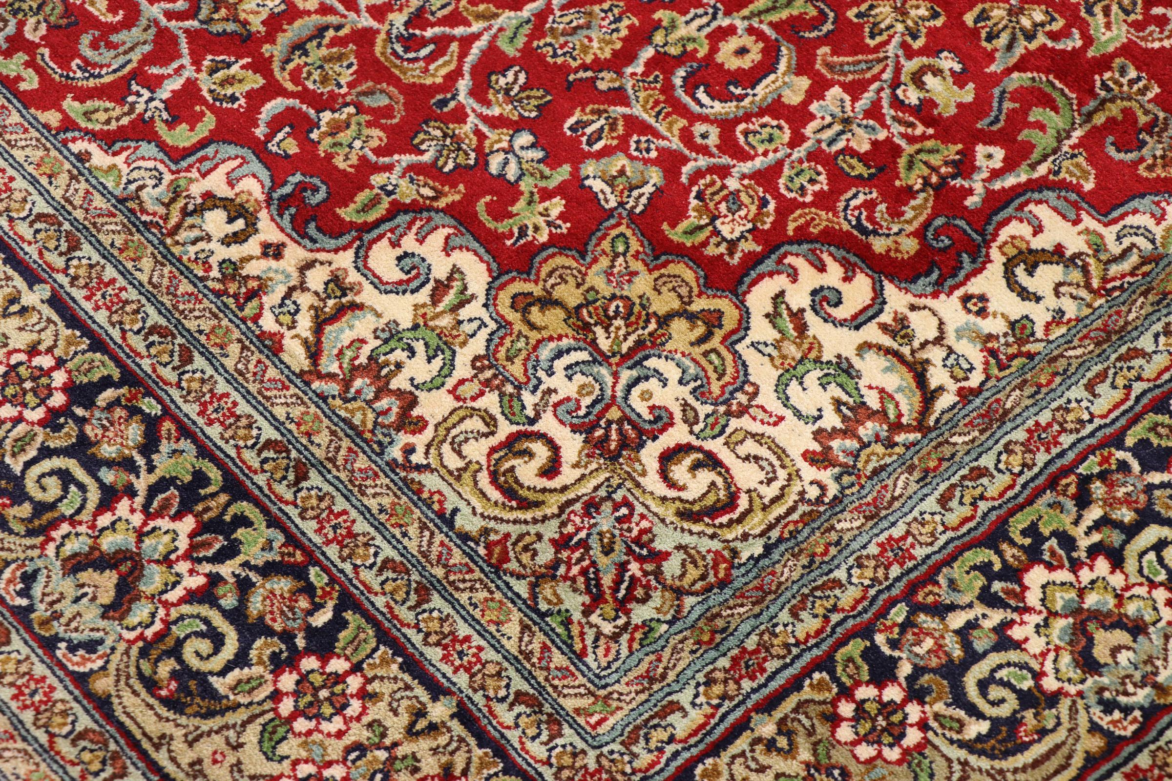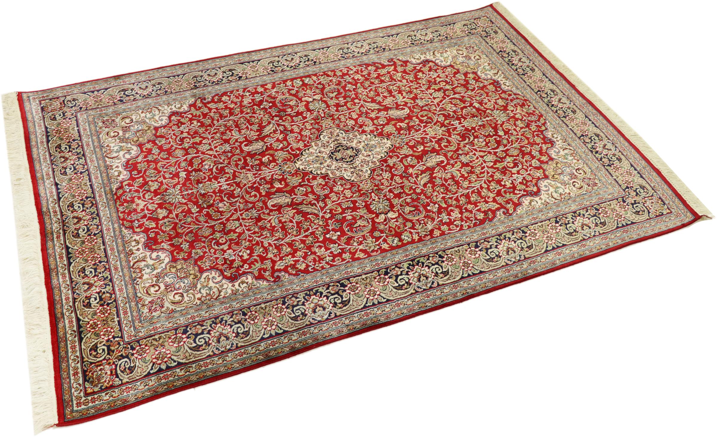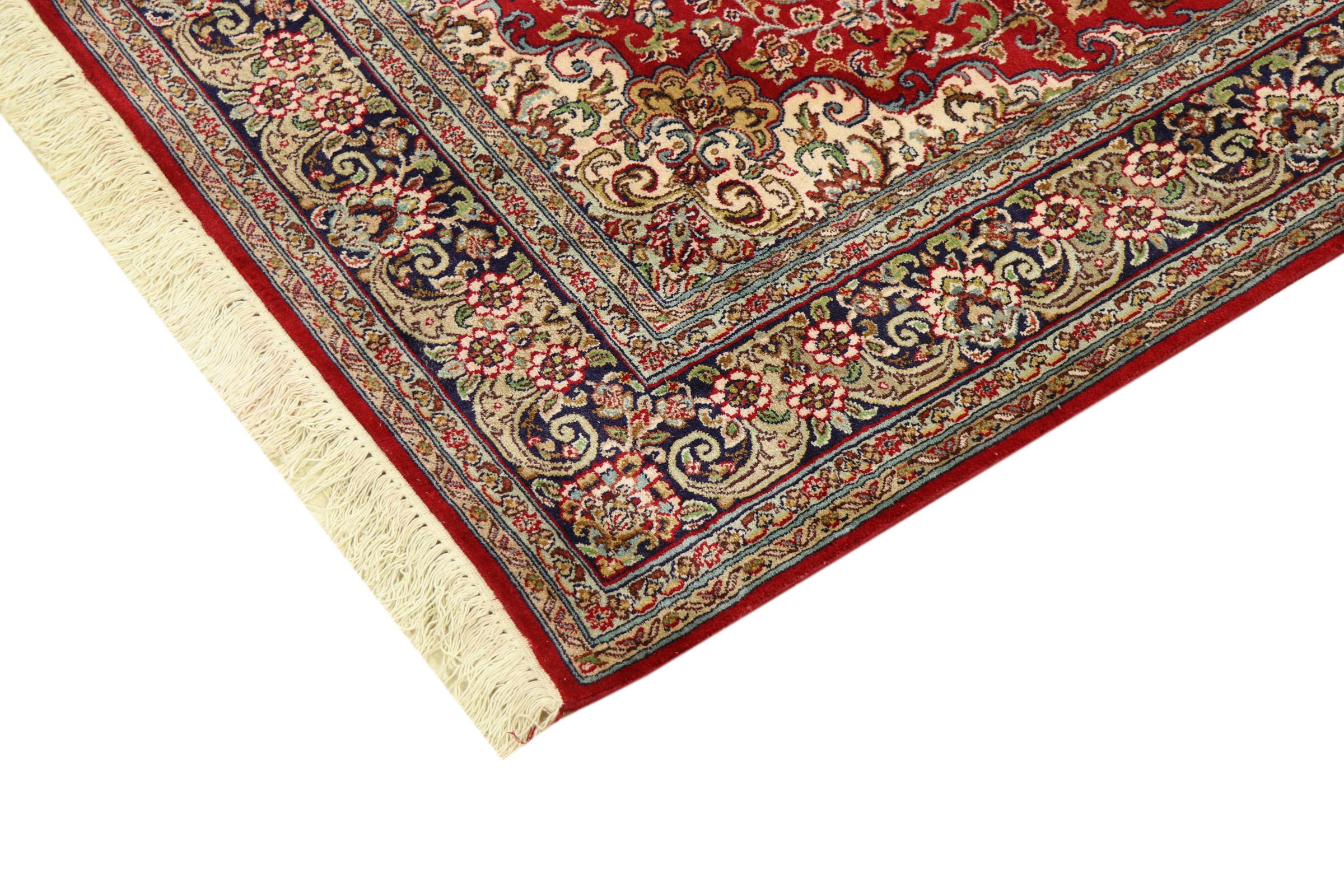 Esta alfombra de seda anudada a mano procedente de Cachemira refleja la habilidad de los tejedores de alfombras indios. No sólo está hecha de seda pura, sino que su densidad de nudos es tan fina que sólo tejedores muy experimentados pueden crear una obra así. La fina seda natural es un elemento fascinante. No sólo tiene un tacto especialmente suave, sino que permite que sus colores brillen en las facetas más diversas. Dependiendo de la incidencia de la luz, salen a la luz detalles y colores completamente nuevos que seguirán impresionando durante años. Se puede contemplar una alfombra así durante horas y olvidarse del tiempo: una experiencia que no se puede capturar en una foto.