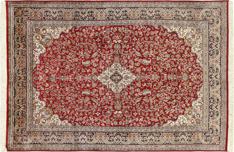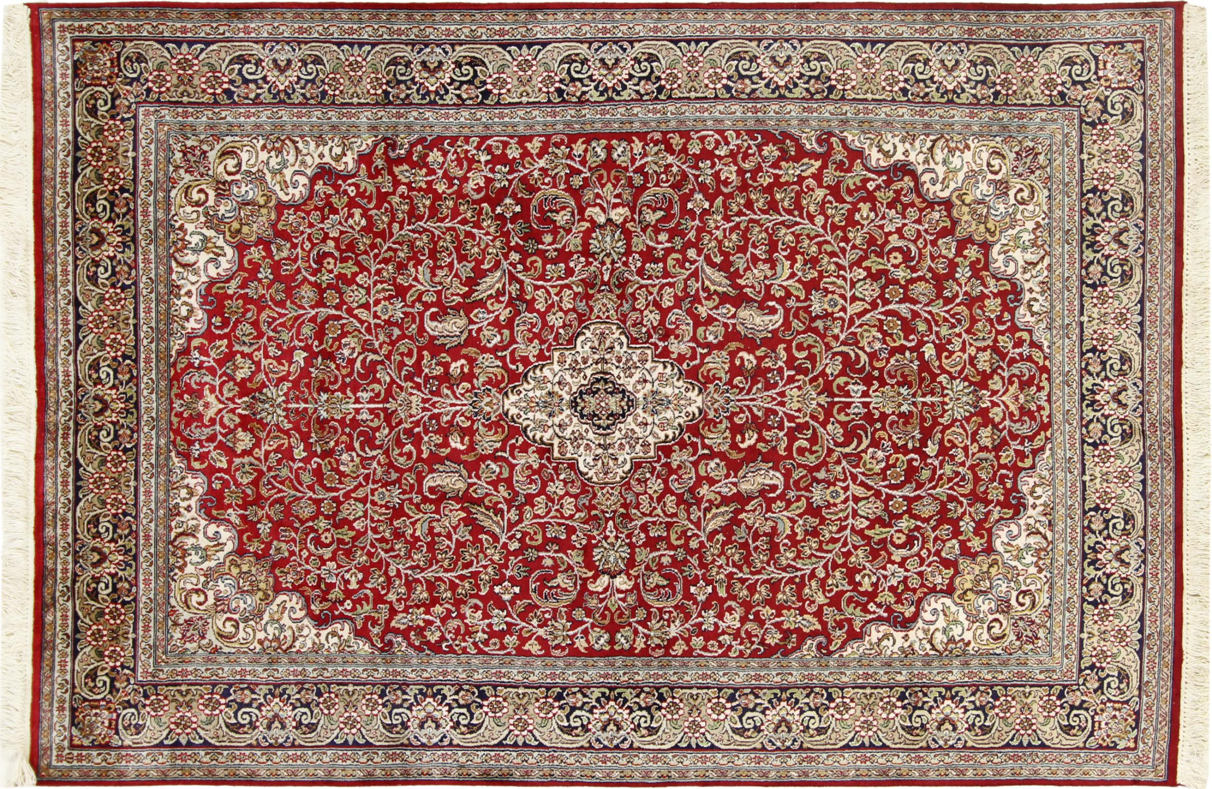 Alfombra número: 314142009266991 Tamaño: 184x123 cm Espesor: alrededor de 7 mm Nudos: 640 000 / m² Elaboración: Anudado a mano Crespón: Seda Urdimbre: Algodón Origen: India Edad: Nuevo Peso: alrededor de 7 kg Cantidad en stock: Única - Solo 1 en stock