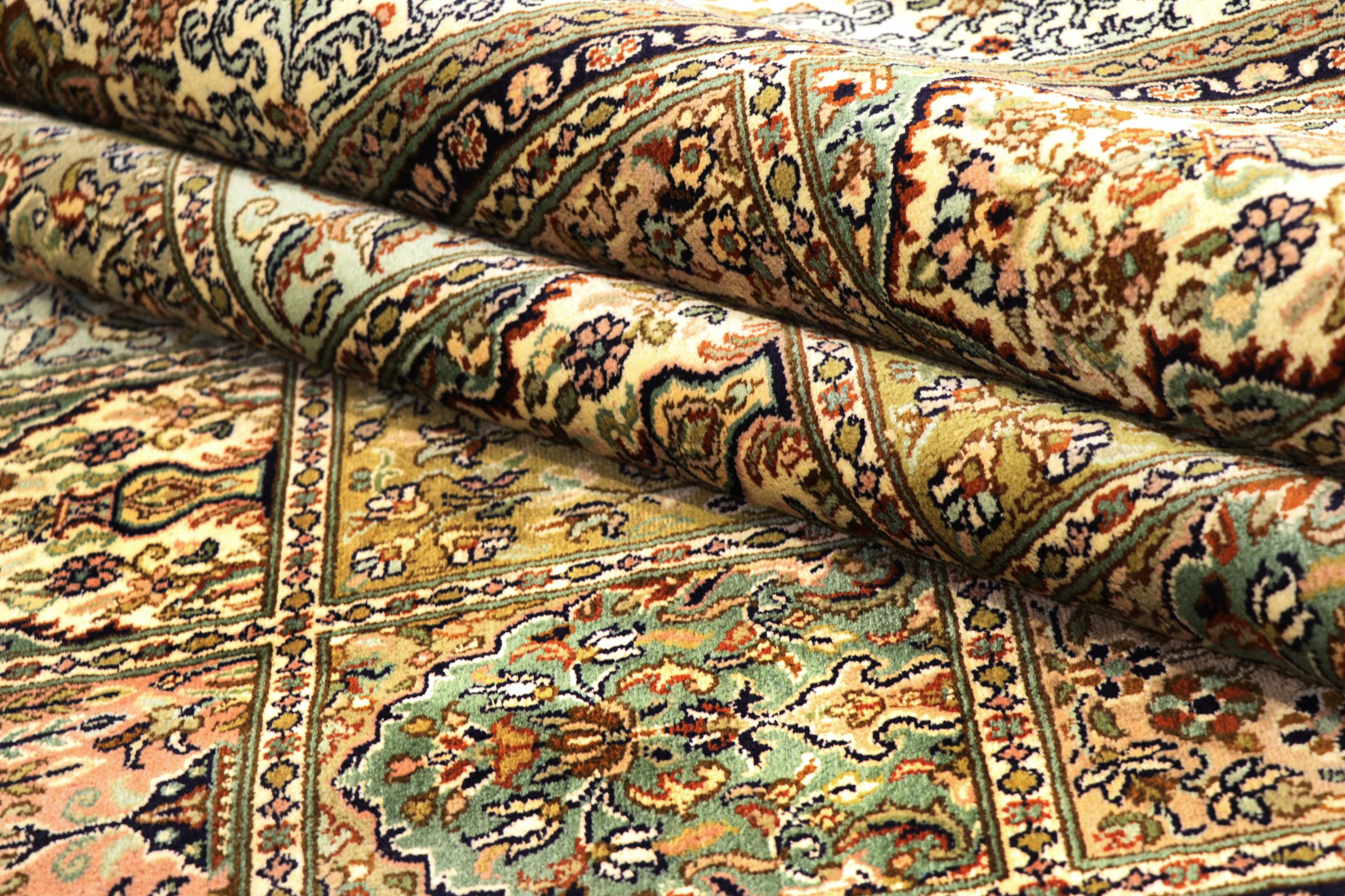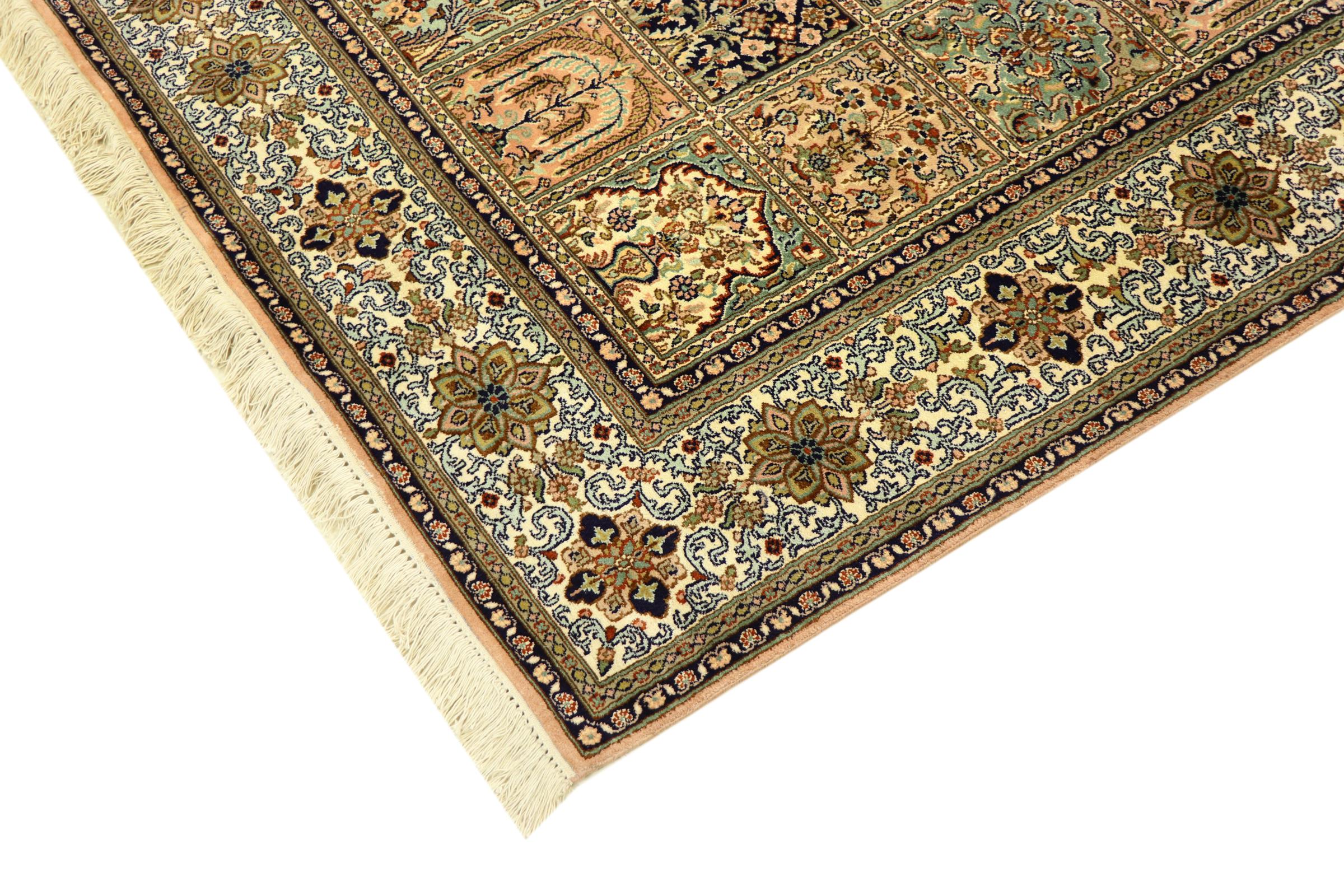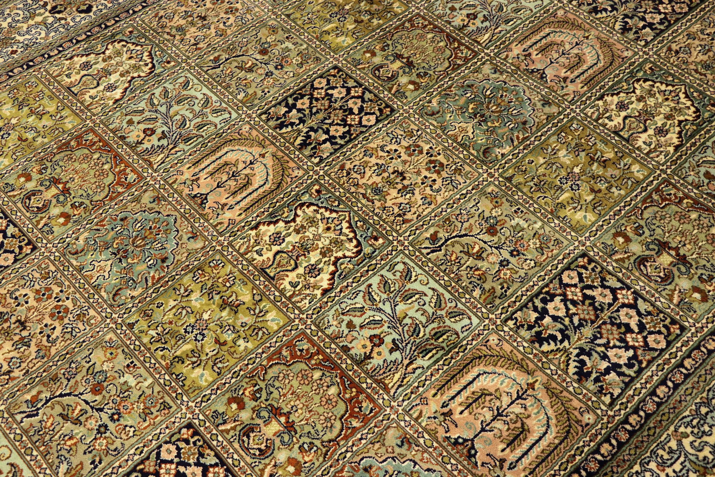 Esta alfombra de seda anudada a mano procedente de Cachemira refleja la habilidad de los tejedores de alfombras indios. No sólo está hecha de seda pura, sino que su densidad de nudos es tan fina que sólo tejedores muy experimentados pueden crear una obra así. La fina seda natural es un elemento fascinante. No sólo tiene un tacto especialmente suave, sino que permite que sus colores brillen en las facetas más diversas. Dependiendo de la incidencia de la luz, salen a la luz detalles y colores completamente nuevos que seguirán impresionando durante años. Se puede contemplar una alfombra así durante horas y olvidarse del tiempo: una experiencia que no se puede capturar en una foto.