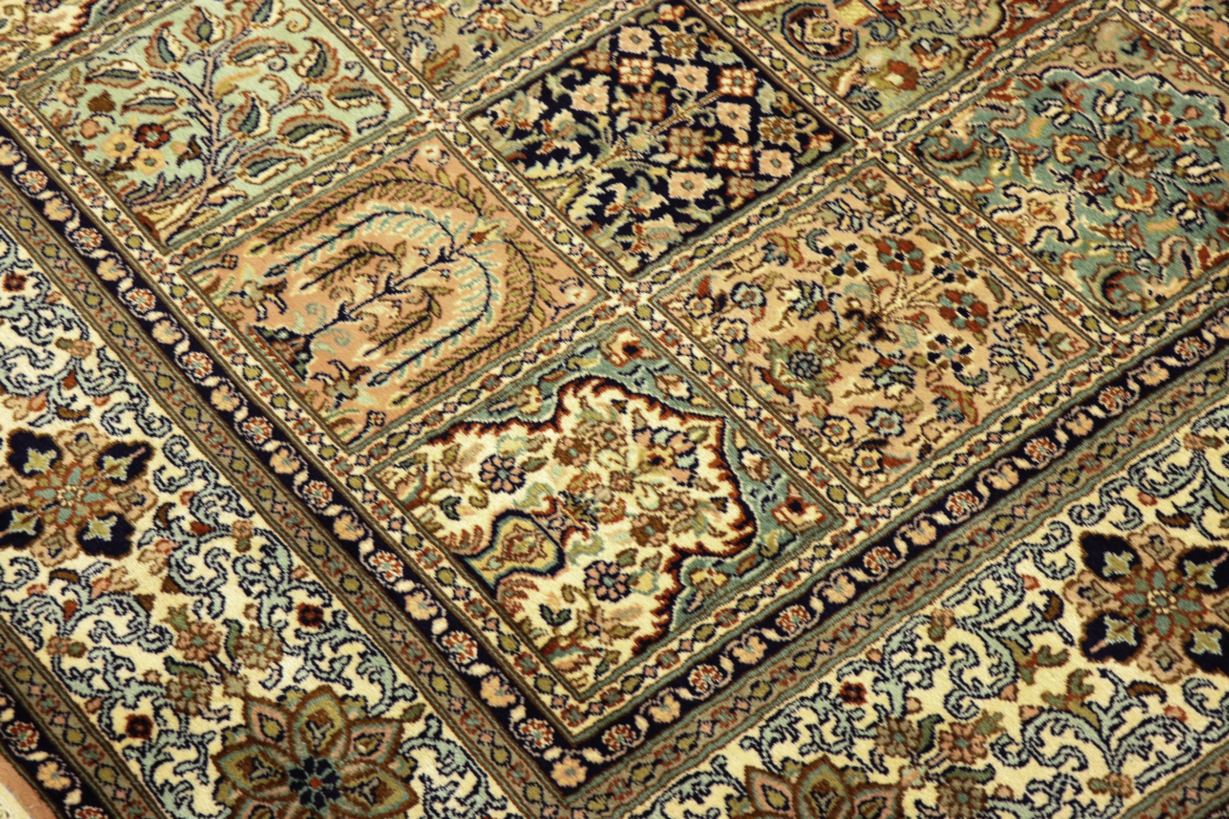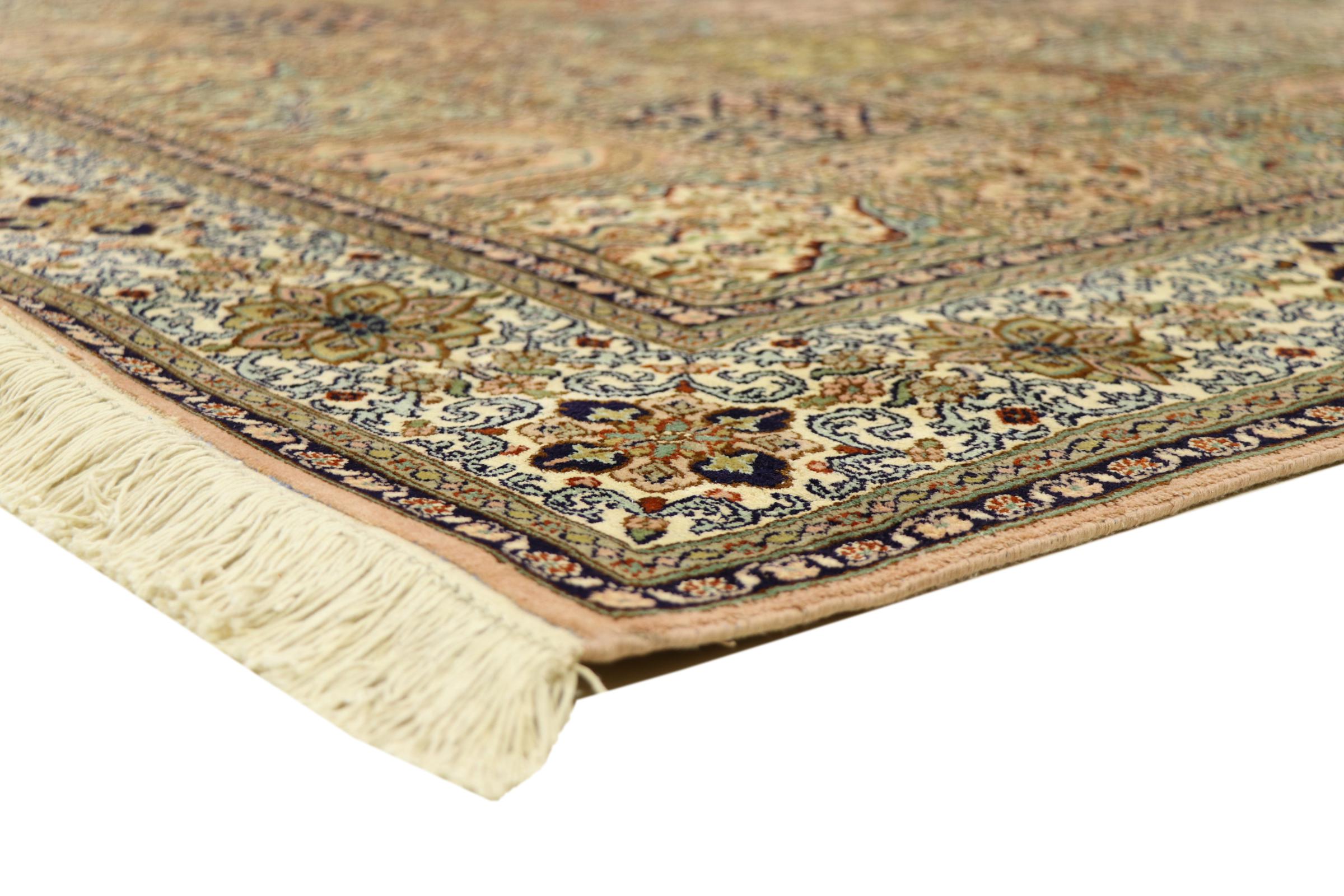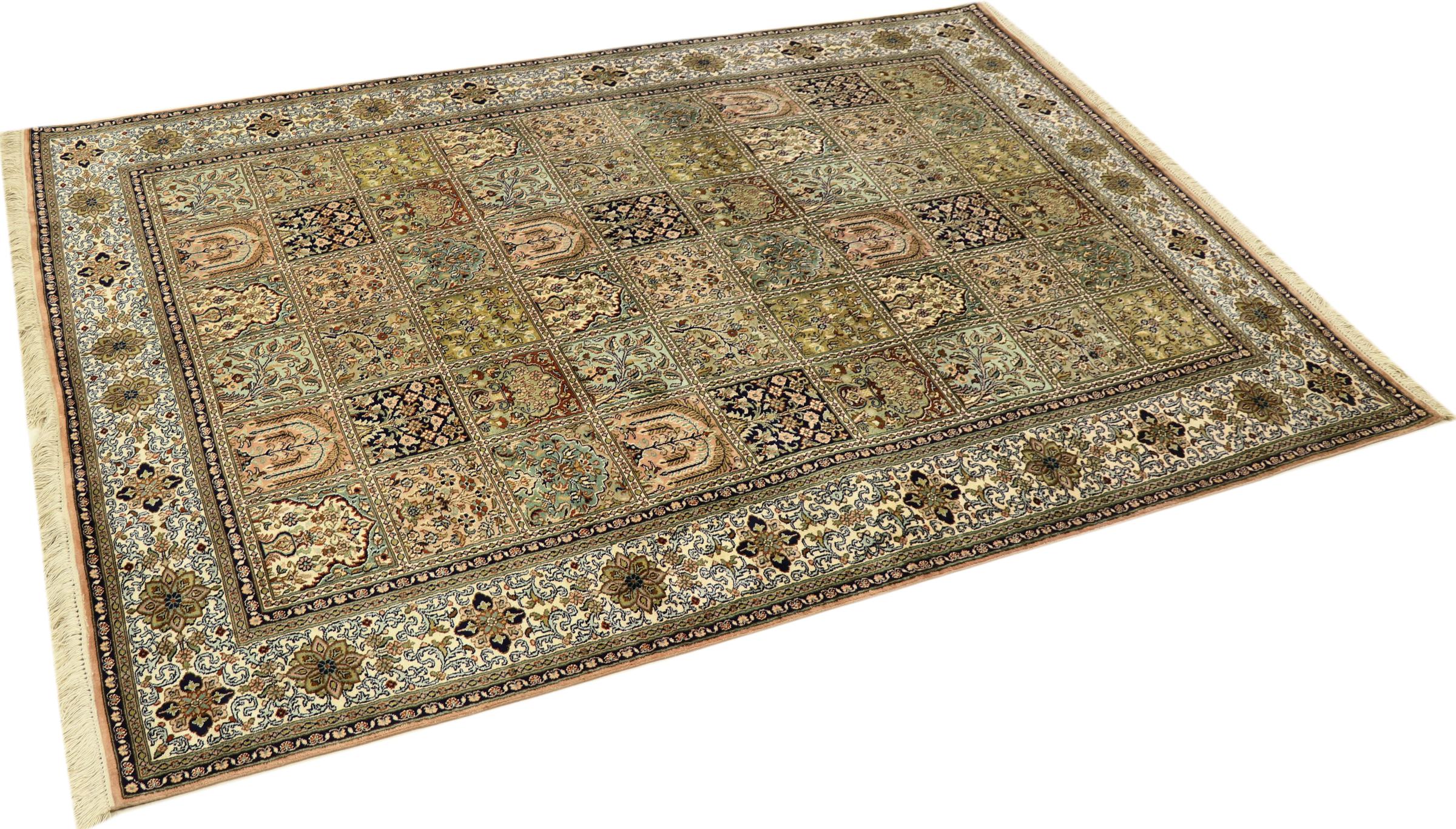 Esta alfombra de seda anudada a mano procedente de Cachemira refleja la habilidad de los tejedores de alfombras indios. No sólo está hecha de seda pura, sino que su densidad de nudos es tan fina que sólo tejedores muy experimentados pueden crear una obra así. La fina seda natural es un elemento fascinante. No sólo tiene un tacto especialmente suave, sino que permite que sus colores brillen en las facetas más diversas. Dependiendo de la incidencia de la luz, salen a la luz detalles y colores completamente nuevos que seguirán impresionando durante años. Se puede contemplar una alfombra así durante horas y olvidarse del tiempo: una experiencia que no se puede capturar en una foto.