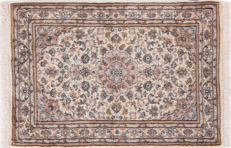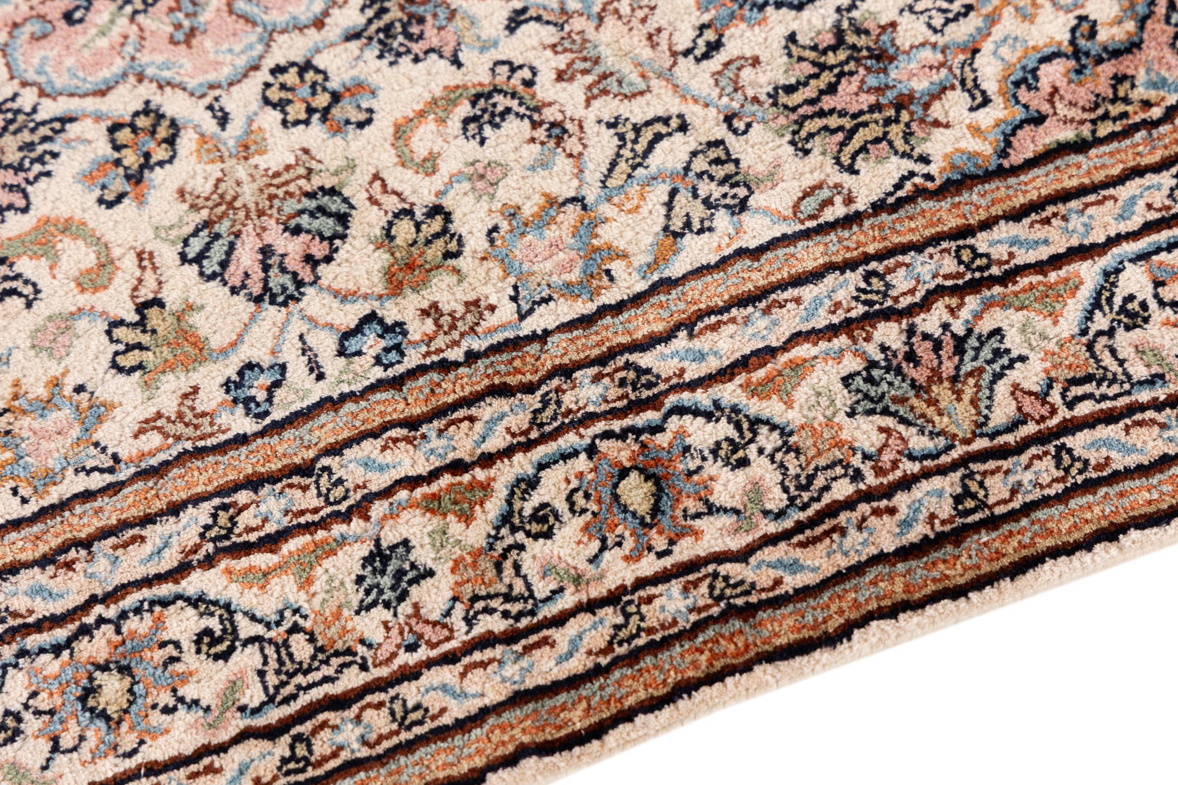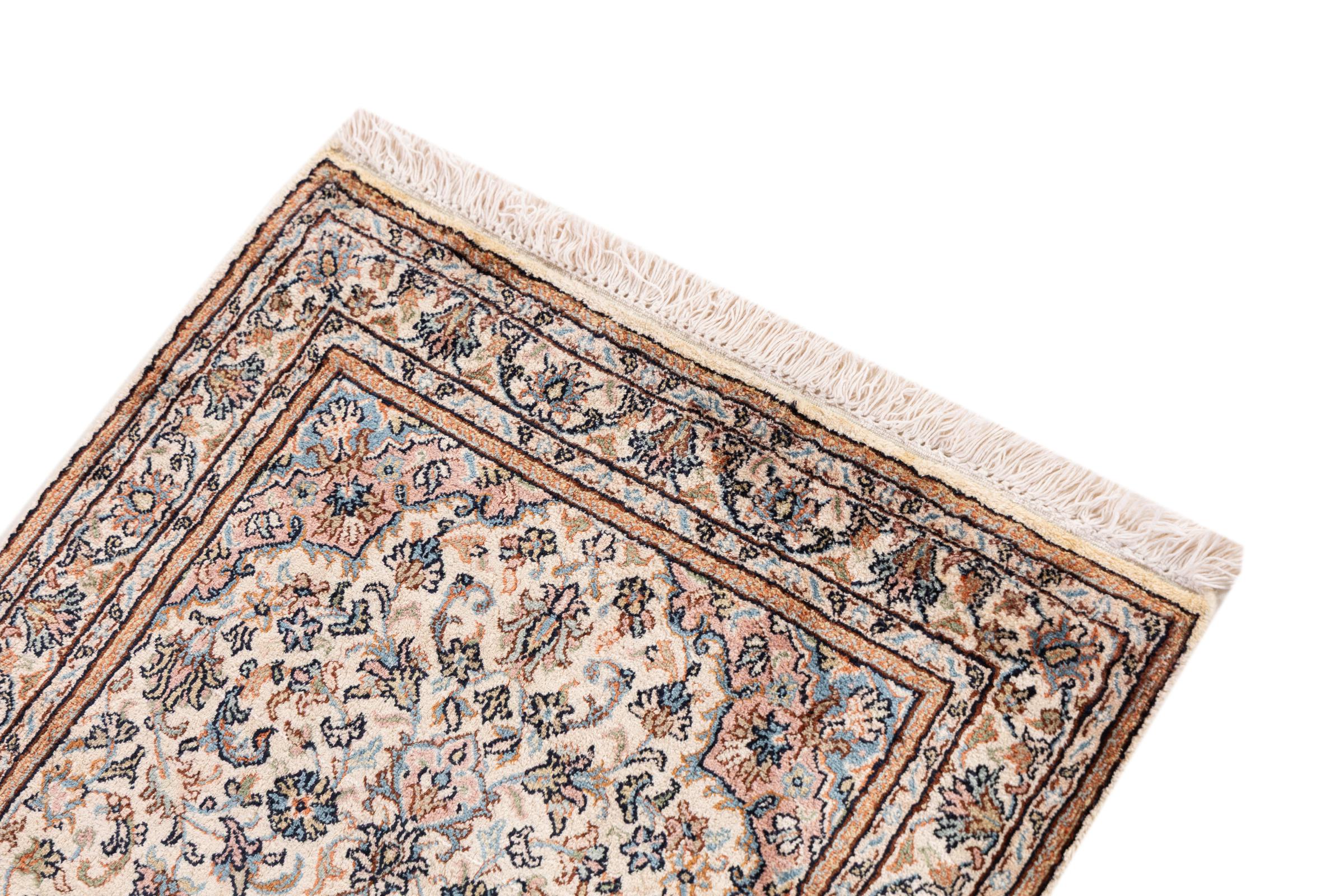 Esta alfombra de seda anudada a mano procedente de Cachemira refleja la habilidad de los tejedores de alfombras indios. No sólo está hecha de seda pura, sino que su densidad de nudos es tan fina que sólo tejedores muy experimentados pueden crear una obra así. La fina seda natural es un elemento fascinante. No sólo tiene un tacto especialmente suave, sino que permite que sus colores brillen en las facetas más diversas. Dependiendo de la incidencia de la luz, salen a la luz detalles y colores completamente nuevos que seguirán impresionando durante años. Se puede contemplar una alfombra así durante horas y olvidarse del tiempo: una experiencia que no se puede capturar en una foto.