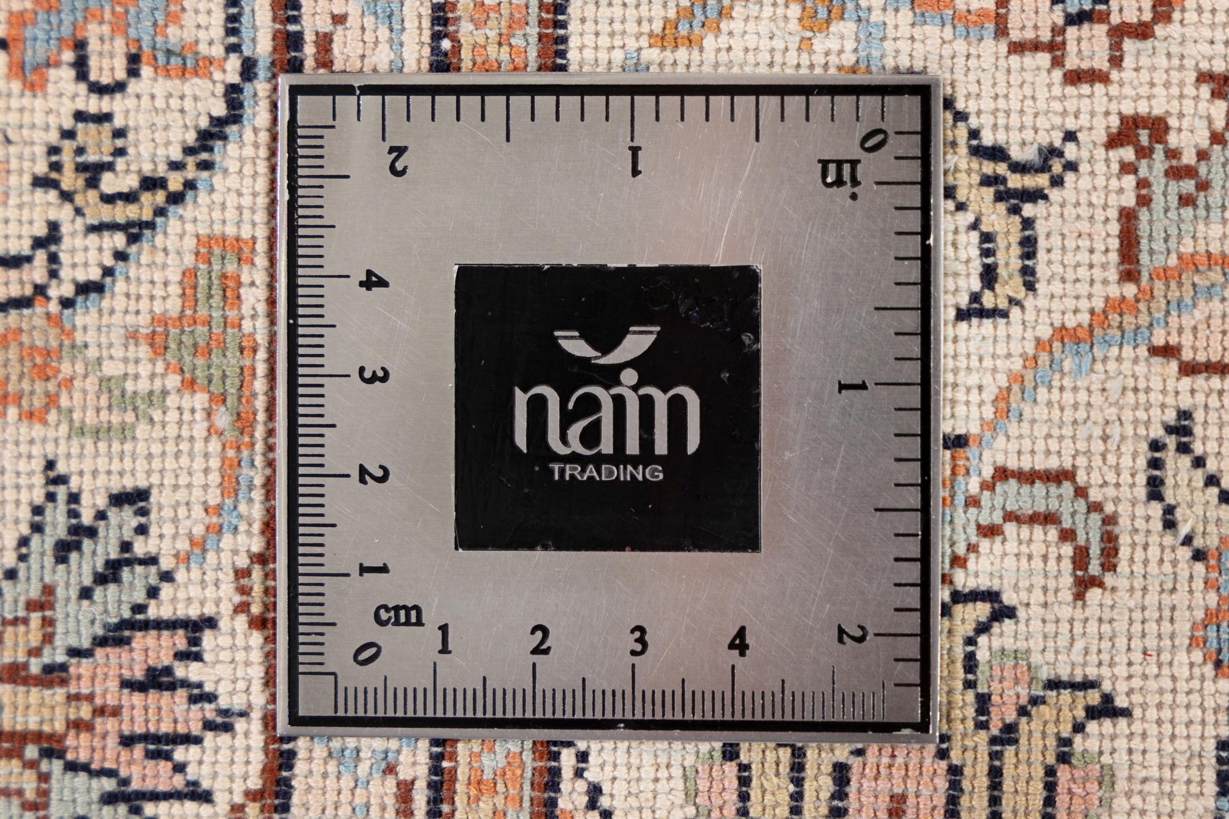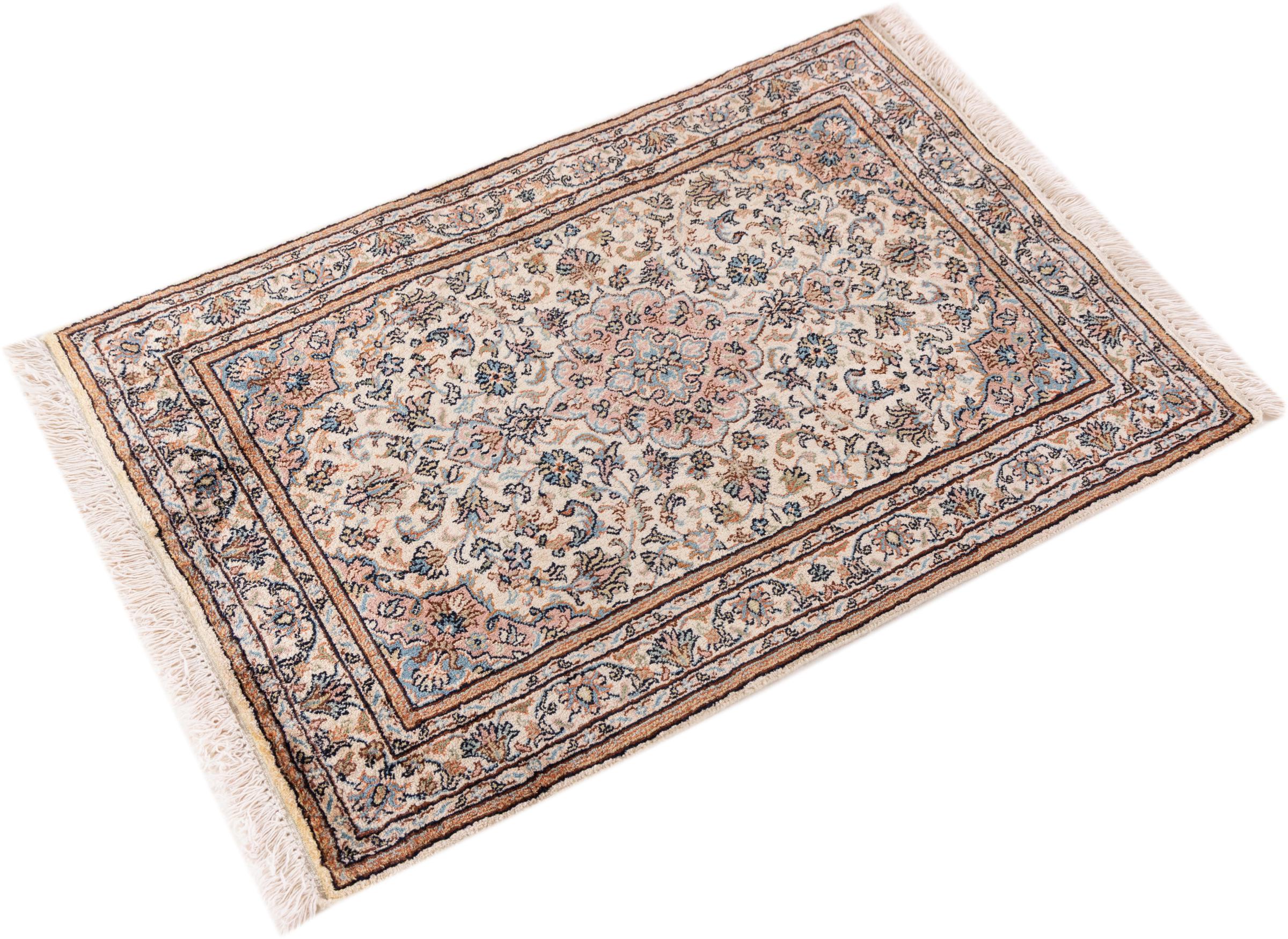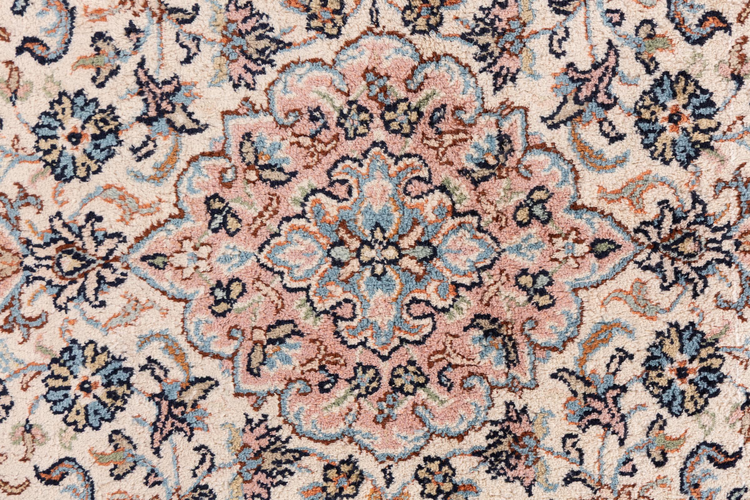 Esta alfombra de seda anudada a mano procedente de Cachemira refleja la habilidad de los tejedores de alfombras indios. No sólo está hecha de seda pura, sino que su densidad de nudos es tan fina que sólo tejedores muy experimentados pueden crear una obra así. La fina seda natural es un elemento fascinante. No sólo tiene un tacto especialmente suave, sino que permite que sus colores brillen en las facetas más diversas. Dependiendo de la incidencia de la luz, salen a la luz detalles y colores completamente nuevos que seguirán impresionando durante años. Se puede contemplar una alfombra así durante horas y olvidarse del tiempo: una experiencia que no se puede capturar en una foto.