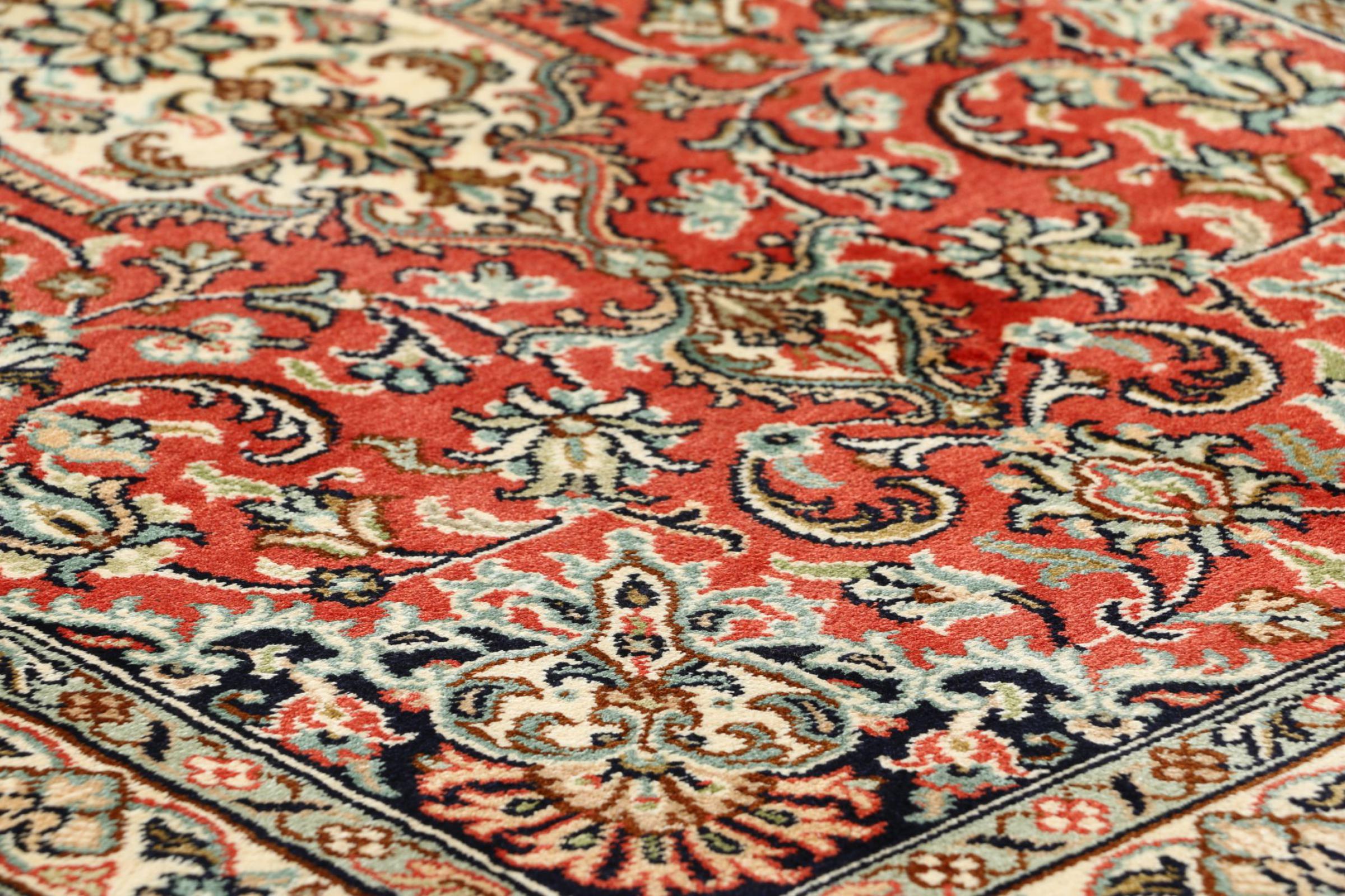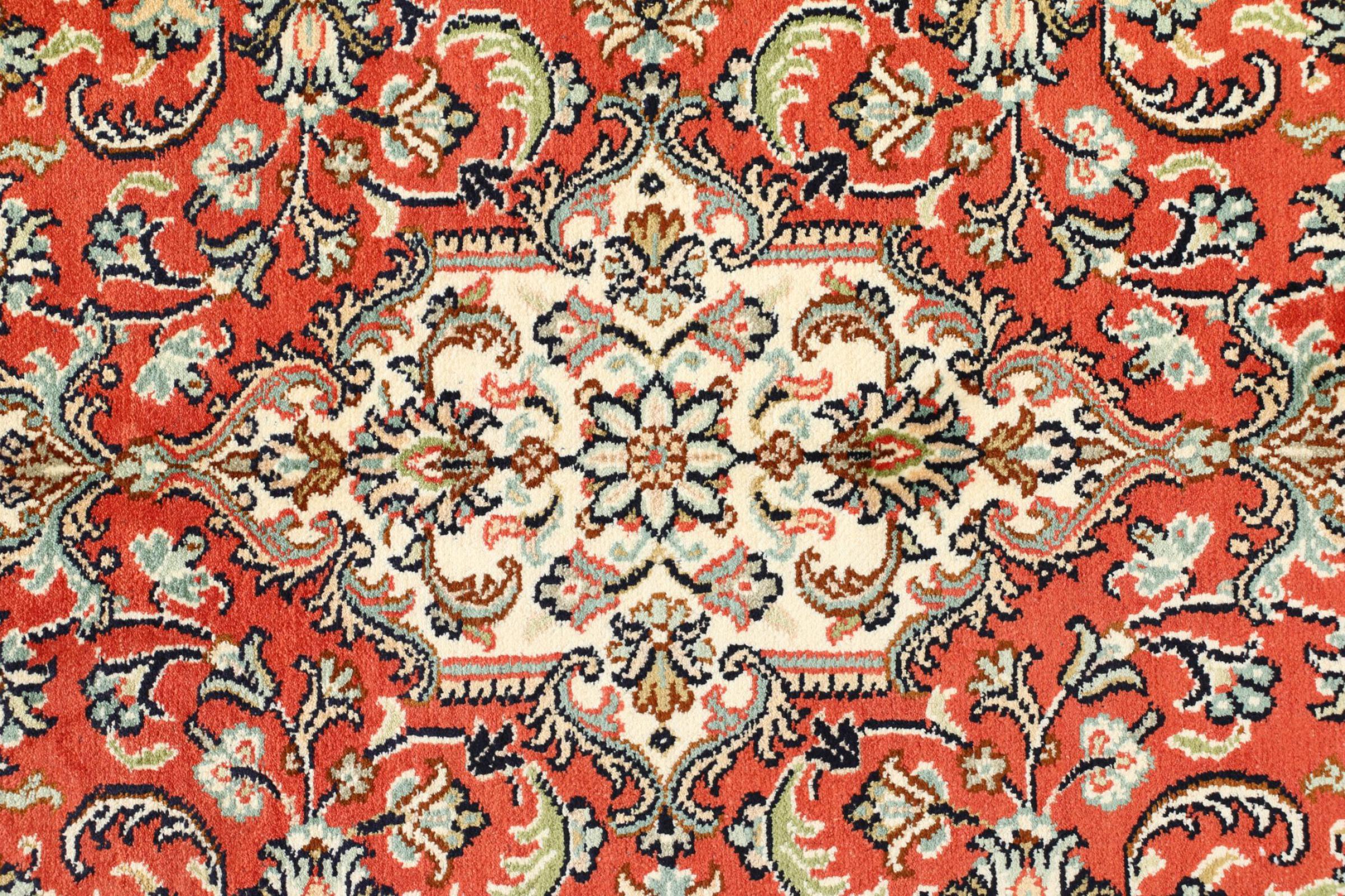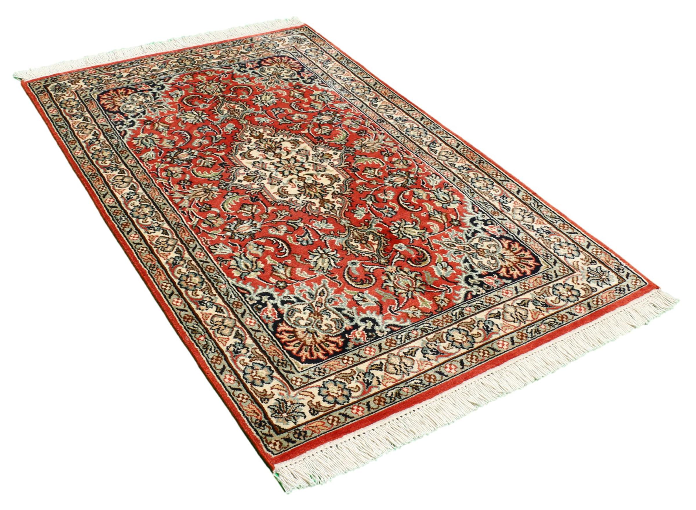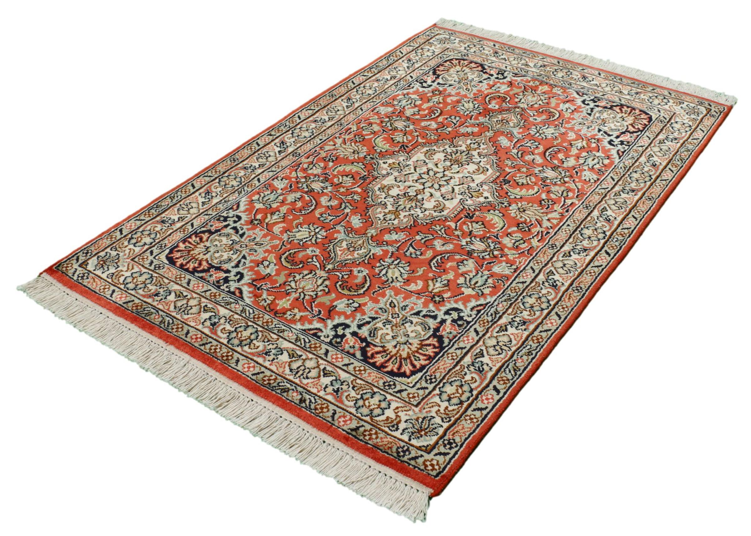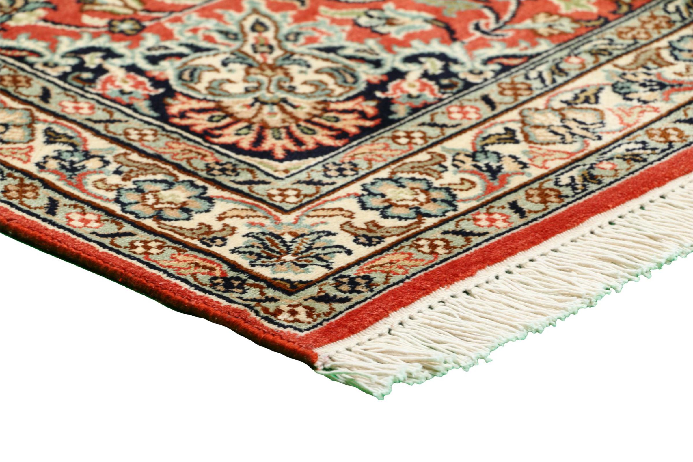 Esta alfombra de seda anudada a mano procedente de Cachemira refleja la habilidad de los tejedores de alfombras indios. No sólo está hecha de seda pura, sino que su densidad de nudos es tan fina que sólo tejedores muy experimentados pueden crear una obra así. La fina seda natural es un elemento fascinante. No sólo tiene un tacto especialmente suave, sino que permite que sus colores brillen en las facetas más diversas. Dependiendo de la incidencia de la luz, salen a la luz detalles y colores completamente nuevos que seguirán impresionando durante años. Se puede contemplar una alfombra así durante horas y olvidarse del tiempo: una experiencia que no se puede capturar en una foto.