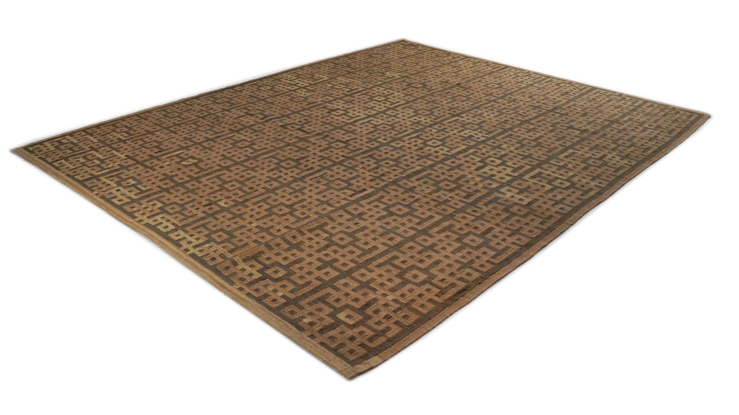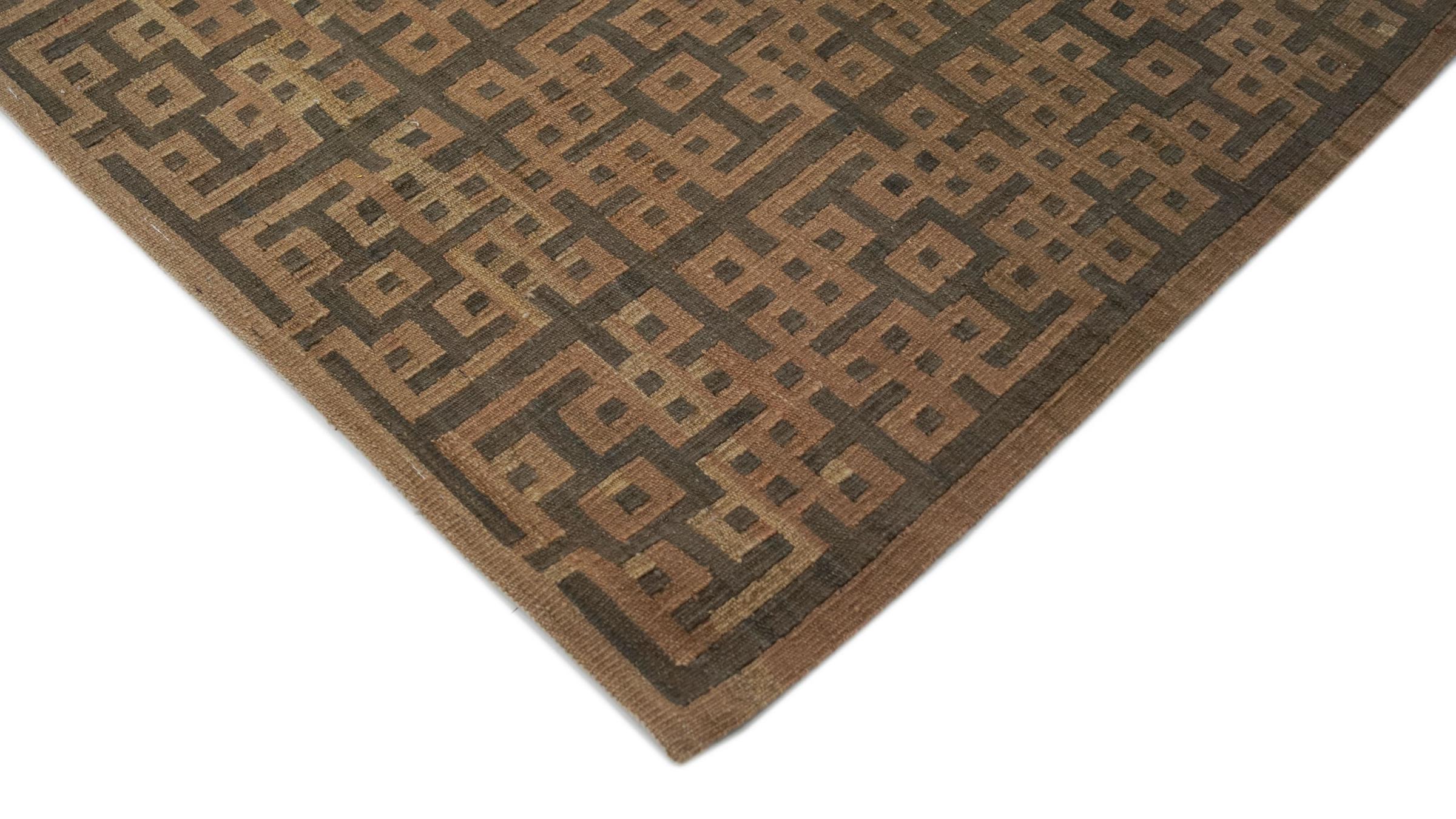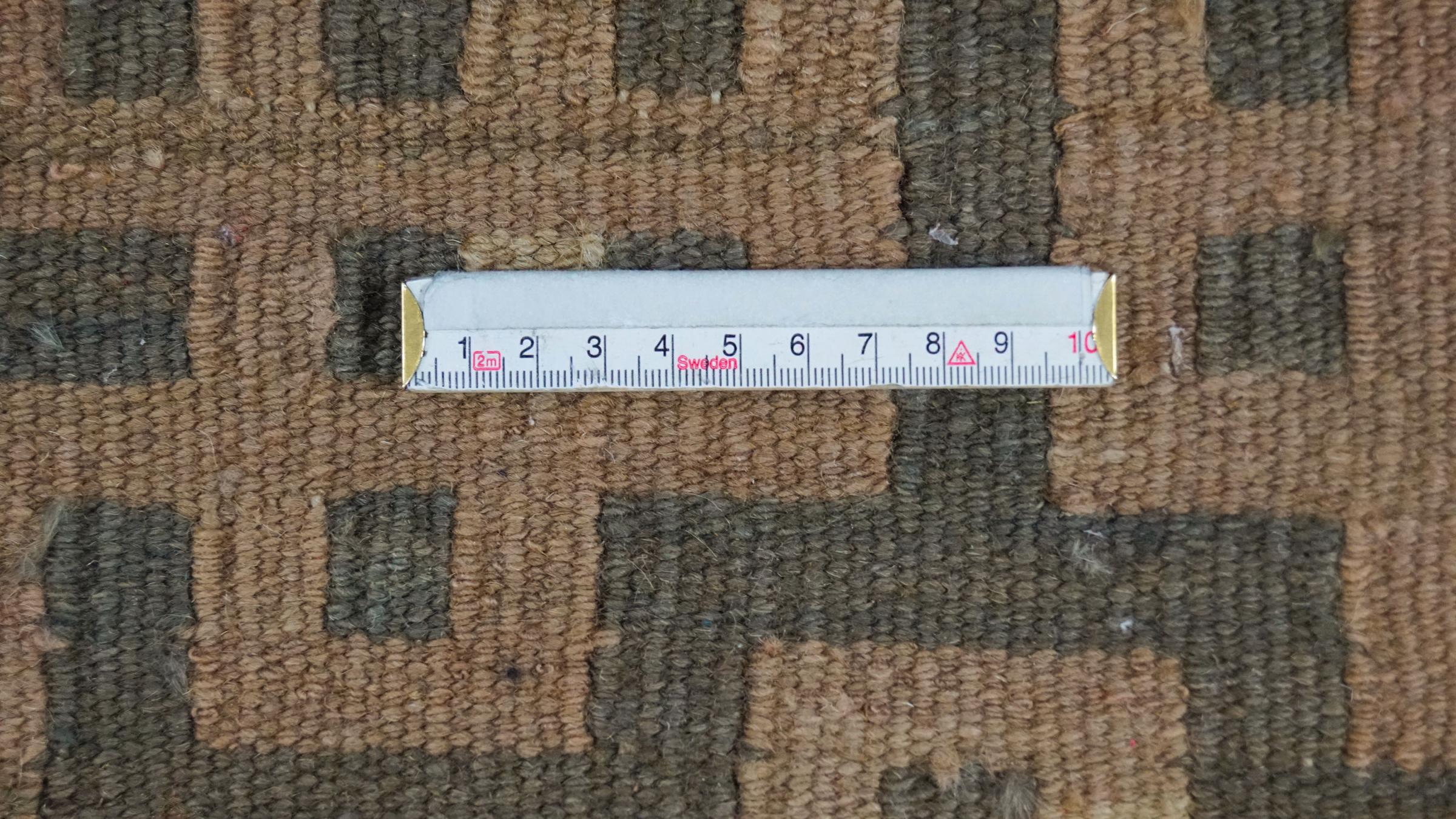 Esta alfombra fue hecha a mano en un telar como un tejido plano. Tejido plano es el término utilizado para describir las alfombras que no tienen pelo. Como el nombre promete, estas alfombras están tejidas y no anudadas. Esto resulta en una alfombra plana con una superficie estructurada. Los tejidos planos no son tan suaves y normalmente más delgados que las alfombras anudadas. Al mismo tiempo, su fabricación es mucho menos compleja y por lo general se pueden disponer por ambos lados (frontal y posterior). Sus patrones suelen ser geométricos, lo cual está determinado por el tejido.