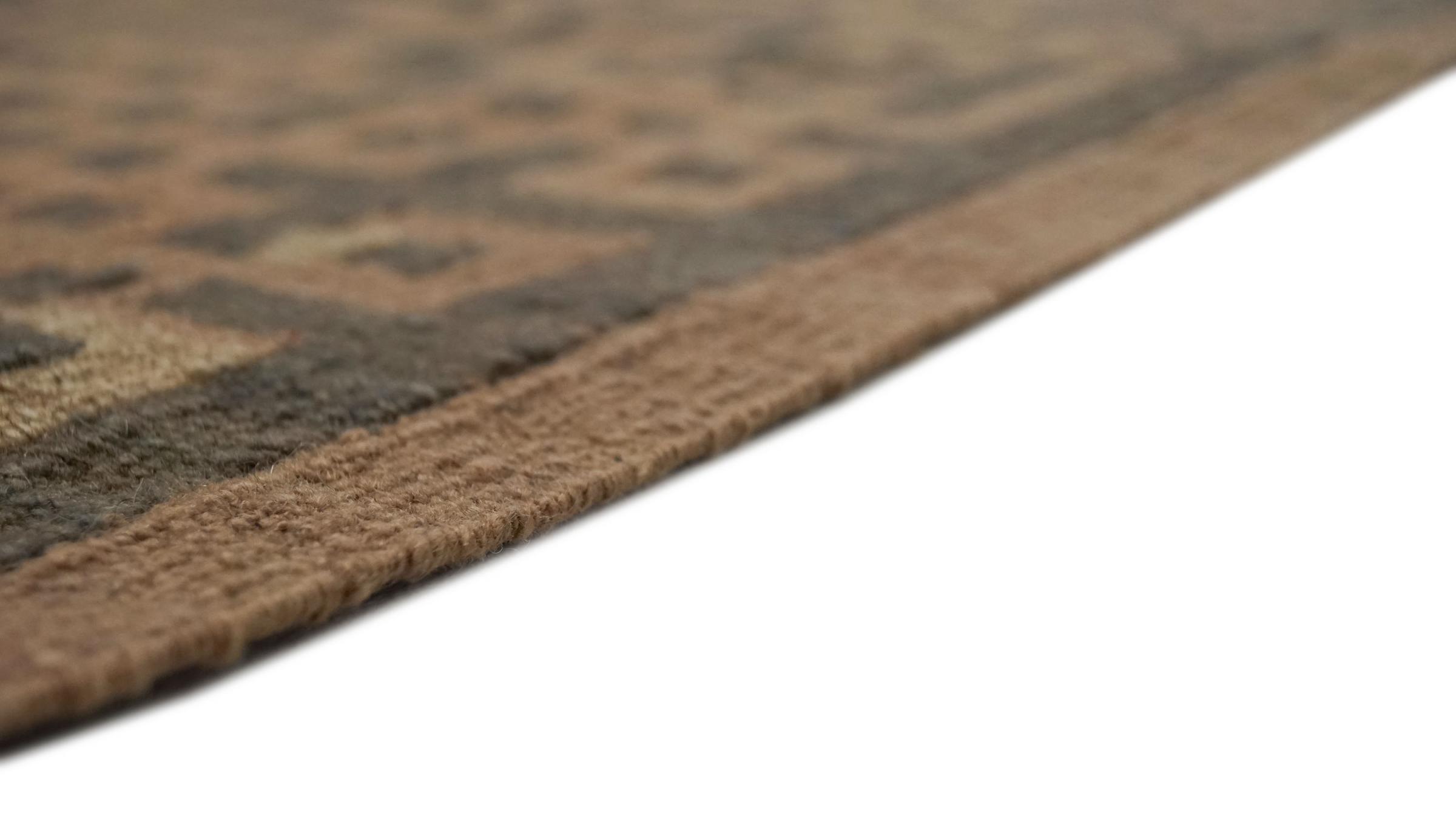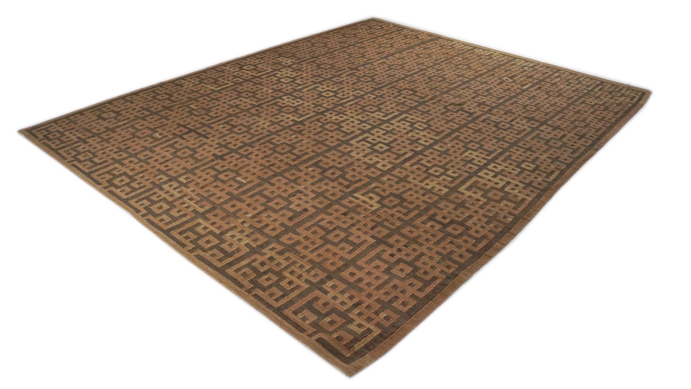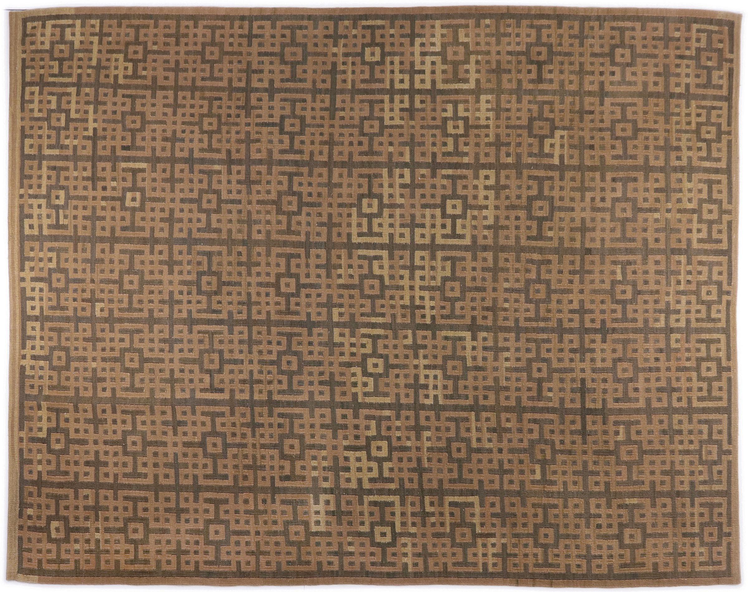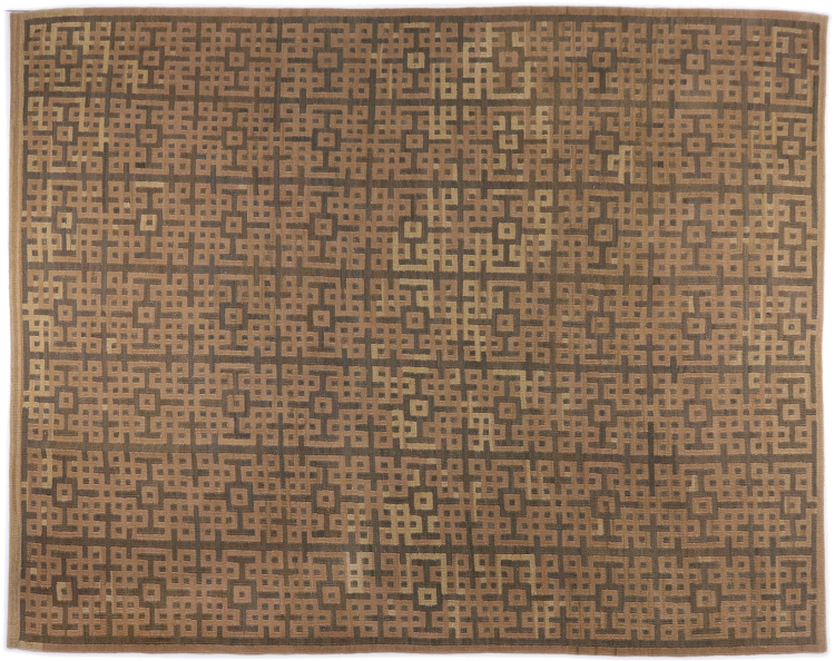 Esta alfombra fue hecha a mano en un telar como un tejido plano. Tejido plano es el término utilizado para describir las alfombras que no tienen pelo. Como el nombre promete, estas alfombras están tejidas y no anudadas. Esto resulta en una alfombra plana con una superficie estructurada. Los tejidos planos no son tan suaves y normalmente más delgados que las alfombras anudadas. Al mismo tiempo, su fabricación es mucho menos compleja y por lo general se pueden disponer por ambos lados (frontal y posterior). Sus patrones suelen ser geométricos, lo cual está determinado por el tejido.
