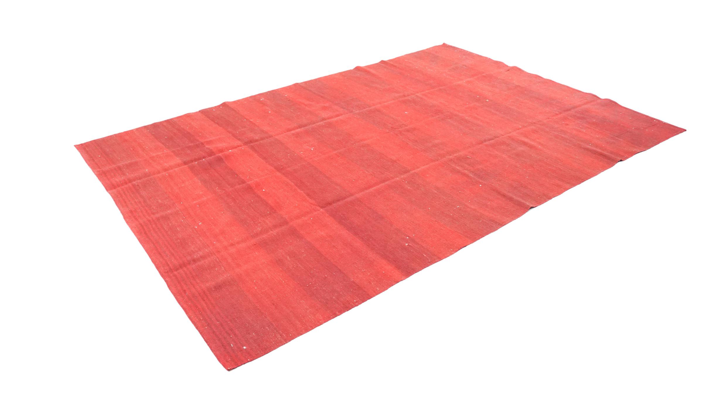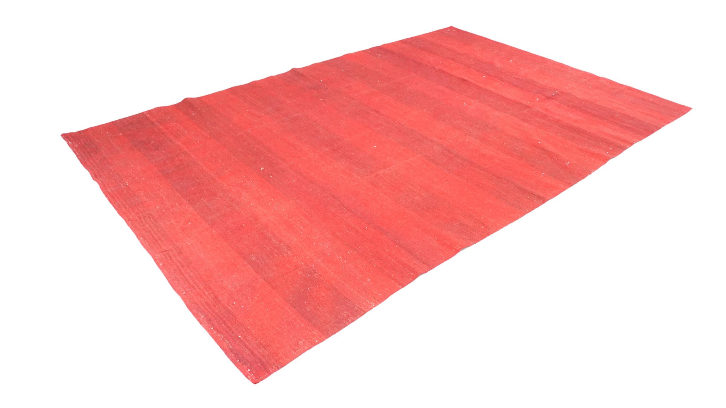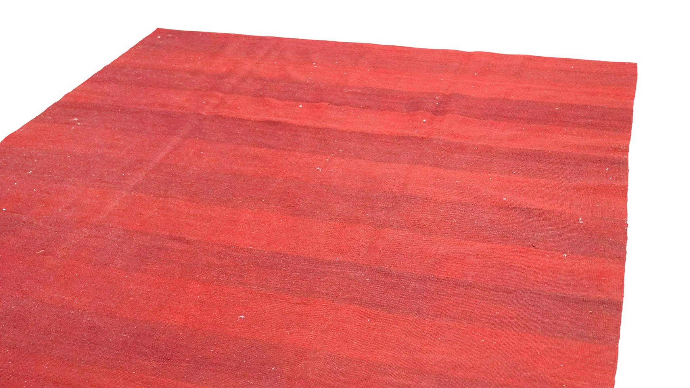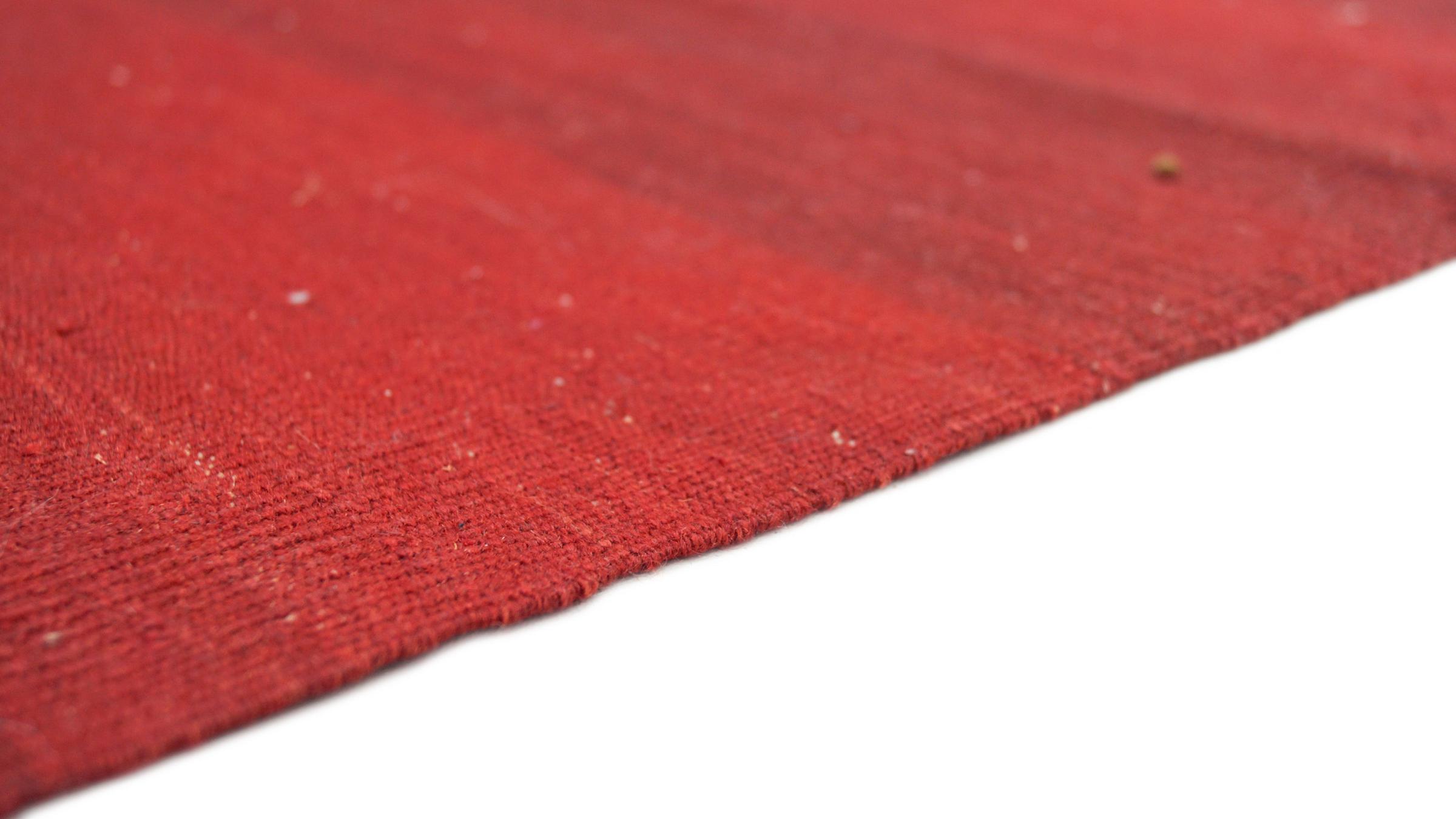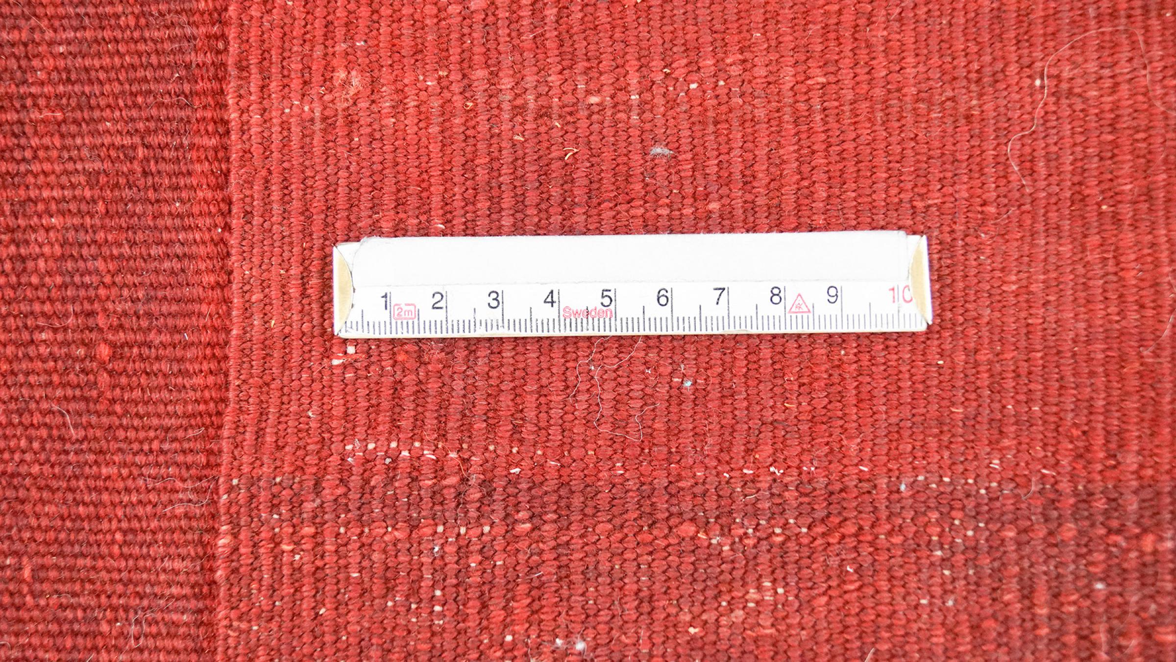 Esta alfombra fue hecha a mano en un telar como un tejido plano. Tejido plano es el término utilizado para describir las alfombras que no tienen pelo. Como el nombre promete, estas alfombras están tejidas y no anudadas. Esto resulta en una alfombra plana con una superficie estructurada. Los tejidos planos no son tan suaves y normalmente más delgados que las alfombras anudadas. Al mismo tiempo, su fabricación es mucho menos compleja y por lo general se pueden disponer por ambos lados (frontal y posterior). Sus patrones suelen ser geométricos, lo cual está determinado por el tejido.