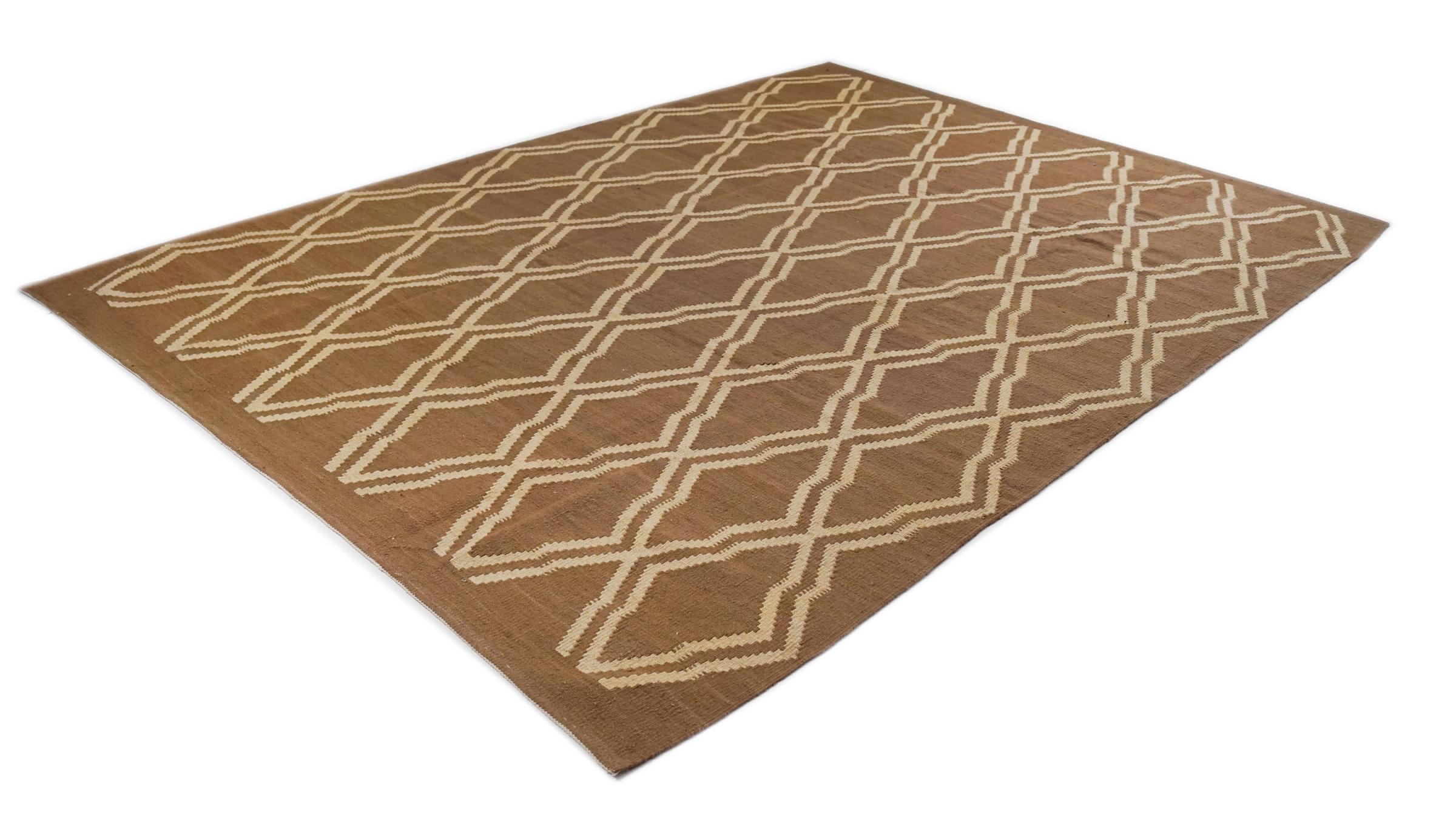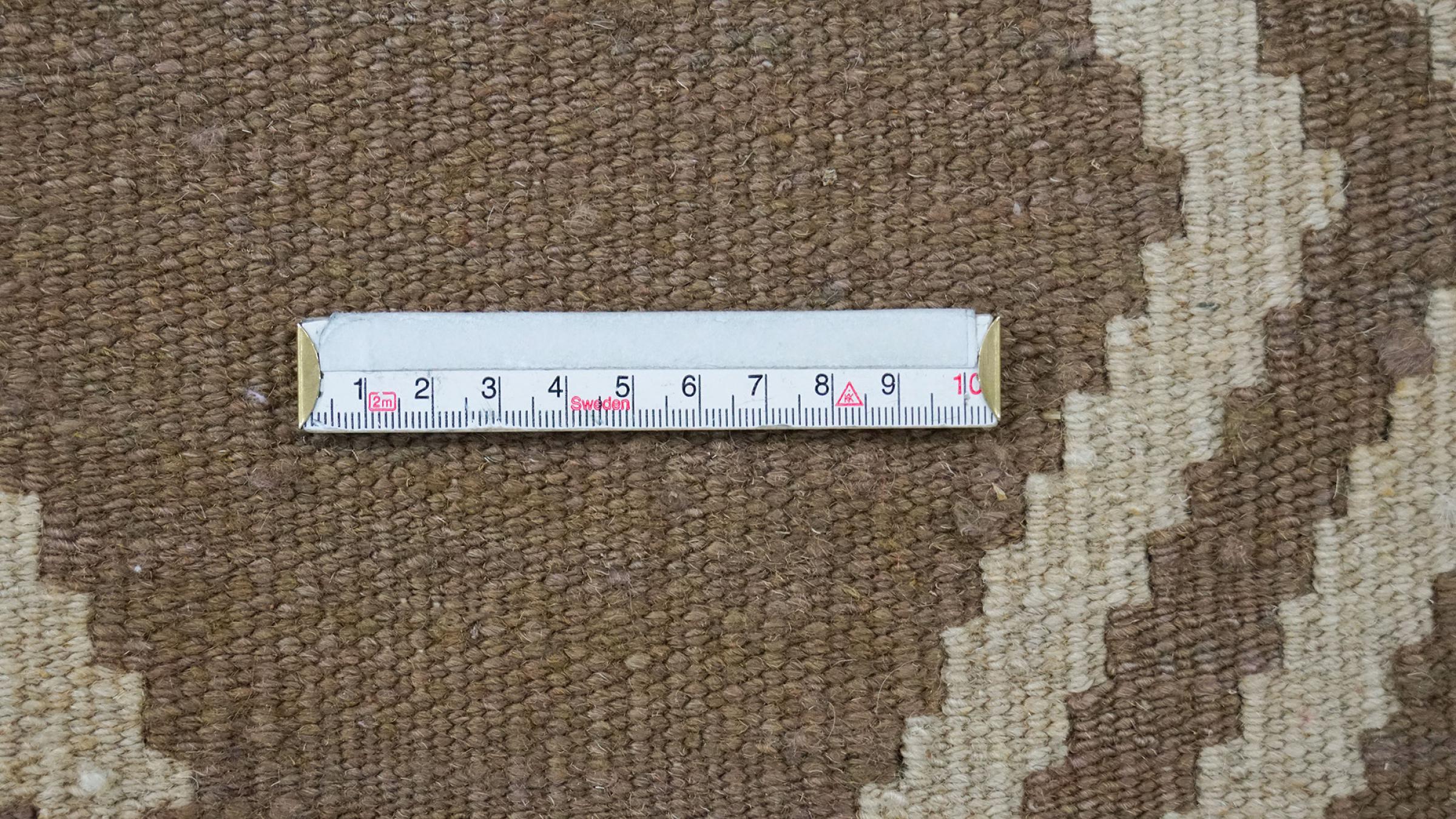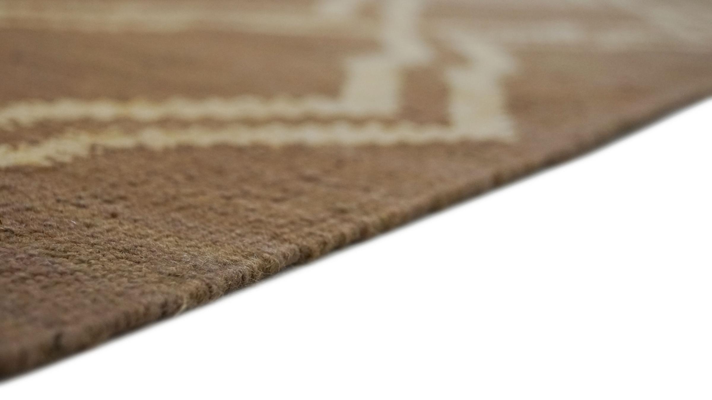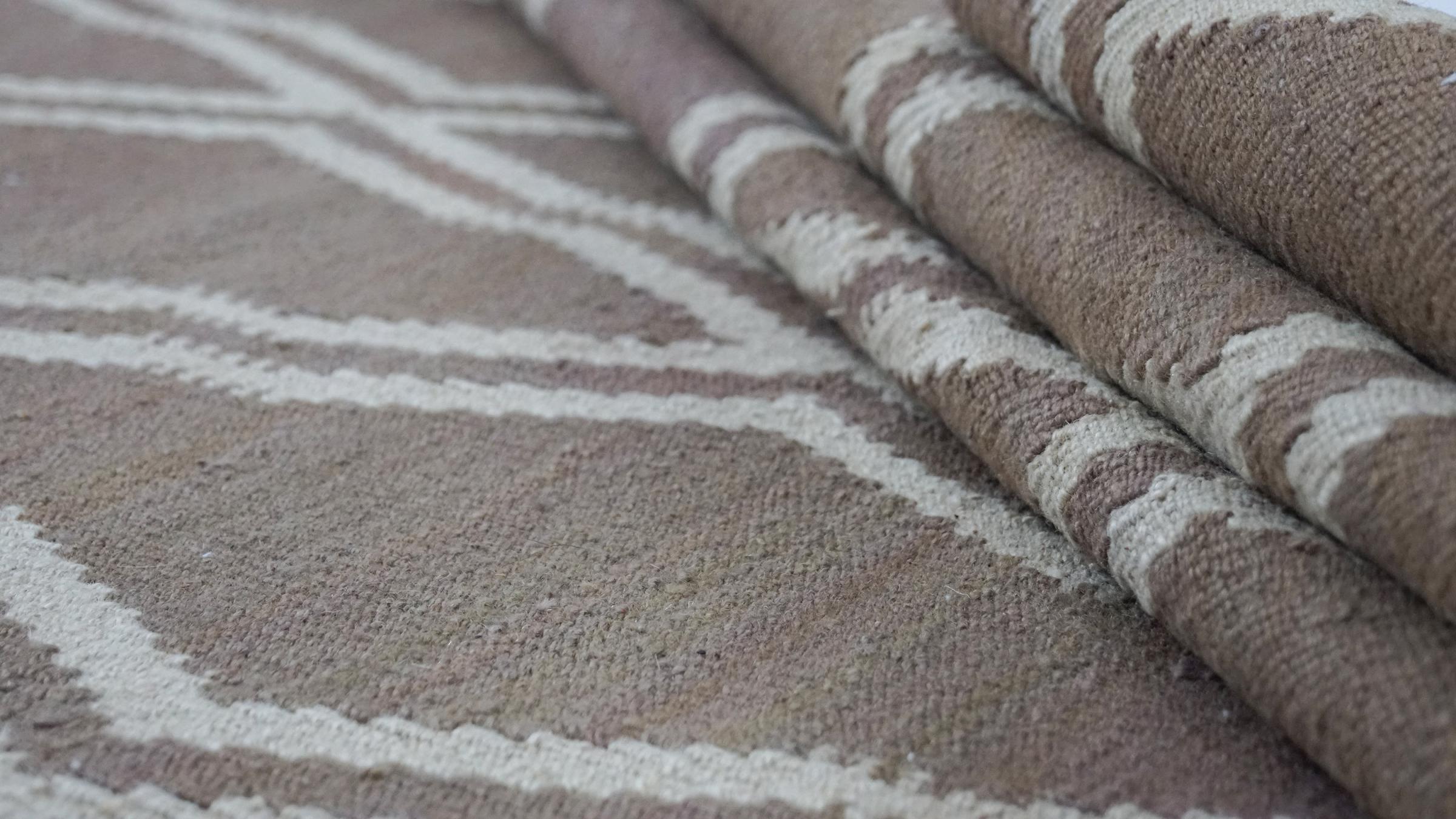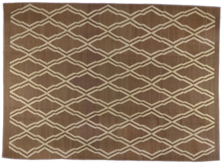 Esta alfombra fue hecha a mano en un telar como un tejido plano. Tejido plano es el término utilizado para describir las alfombras que no tienen pelo. Como el nombre promete, estas alfombras están tejidas y no anudadas. Esto resulta en una alfombra plana con una superficie estructurada. Los tejidos planos no son tan suaves y normalmente más delgados que las alfombras anudadas. Al mismo tiempo, su fabricación es mucho menos compleja y por lo general se pueden disponer por ambos lados (frontal y posterior). Sus patrones suelen ser geométricos, lo cual está determinado por el tejido.