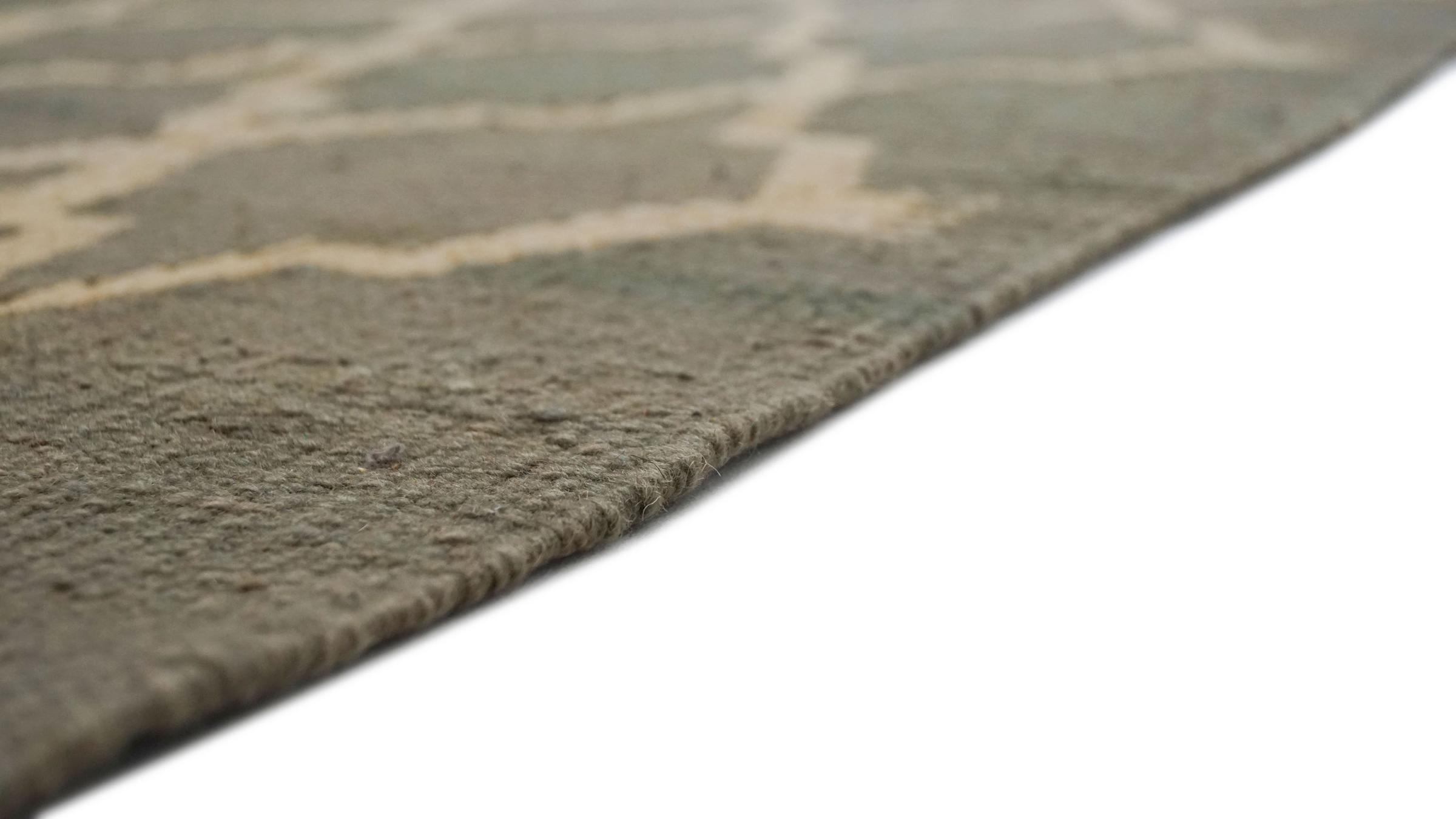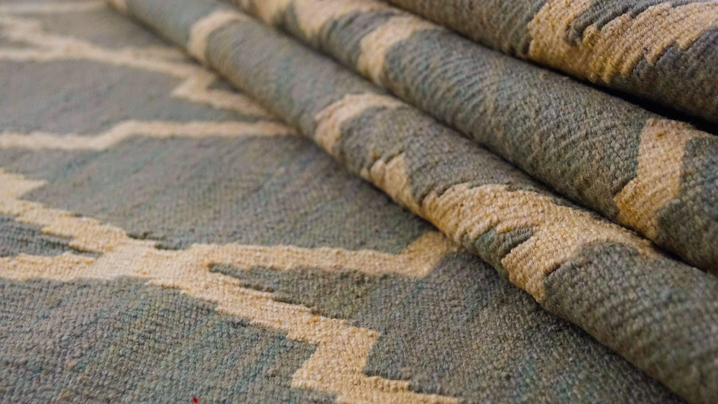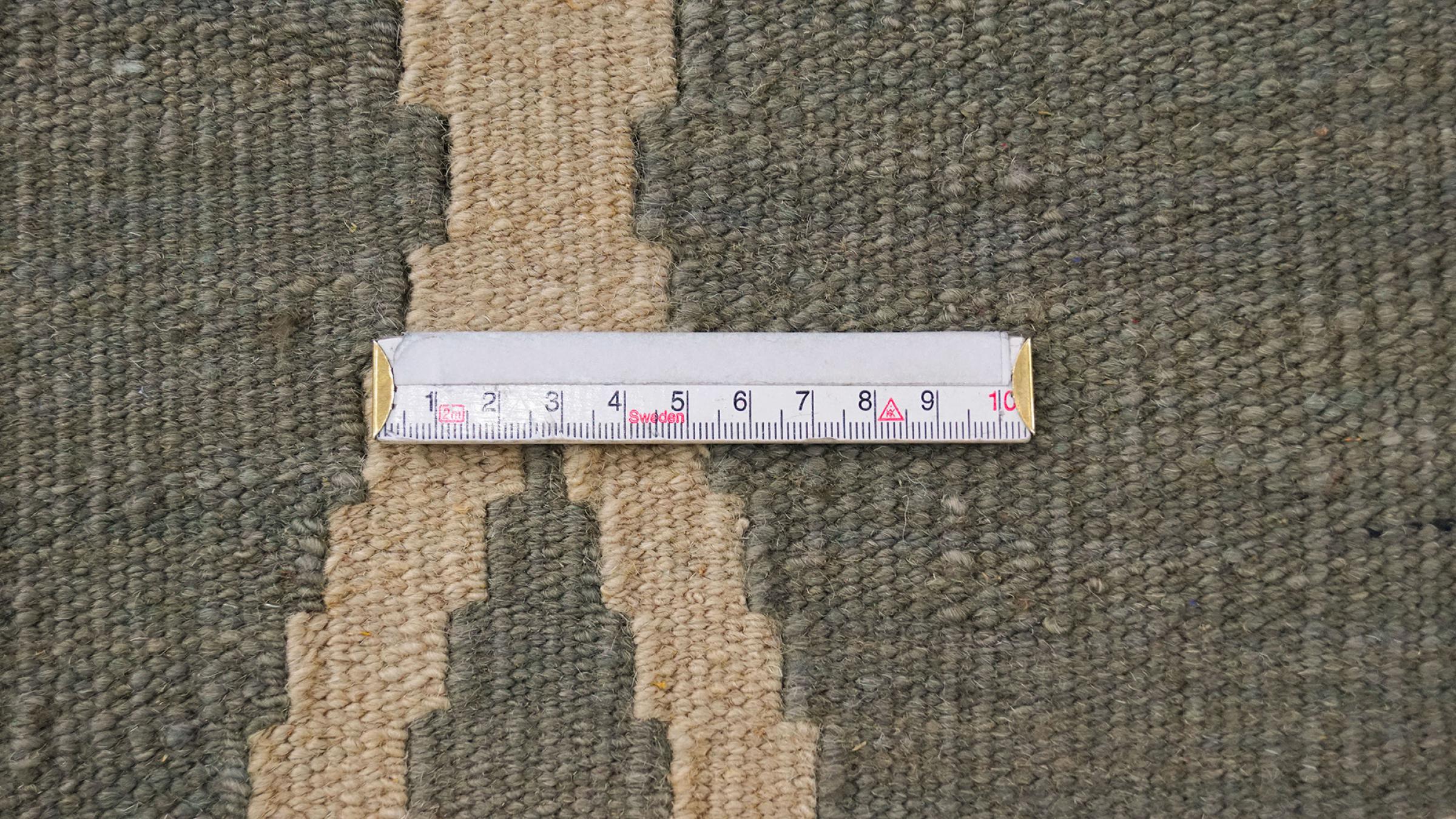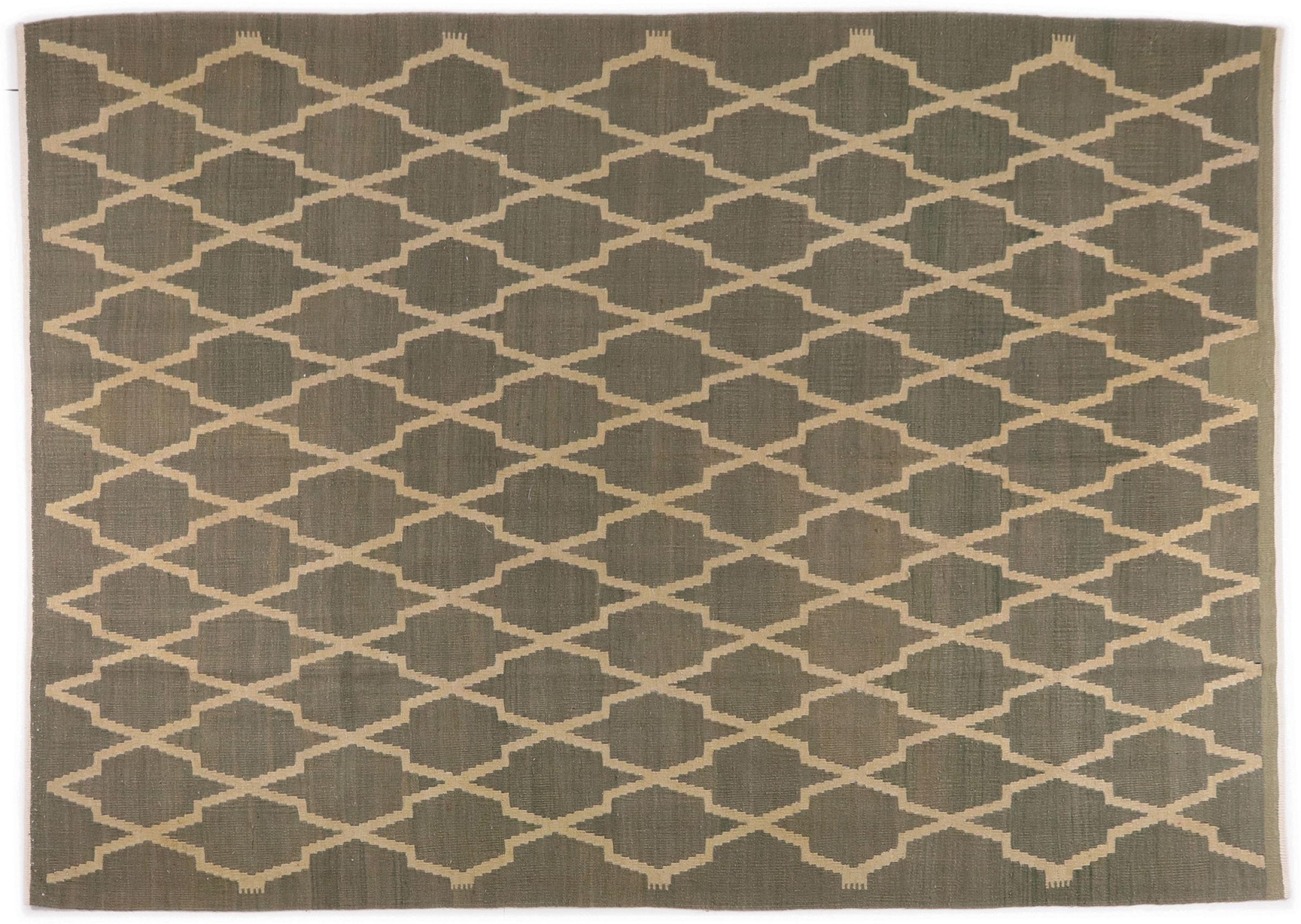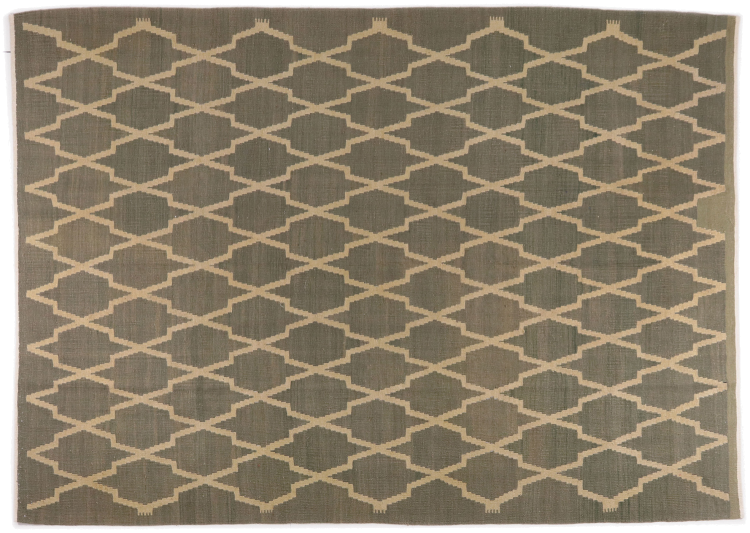 Esta alfombra fue hecha a mano en un telar como un tejido plano. Tejido plano es el término utilizado para describir las alfombras que no tienen pelo. Como el nombre promete, estas alfombras están tejidas y no anudadas. Esto resulta en una alfombra plana con una superficie estructurada. Los tejidos planos no son tan suaves y normalmente más delgados que las alfombras anudadas. Al mismo tiempo, su fabricación es mucho menos compleja y por lo general se pueden disponer por ambos lados (frontal y posterior). Sus patrones suelen ser geométricos, lo cual está determinado por el tejido.