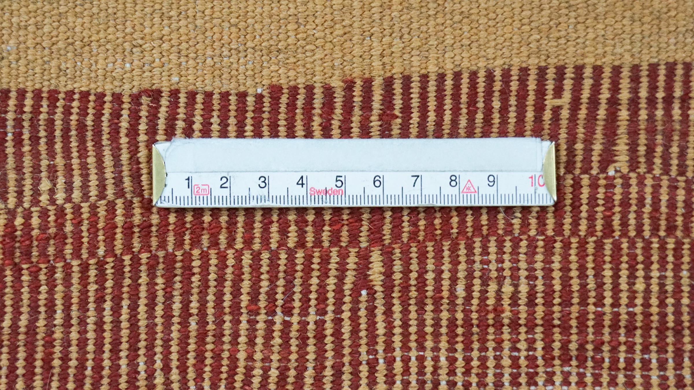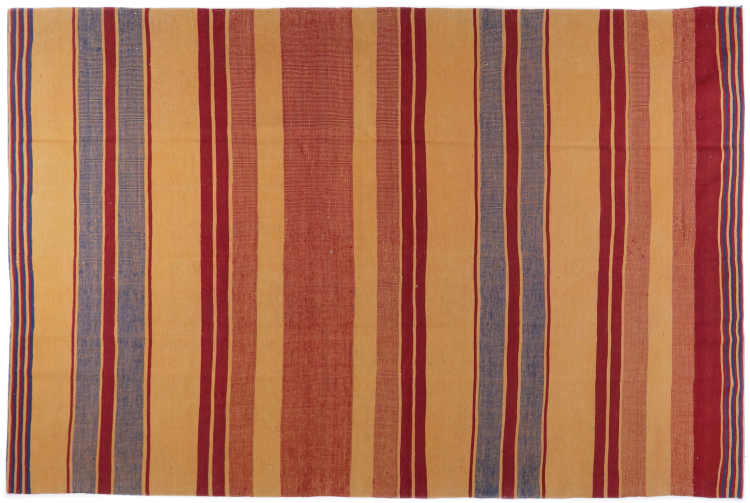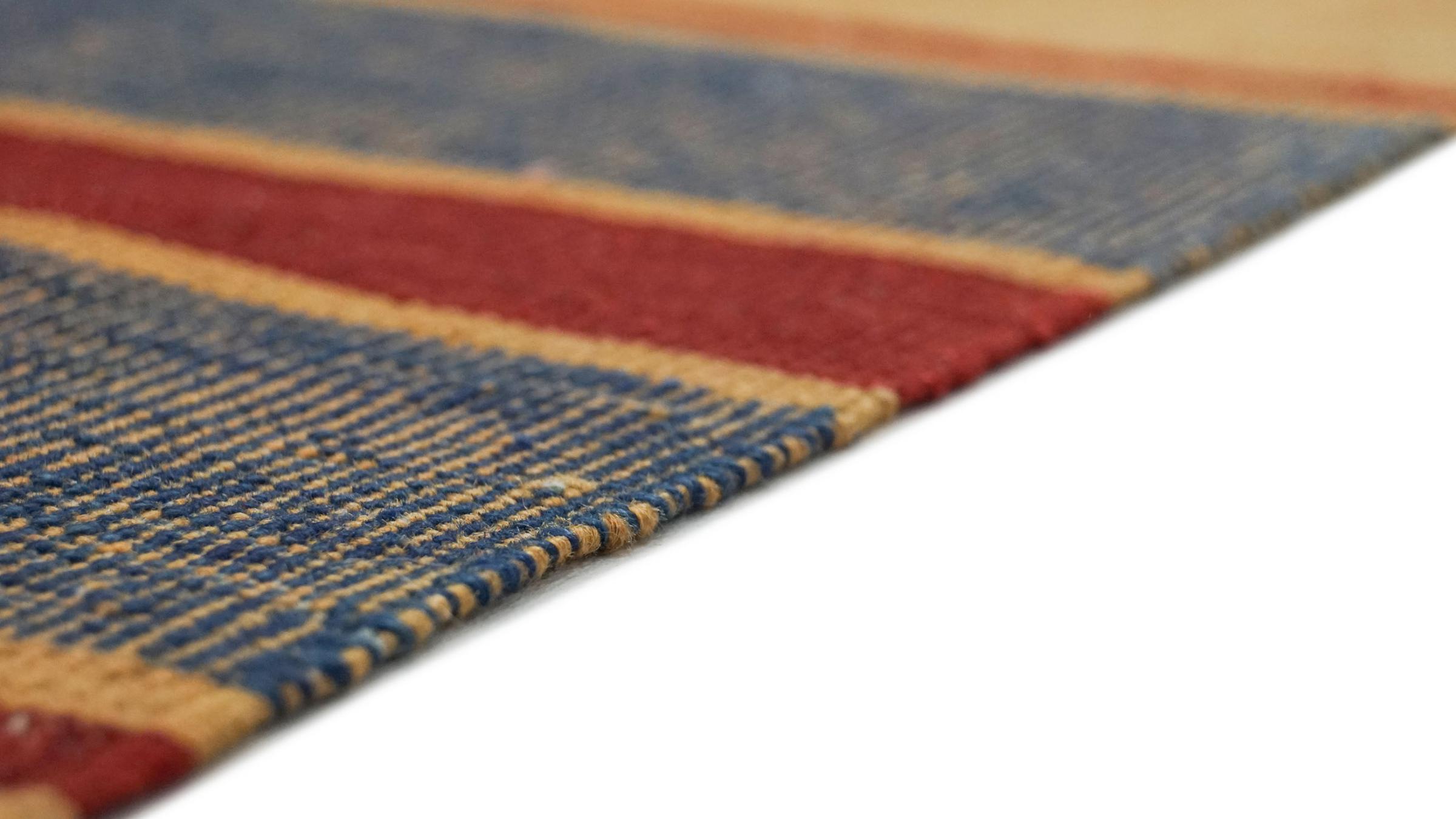 Esta alfombra fue hecha a mano en un telar como un tejido plano. Tejido plano es el término utilizado para describir las alfombras que no tienen pelo. Como el nombre promete, estas alfombras están tejidas y no anudadas. Esto resulta en una alfombra plana con una superficie estructurada. Los tejidos planos no son tan suaves y normalmente más delgados que las alfombras anudadas. Al mismo tiempo, su fabricación es mucho menos compleja y por lo general se pueden disponer por ambos lados (frontal y posterior). Sus patrones suelen ser geométricos, lo cual está determinado por el tejido.