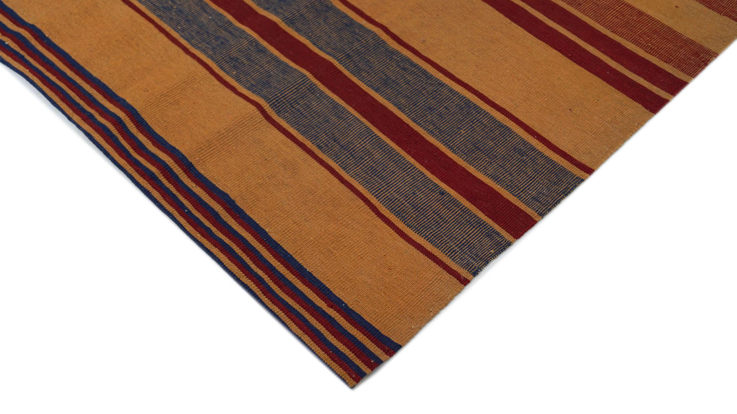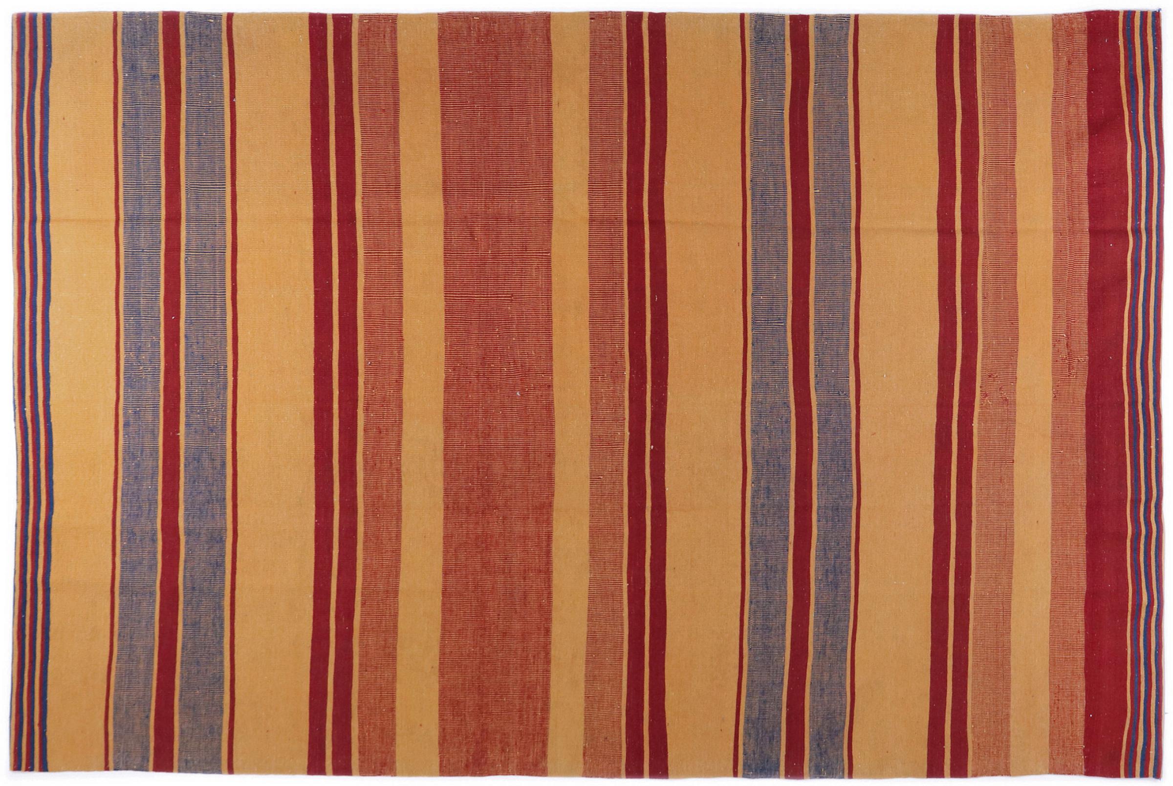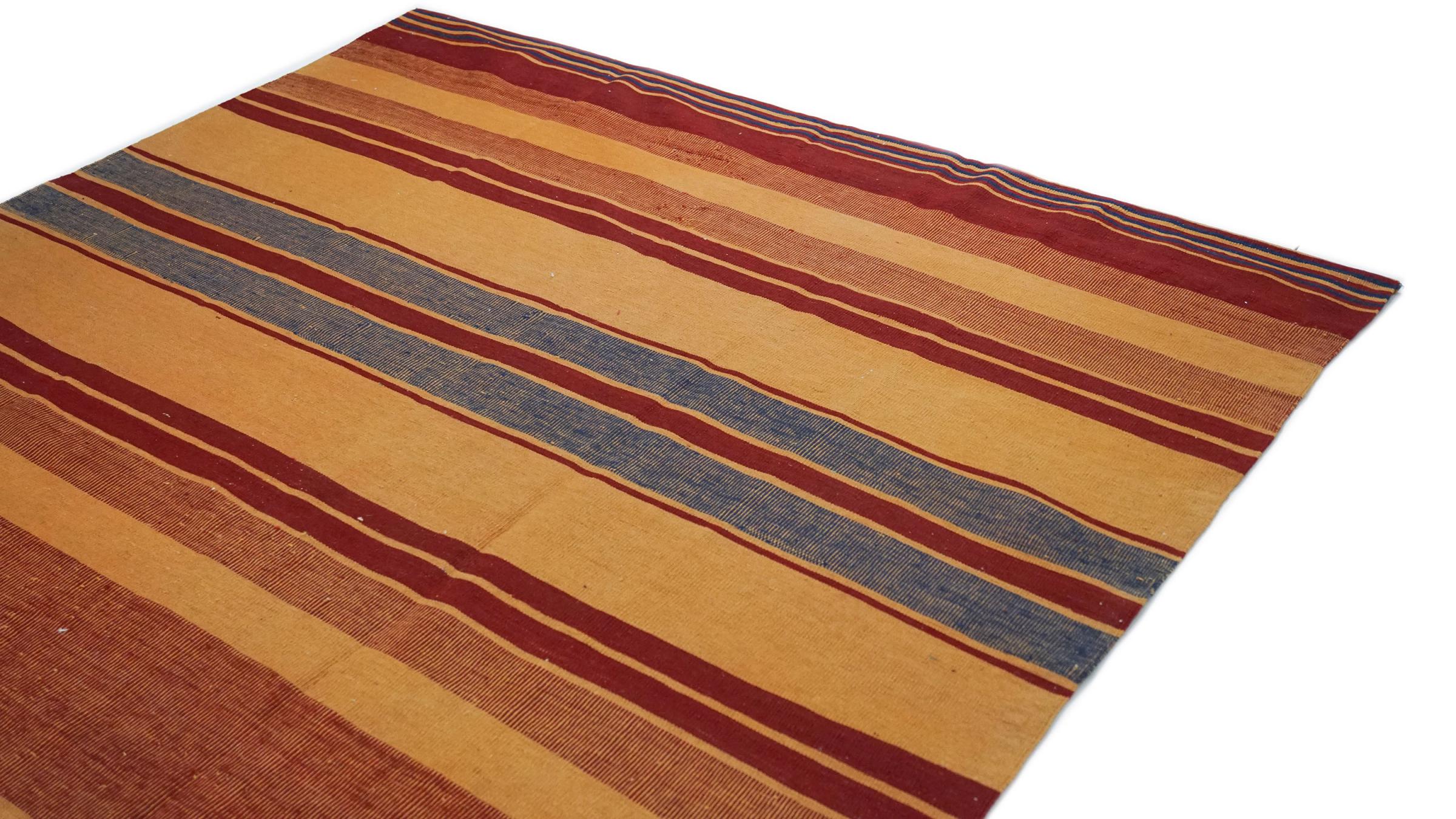 Esta alfombra fue hecha a mano en un telar como un tejido plano. Tejido plano es el término utilizado para describir las alfombras que no tienen pelo. Como el nombre promete, estas alfombras están tejidas y no anudadas. Esto resulta en una alfombra plana con una superficie estructurada. Los tejidos planos no son tan suaves y normalmente más delgados que las alfombras anudadas. Al mismo tiempo, su fabricación es mucho menos compleja y por lo general se pueden disponer por ambos lados (frontal y posterior). Sus patrones suelen ser geométricos, lo cual está determinado por el tejido.