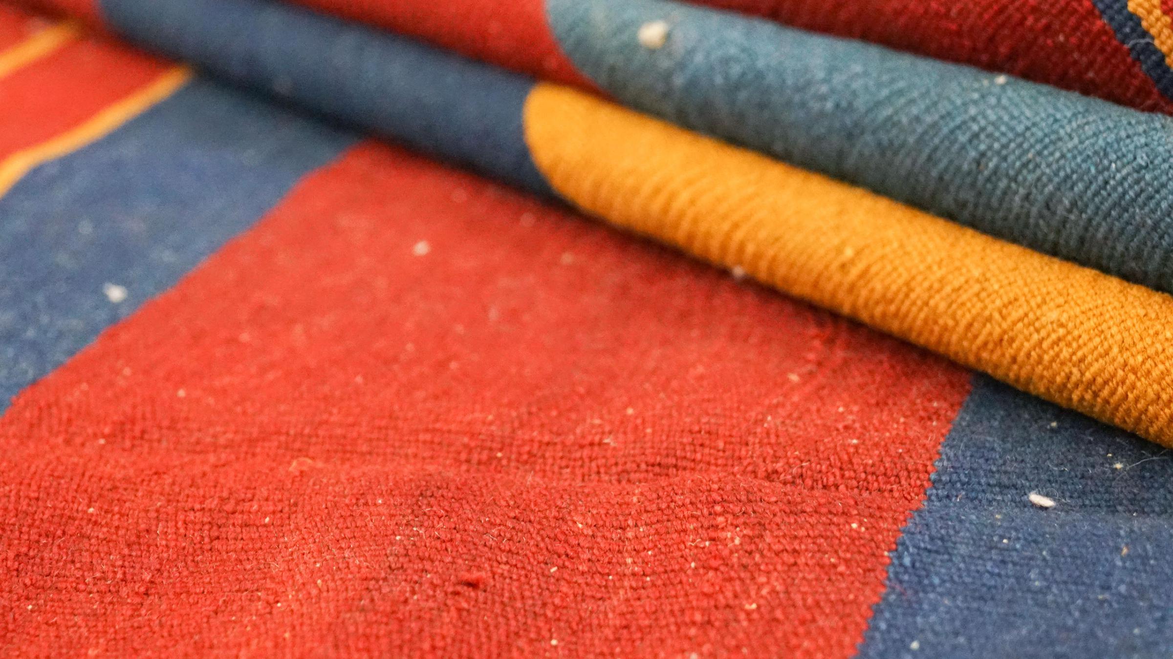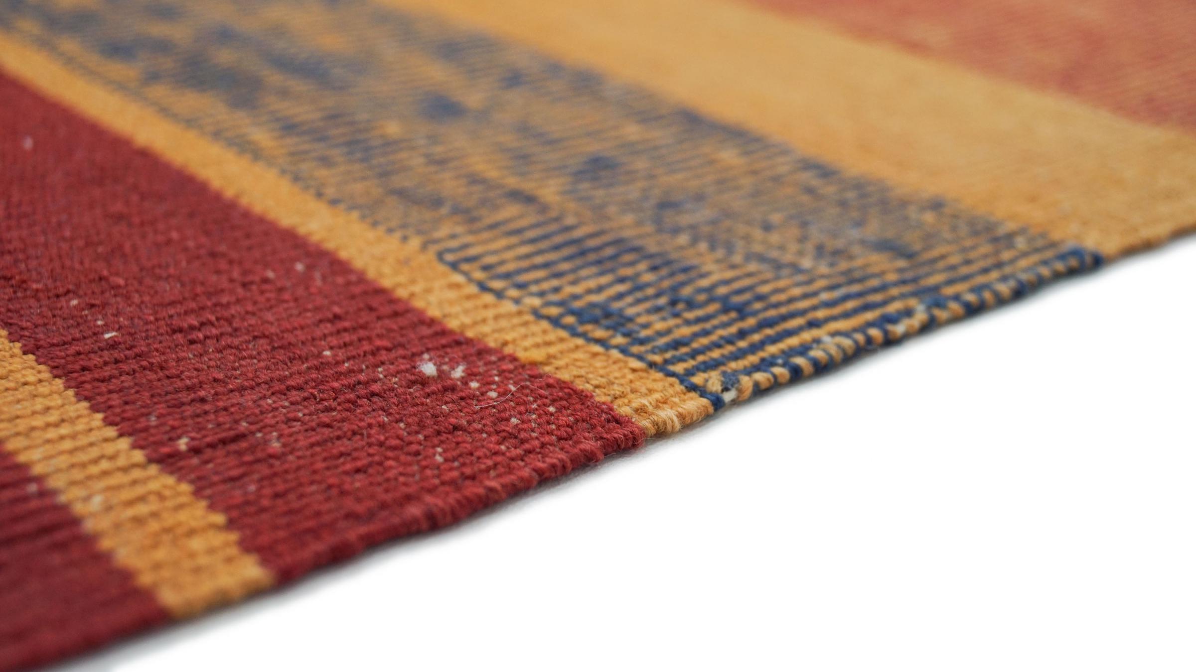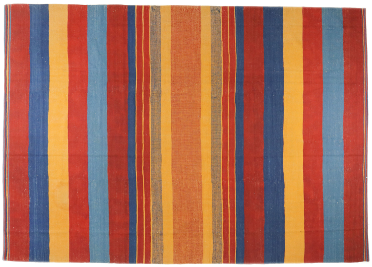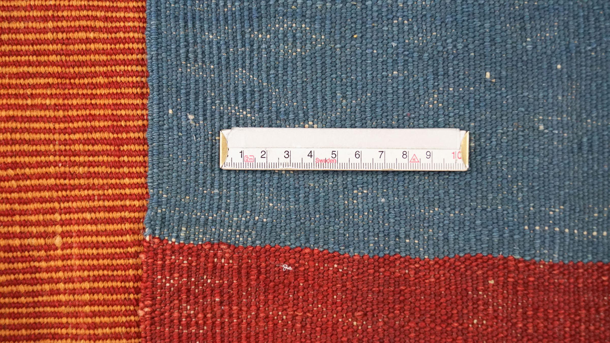 Esta alfombra fue hecha a mano en un telar como un tejido plano. Tejido plano es el término utilizado para describir las alfombras que no tienen pelo. Como el nombre promete, estas alfombras están tejidas y no anudadas. Esto resulta en una alfombra plana con una superficie estructurada. Los tejidos planos no son tan suaves y normalmente más delgados que las alfombras anudadas. Al mismo tiempo, su fabricación es mucho menos compleja y por lo general se pueden disponer por ambos lados (frontal y posterior). Sus patrones suelen ser geométricos, lo cual está determinado por el tejido.