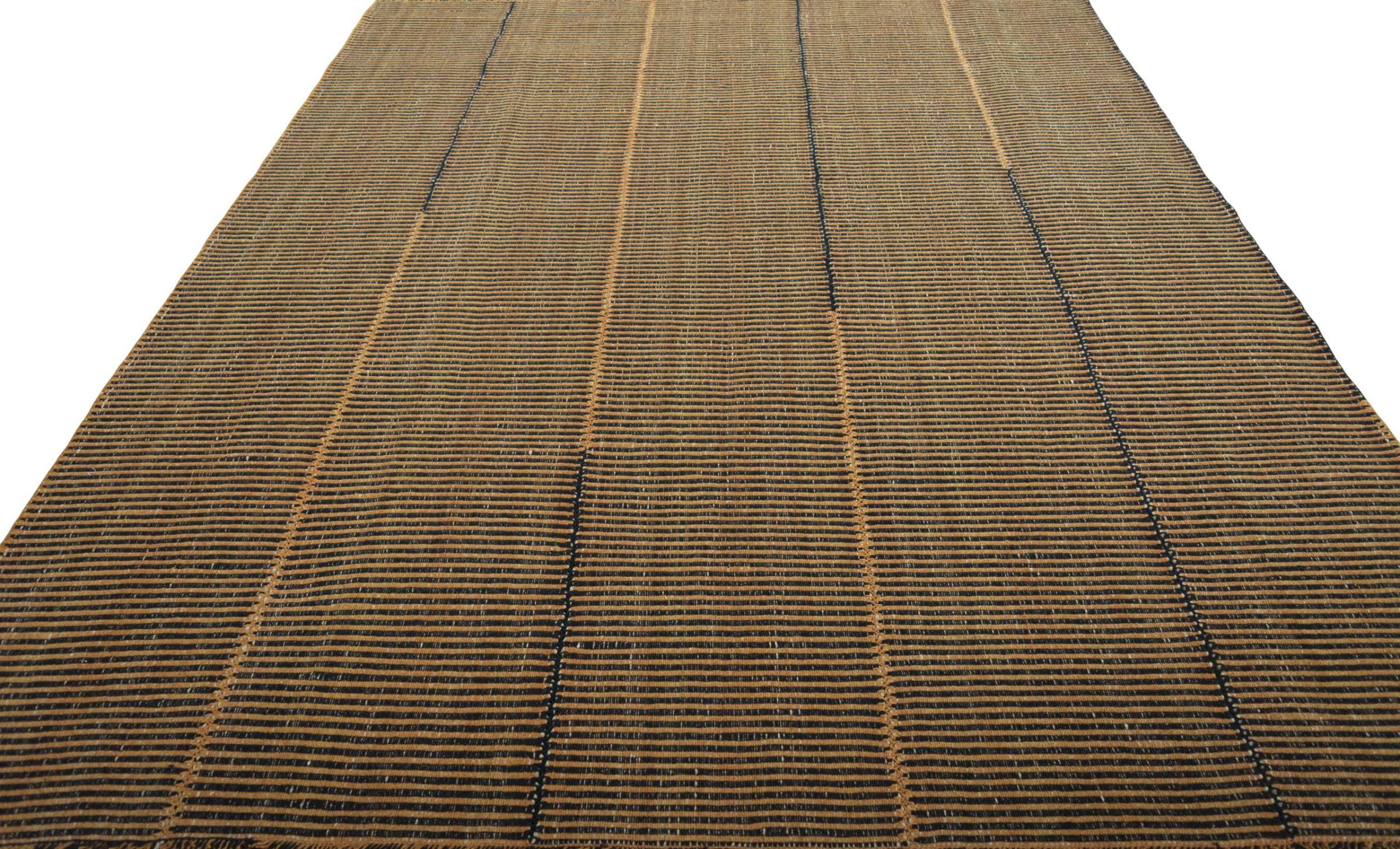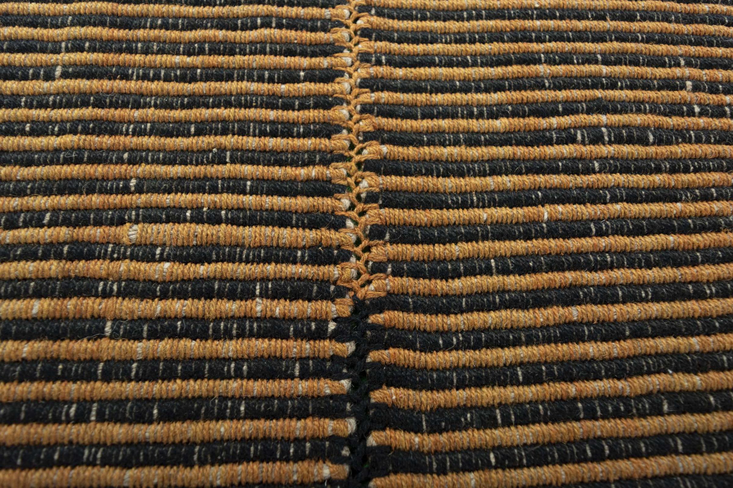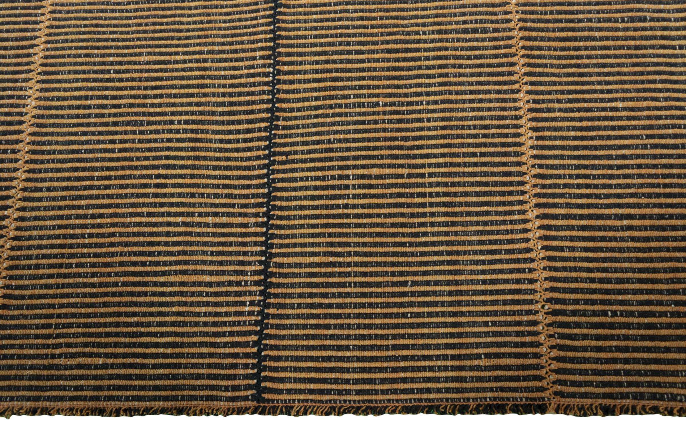 Esta alfombra fue hecha a mano en un telar como un tejido plano. Tejido plano es el término utilizado para describir las alfombras que no tienen pelo. Como el nombre promete, estas alfombras están tejidas y no anudadas. Esto resulta en una alfombra plana con una superficie estructurada. Los tejidos planos no son tan suaves y normalmente más delgados que las alfombras anudadas. Al mismo tiempo, su fabricación es mucho menos compleja y por lo general se pueden disponer por ambos lados (frontal y posterior). Sus patrones suelen ser geométricos, lo cual está determinado por el tejido.