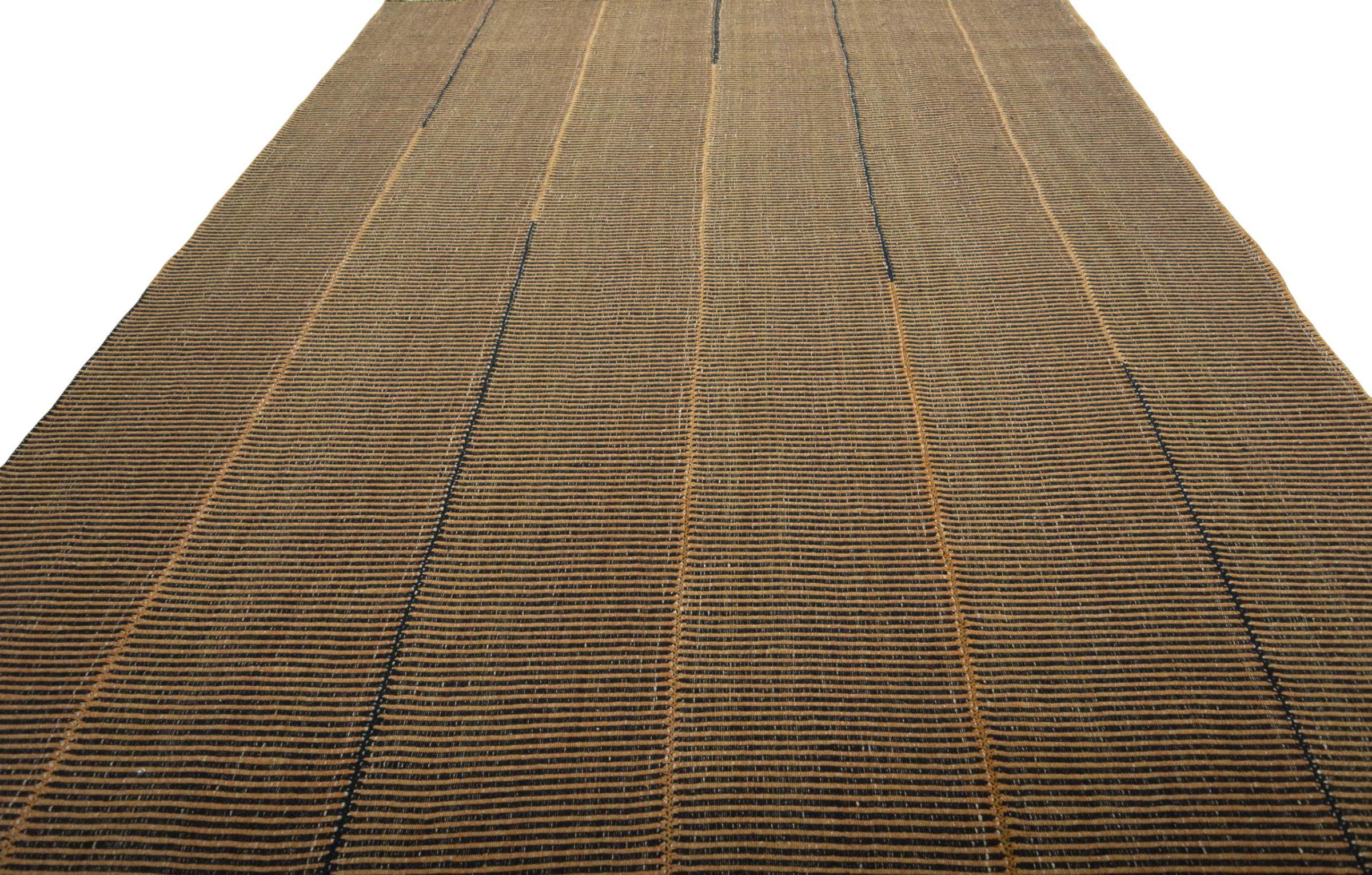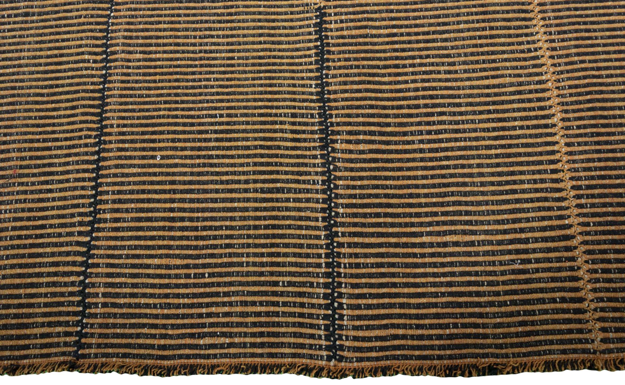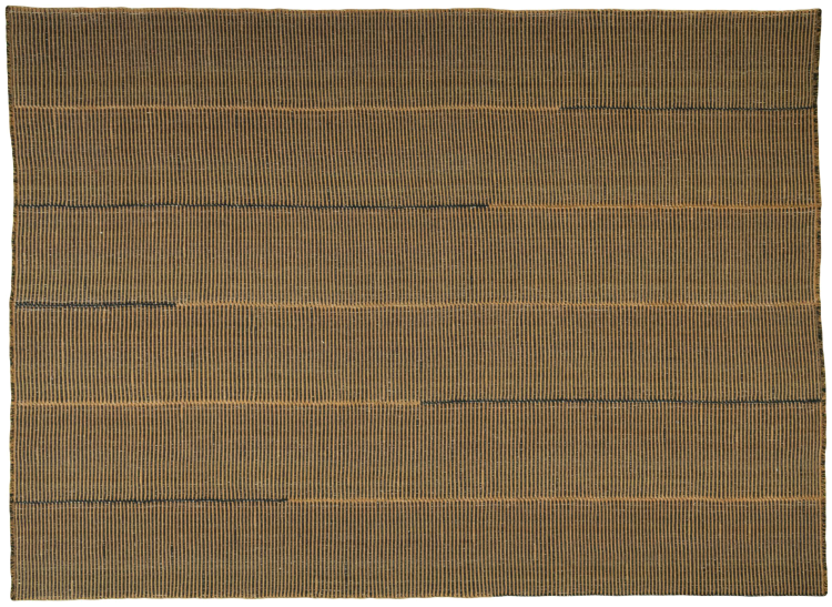 Esta alfombra fue hecha a mano en un telar como un tejido plano. Tejido plano es el término utilizado para describir las alfombras que no tienen pelo. Como el nombre promete, estas alfombras están tejidas y no anudadas. Esto resulta en una alfombra plana con una superficie estructurada. Los tejidos planos no son tan suaves y normalmente más delgados que las alfombras anudadas. Al mismo tiempo, su fabricación es mucho menos compleja y por lo general se pueden disponer por ambos lados (frontal y posterior). Sus patrones suelen ser geométricos, lo cual está determinado por el tejido.