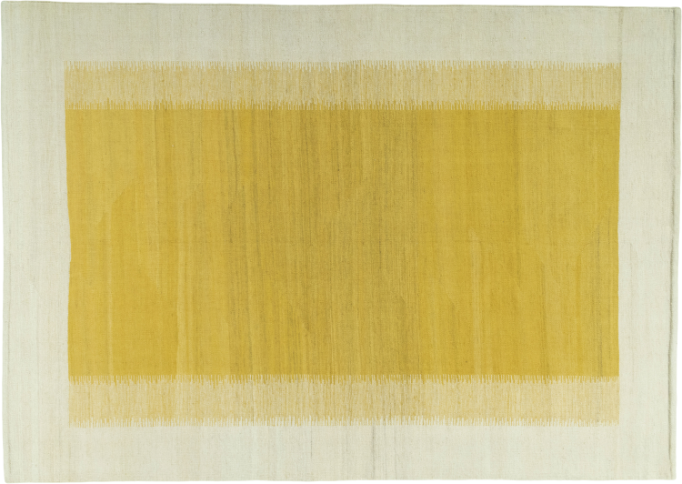 Esta alfombra fue hecha a mano en un telar como un tejido plano. Tejido plano es el término utilizado para describir las alfombras que no tienen pelo. Como el nombre promete, estas alfombras están tejidas y no anudadas. Esto resulta en una alfombra plana con una superficie estructurada. Los tejidos planos no son tan suaves y normalmente más delgados que las alfombras anudadas. Al mismo tiempo, su fabricación es mucho menos compleja y por lo general se pueden disponer por ambos lados (frontal y posterior). Sus patrones suelen ser geométricos, lo cual está determinado por el tejido.