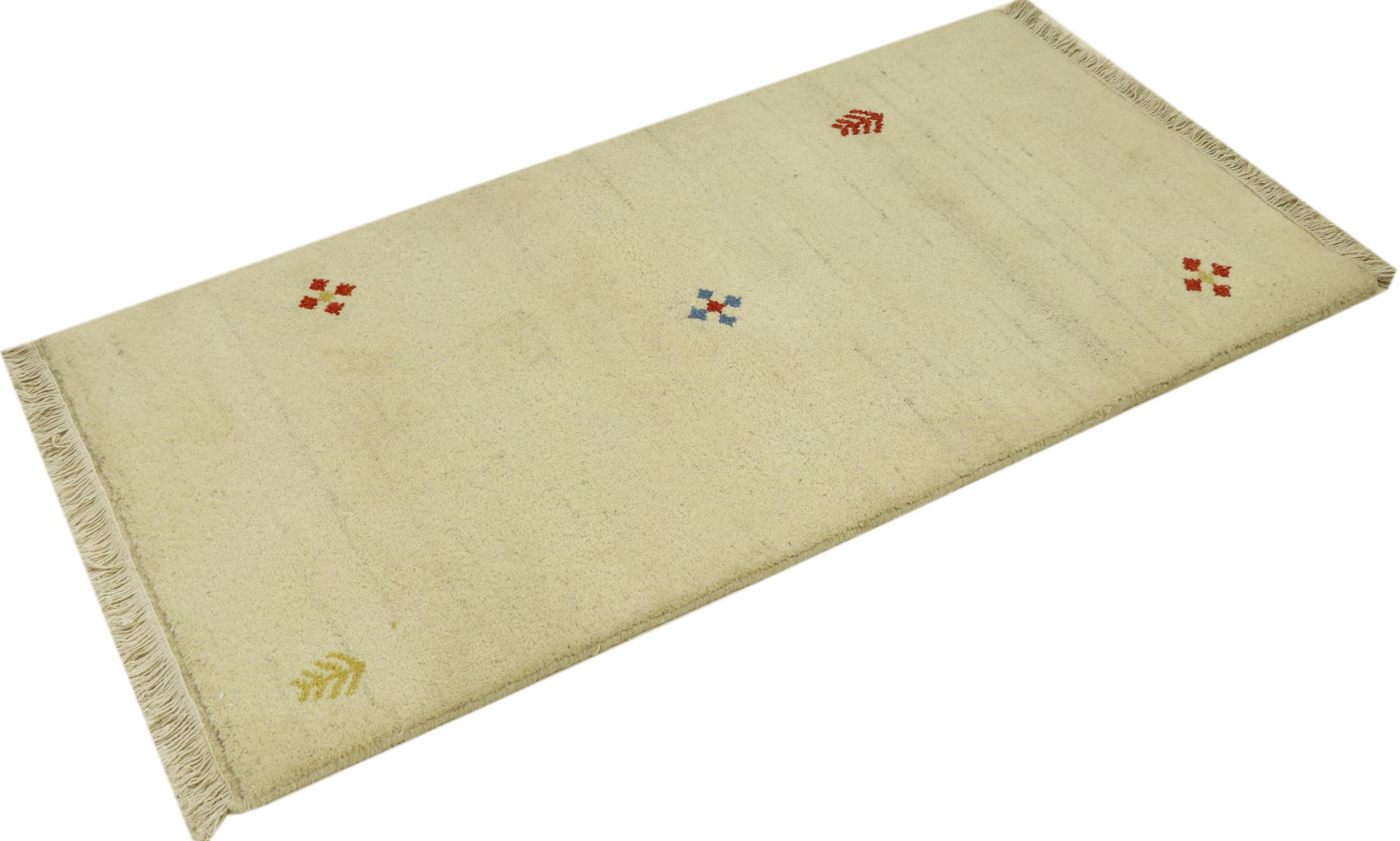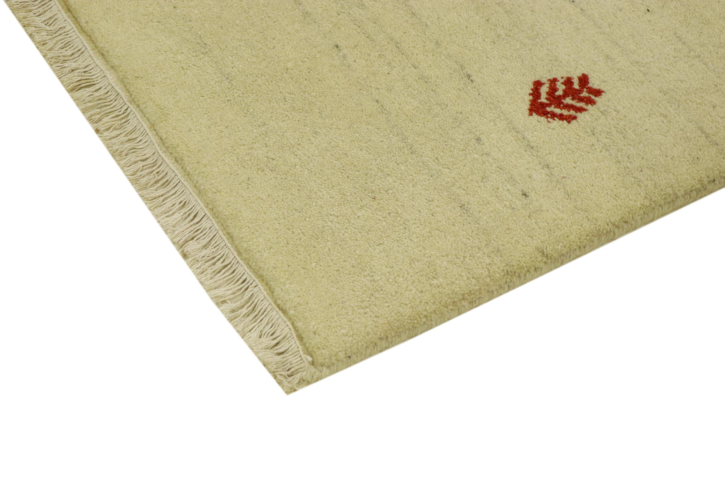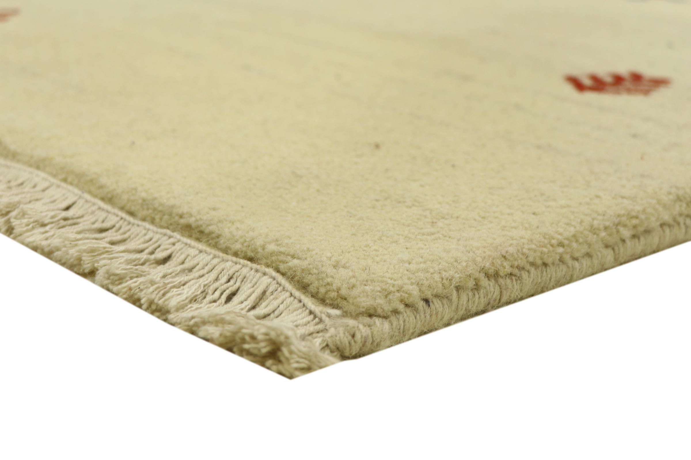 Esta hermosa alfombra de Gabbeh fue anudada a mano en la India. Las alfombras indias de Gabbeh están hechas de suave lana de oveja, son cómodas para los pies y tienen propiedades de aislamiento térmico. La mayoría de sus diseños son simples y modernos atemporales. Se inspiraron en los pueblos nómadas, que dejaban fluir en las alfombras motivos muy simples de su entorno. Las alfombras de Gabbeh de la India no se acercan mucho a la calidad de las de Gabbeh de Persia, pero tienen una muy buena relación precio-rendimiento. Por lo tanto, son perfectamente adecuadas como alfombras anudadas a mano para principiantes.