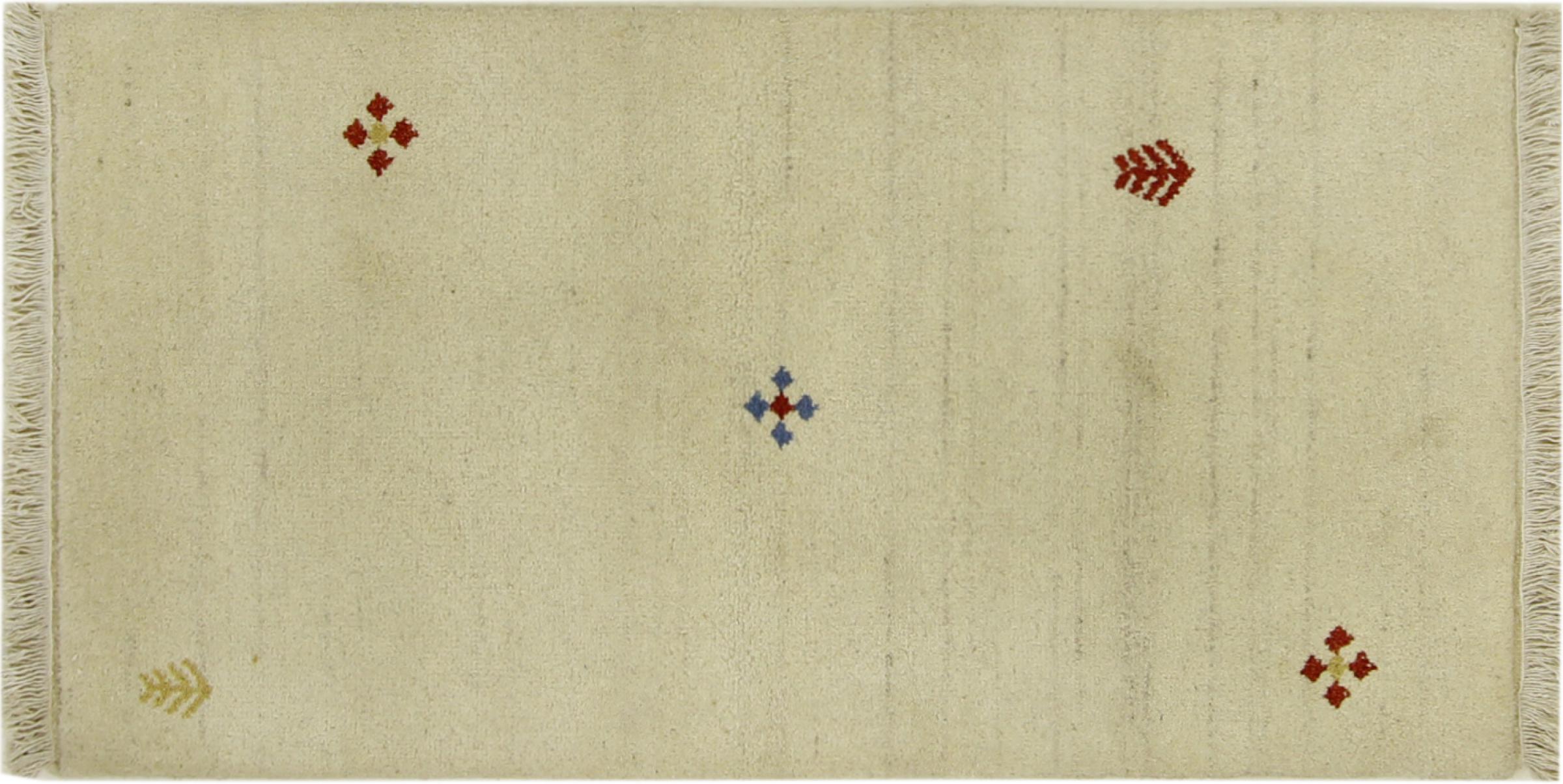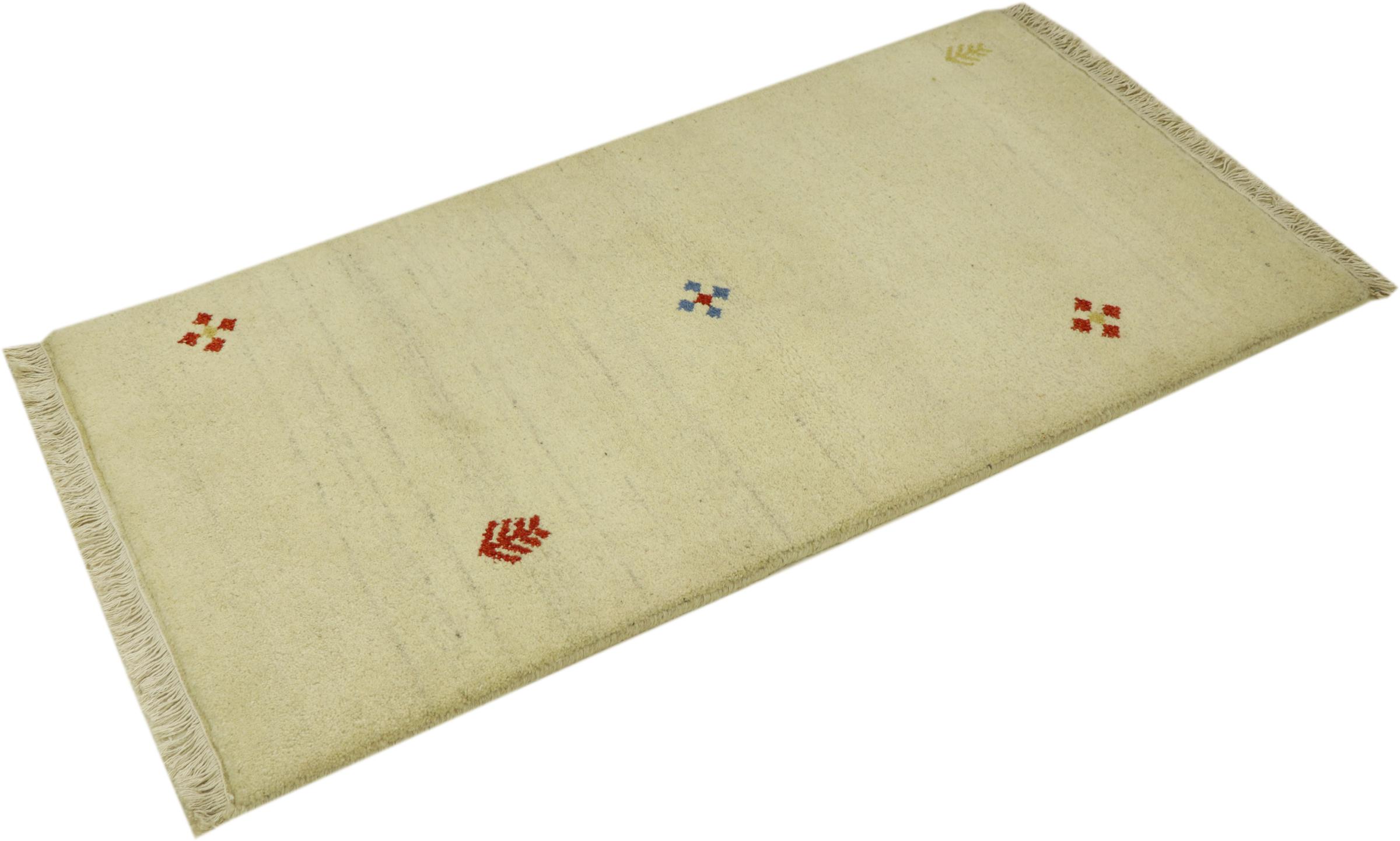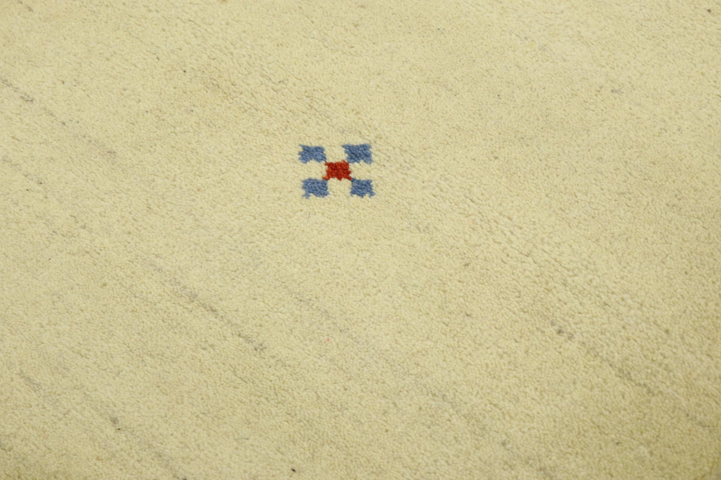 Esta hermosa alfombra de Gabbeh fue anudada a mano en la India. Las alfombras indias de Gabbeh están hechas de suave lana de oveja, son cómodas para los pies y tienen propiedades de aislamiento térmico. La mayoría de sus diseños son simples y modernos atemporales. Se inspiraron en los pueblos nómadas, que dejaban fluir en las alfombras motivos muy simples de su entorno. Las alfombras de Gabbeh de la India no se acercan mucho a la calidad de las de Gabbeh de Persia, pero tienen una muy buena relación precio-rendimiento. Por lo tanto, son perfectamente adecuadas como alfombras anudadas a mano para principiantes.