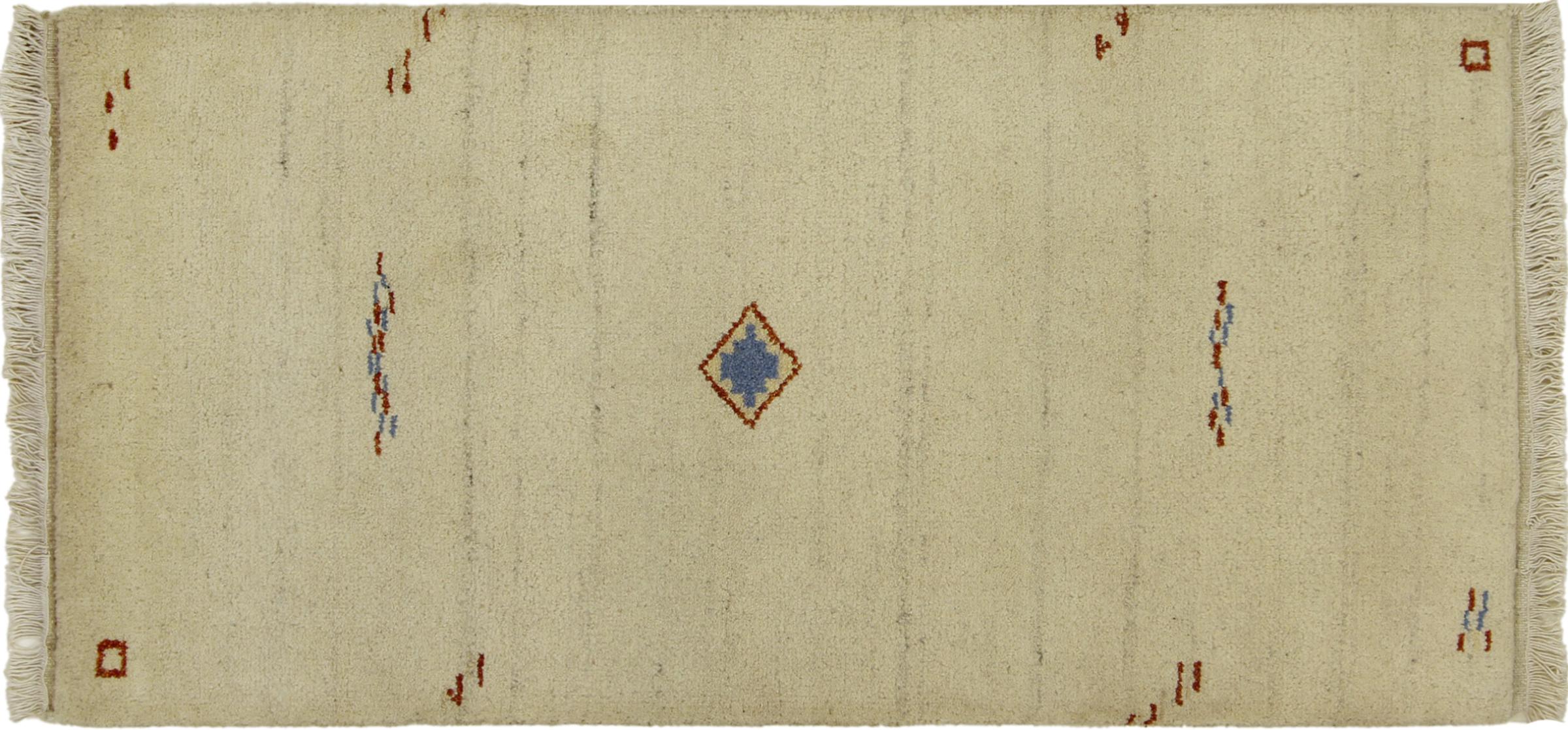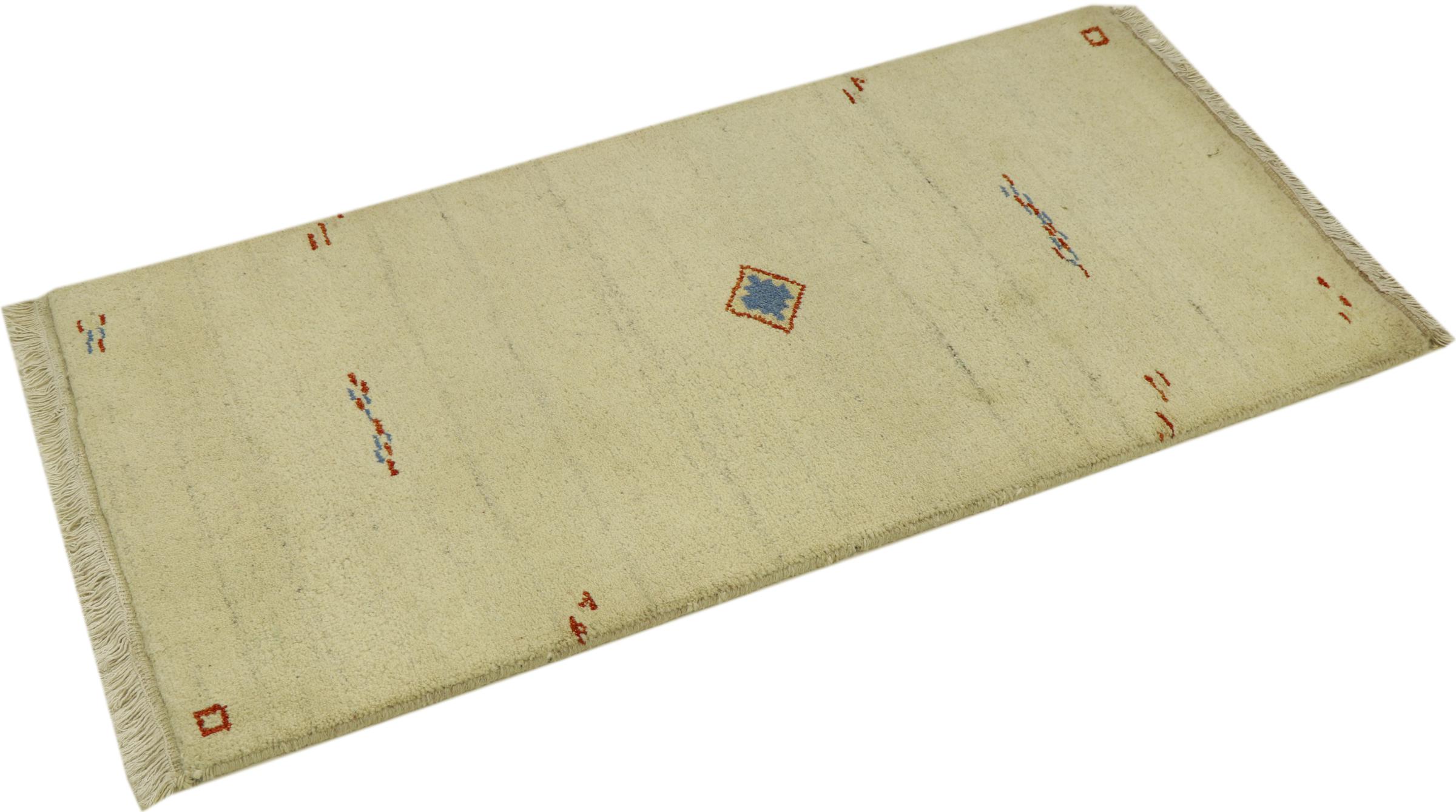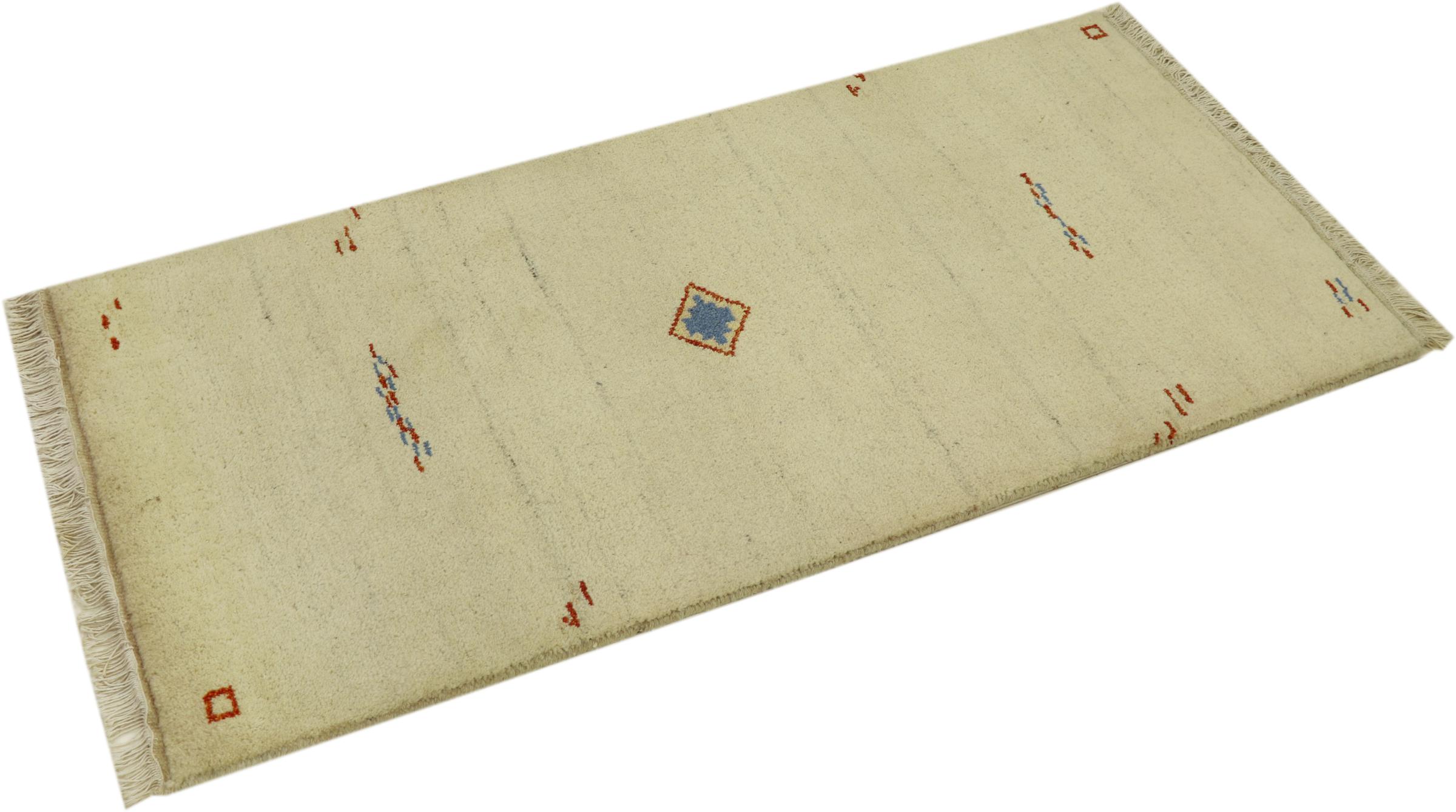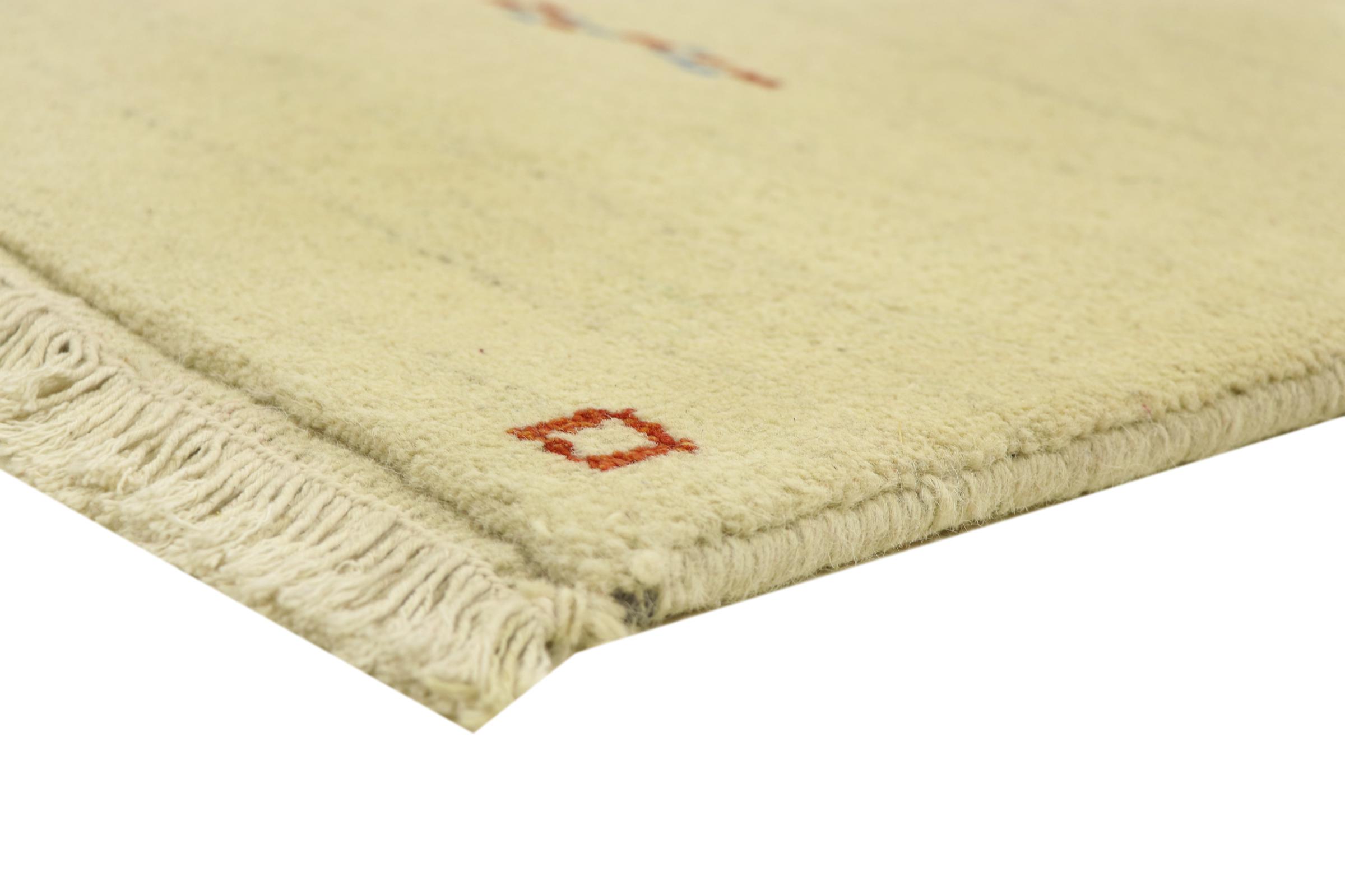 Esta hermosa alfombra de Gabbeh fue anudada a mano en la India. Las alfombras indias de Gabbeh están hechas de suave lana de oveja, son cómodas para los pies y tienen propiedades de aislamiento térmico. La mayoría de sus diseños son simples y modernos atemporales. Se inspiraron en los pueblos nómadas, que dejaban fluir en las alfombras motivos muy simples de su entorno. Las alfombras de Gabbeh de la India no se acercan mucho a la calidad de las de Gabbeh de Persia, pero tienen una muy buena relación precio-rendimiento. Por lo tanto, son perfectamente adecuadas como alfombras anudadas a mano para principiantes.