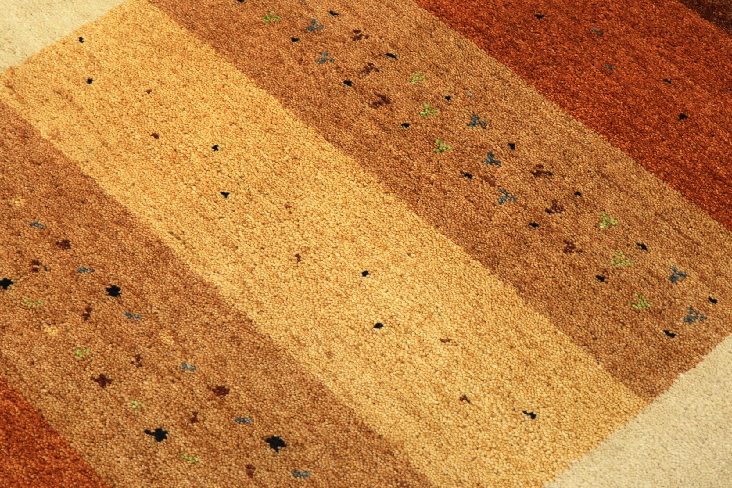 Esta hermosa alfombra de Gabbeh fue anudada a mano en la India. Las alfombras indias de Gabbeh están hechas de suave lana de oveja, son cómodas para los pies y tienen propiedades de aislamiento térmico. La mayoría de sus diseños son simples y modernos atemporales. Se inspiraron en los pueblos nómadas, que dejaban fluir en las alfombras motivos muy simples de su entorno. Las alfombras de Gabbeh de la India no se acercan mucho a la calidad de las de Gabbeh de Persia, pero tienen una muy buena relación precio-rendimiento. Por lo tanto, son perfectamente adecuadas como alfombras anudadas a mano para principiantes.