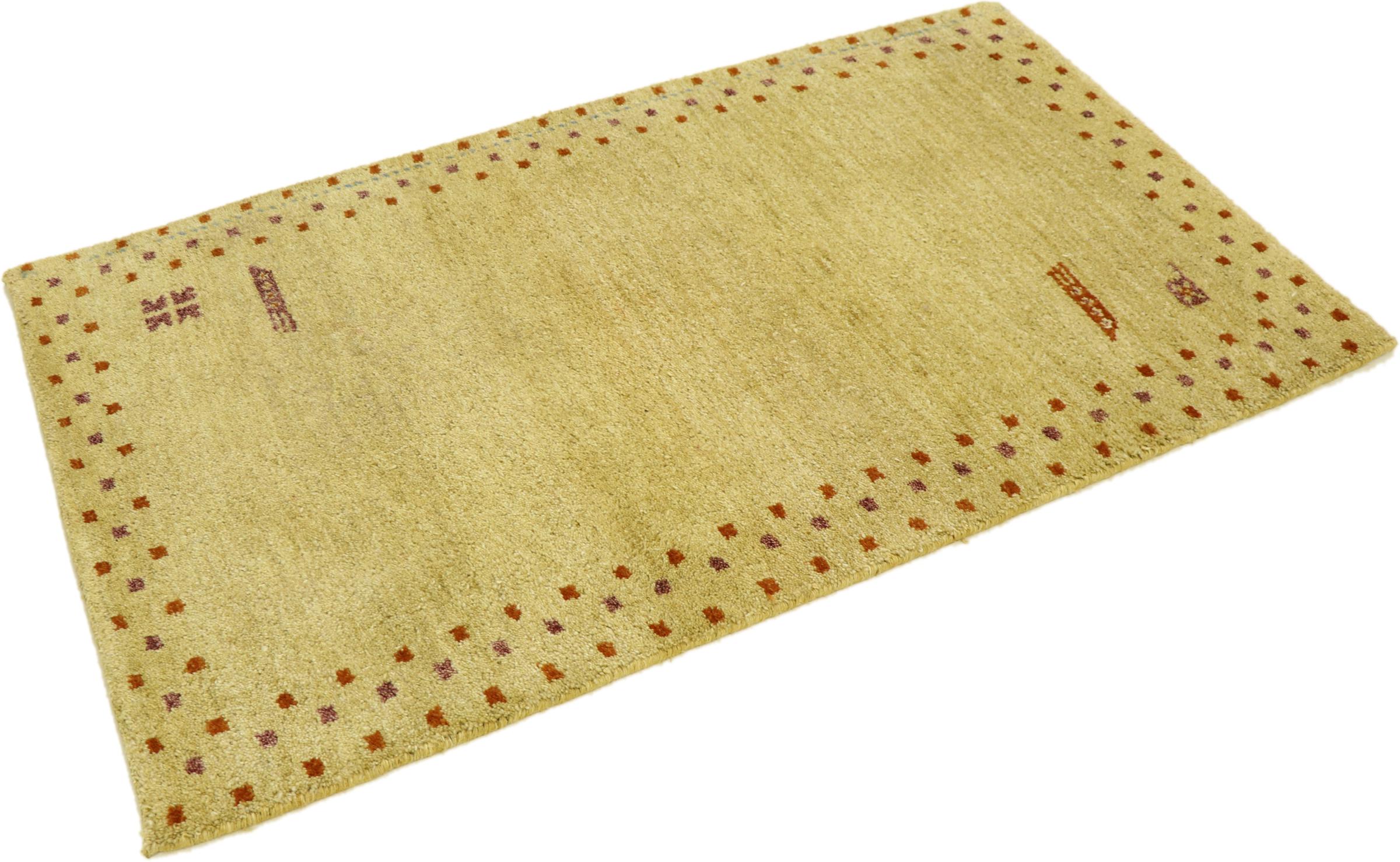 Esta hermosa alfombra de Gabbeh fue anudada a mano en la India. Las alfombras indias de Gabbeh están hechas de suave lana de oveja, son cómodas para los pies y tienen propiedades de aislamiento térmico. La mayoría de sus diseños son simples y modernos atemporales. Se inspiraron en los pueblos nómadas, que dejaban fluir en las alfombras motivos muy simples de su entorno. Las alfombras de Gabbeh de la India no se acercan mucho a la calidad de las de Gabbeh de Persia, pero tienen una muy buena relación precio-rendimiento. Por lo tanto, son perfectamente adecuadas como alfombras anudadas a mano para principiantes.