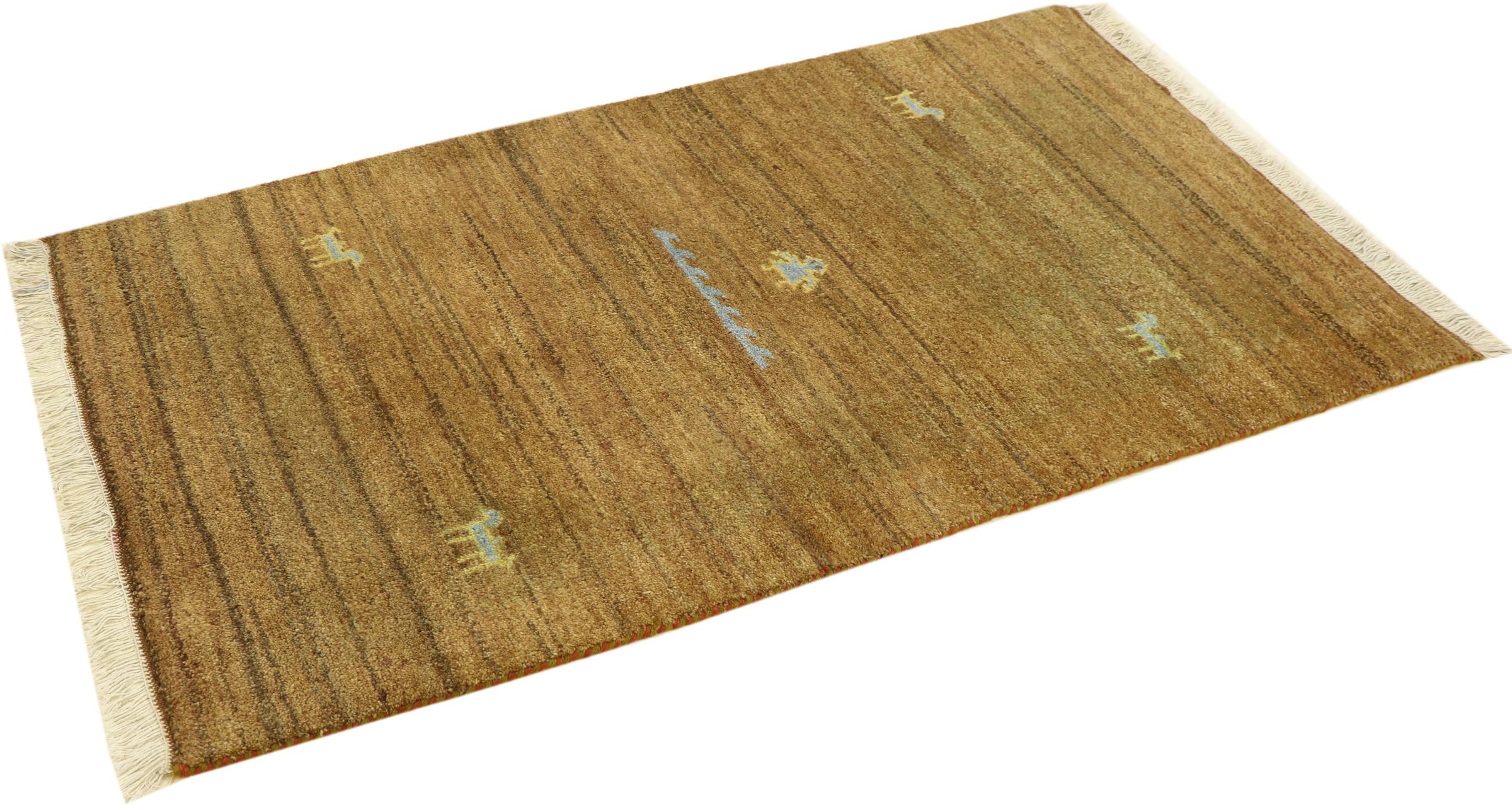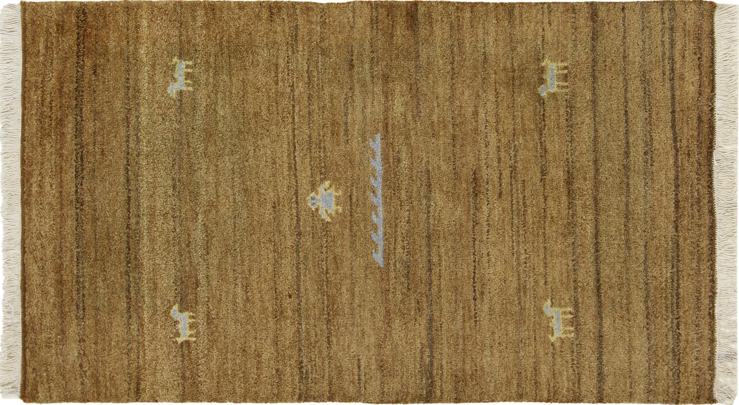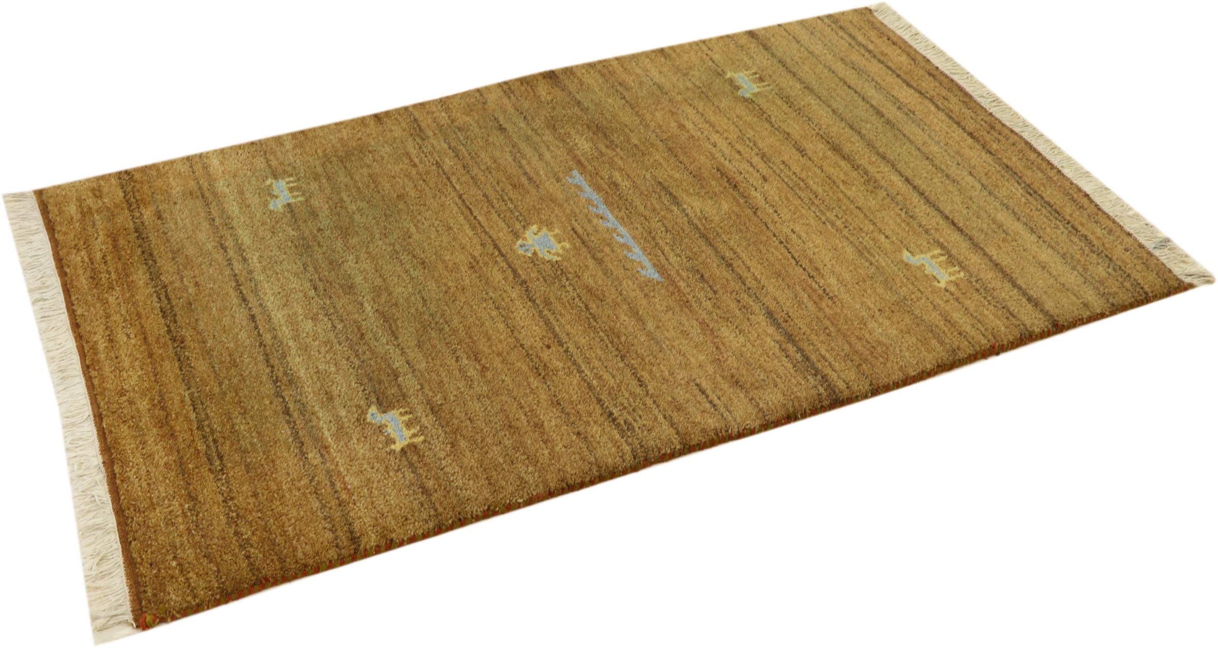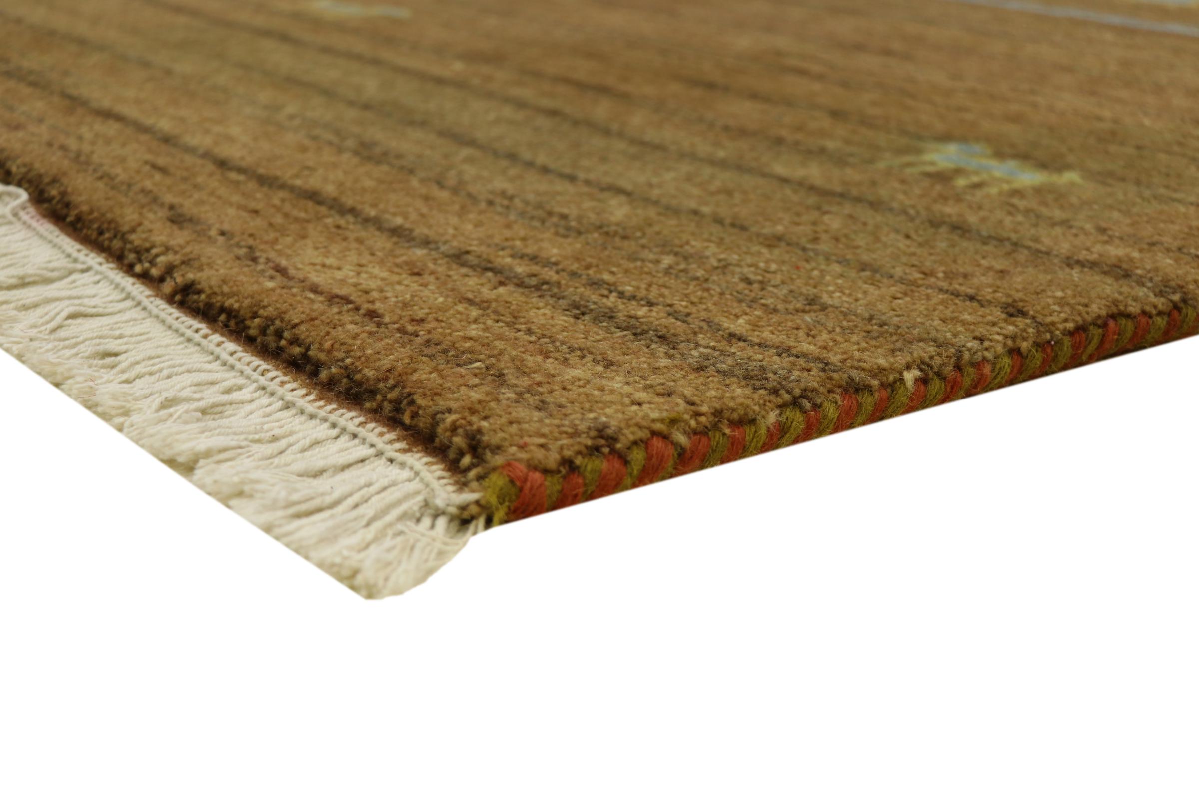 Esta hermosa alfombra de Gabbeh fue anudada a mano en la India. Las alfombras indias de Gabbeh están hechas de suave lana de oveja, son cómodas para los pies y tienen propiedades de aislamiento térmico. La mayoría de sus diseños son simples y modernos atemporales. Se inspiraron en los pueblos nómadas, que dejaban fluir en las alfombras motivos muy simples de su entorno. Las alfombras de Gabbeh de la India no se acercan mucho a la calidad de las de Gabbeh de Persia, pero tienen una muy buena relación precio-rendimiento. Por lo tanto, son perfectamente adecuadas como alfombras anudadas a mano para principiantes.