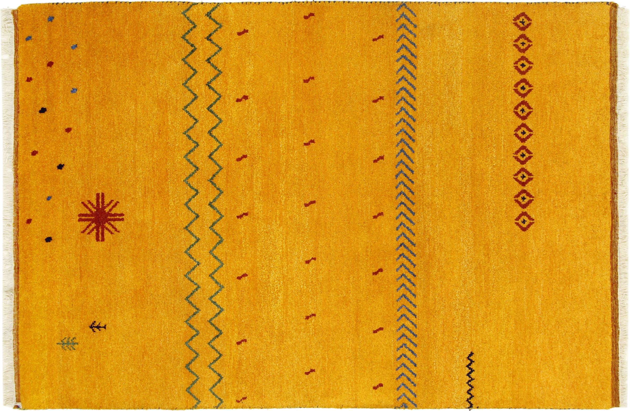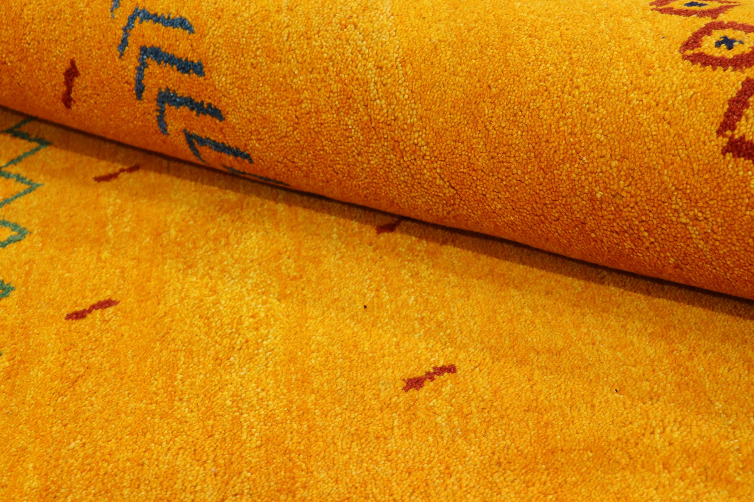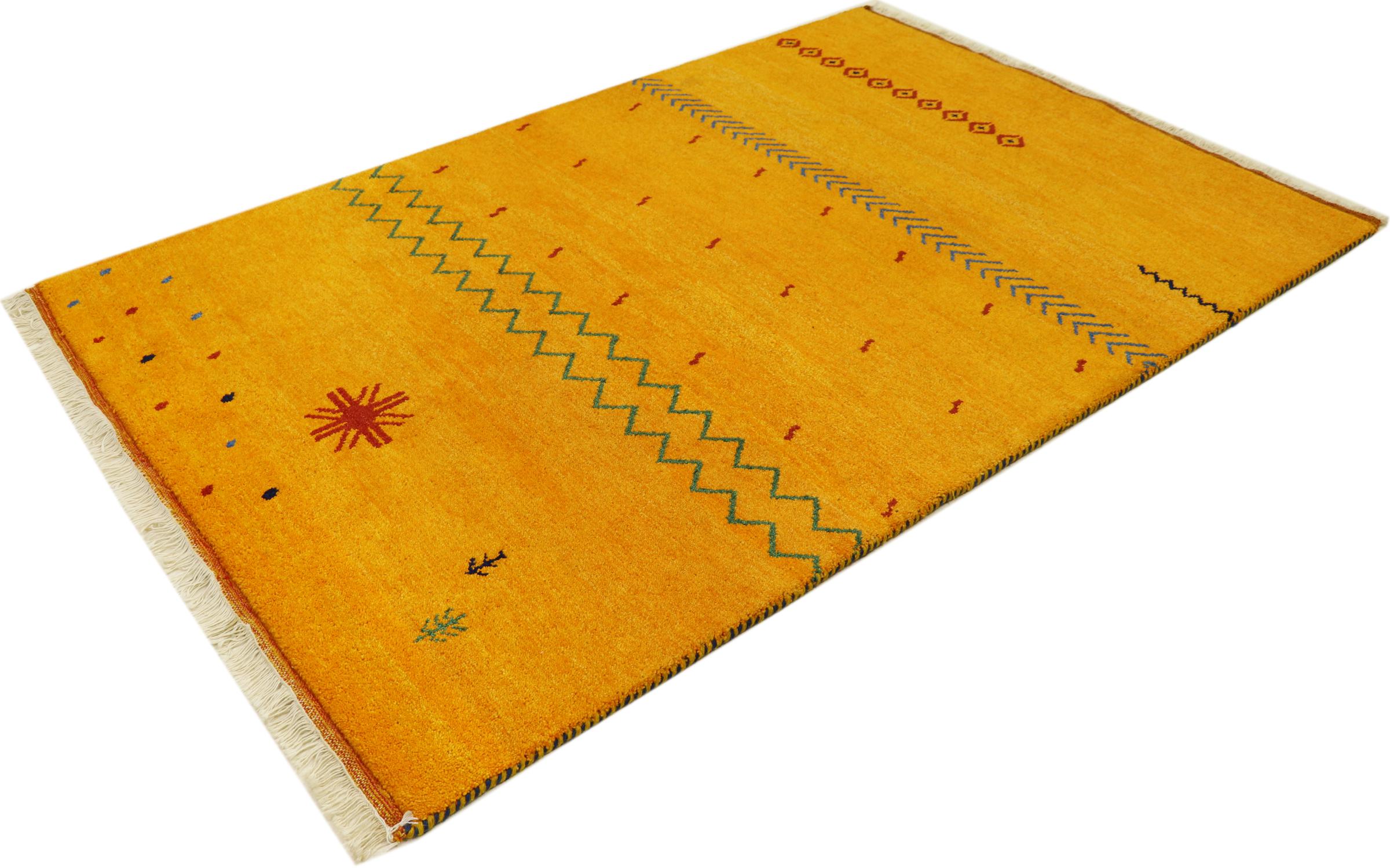 Esta hermosa alfombra de Gabbeh fue anudada a mano en la India. Las alfombras indias de Gabbeh están hechas de suave lana de oveja, son cómodas para los pies y tienen propiedades de aislamiento térmico. La mayoría de sus diseños son simples y modernos atemporales. Se inspiraron en los pueblos nómadas, que dejaban fluir en las alfombras motivos muy simples de su entorno. Las alfombras de Gabbeh de la India no se acercan mucho a la calidad de las de Gabbeh de Persia, pero tienen una muy buena relación precio-rendimiento. Por lo tanto, son perfectamente adecuadas como alfombras anudadas a mano para principiantes.