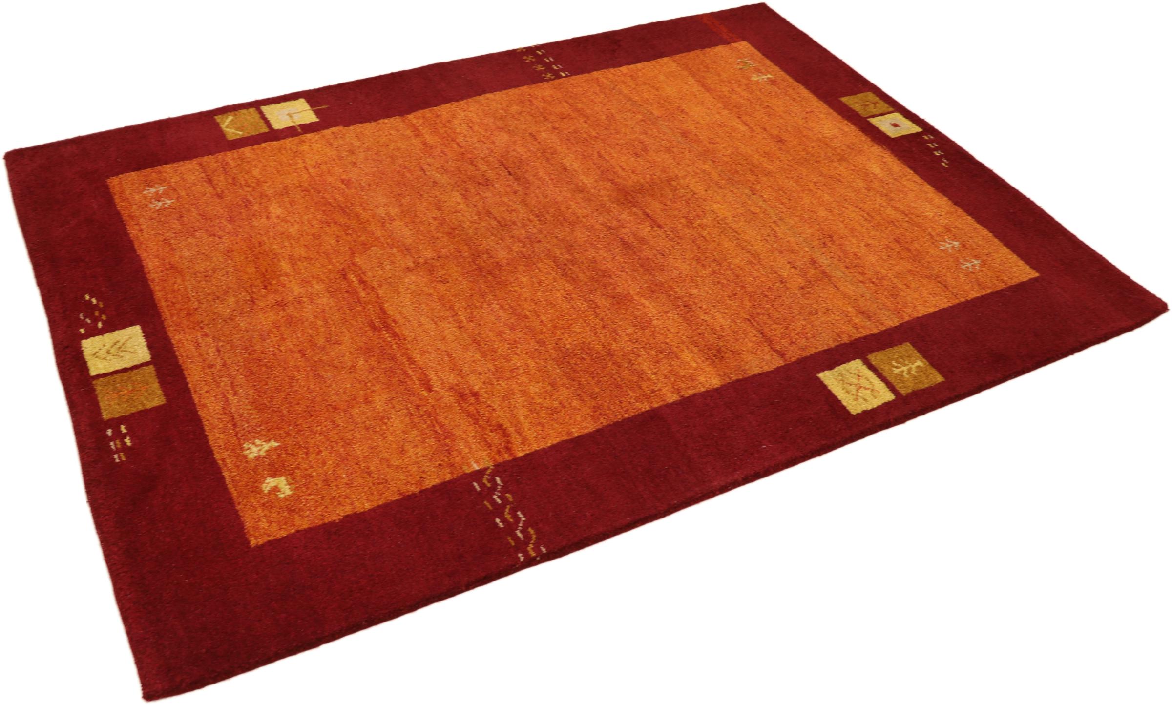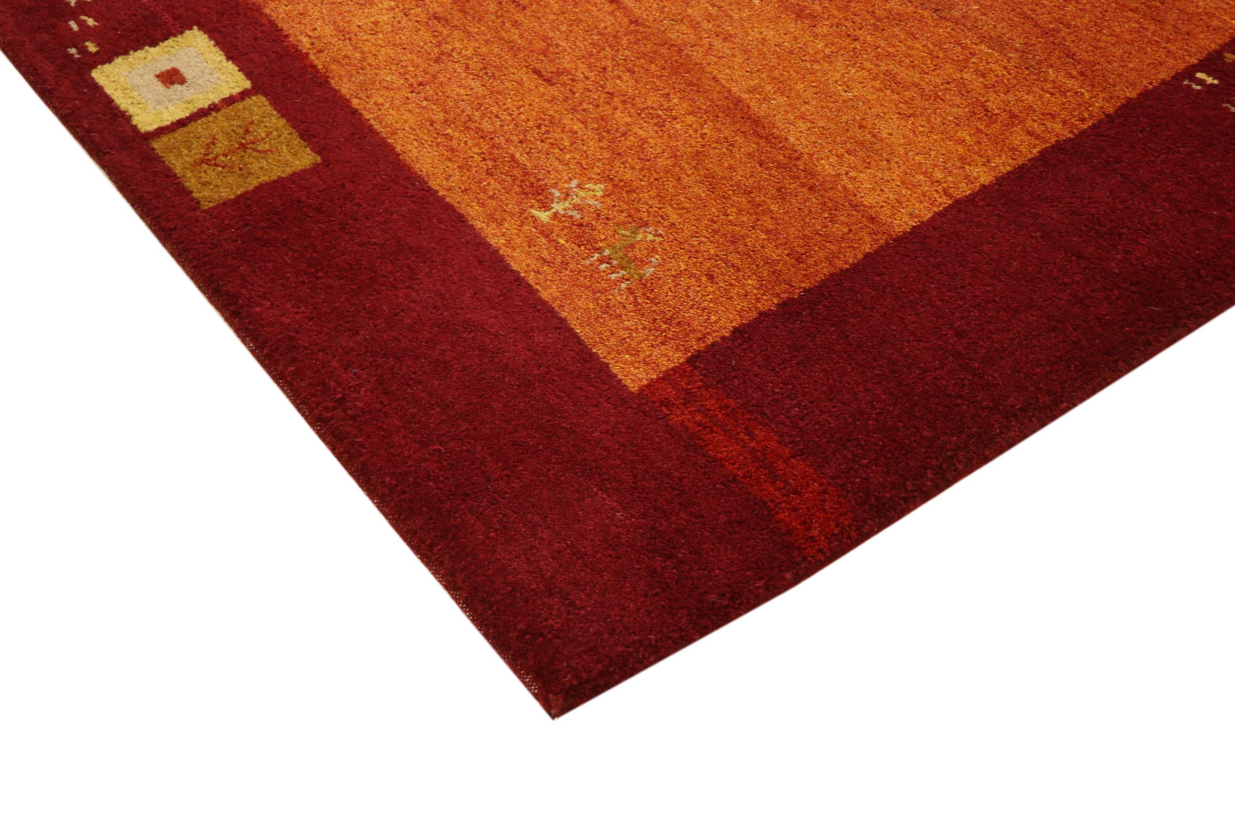 Esta hermosa alfombra de Gabbeh fue anudada a mano en la India. Las alfombras indias de Gabbeh están hechas de suave lana de oveja, son cómodas para los pies y tienen propiedades de aislamiento térmico. La mayoría de sus diseños son simples y modernos atemporales. Se inspiraron en los pueblos nómadas, que dejaban fluir en las alfombras motivos muy simples de su entorno. Las alfombras de Gabbeh de la India no se acercan mucho a la calidad de las de Gabbeh de Persia, pero tienen una muy buena relación precio-rendimiento. Por lo tanto, son perfectamente adecuadas como alfombras anudadas a mano para principiantes.