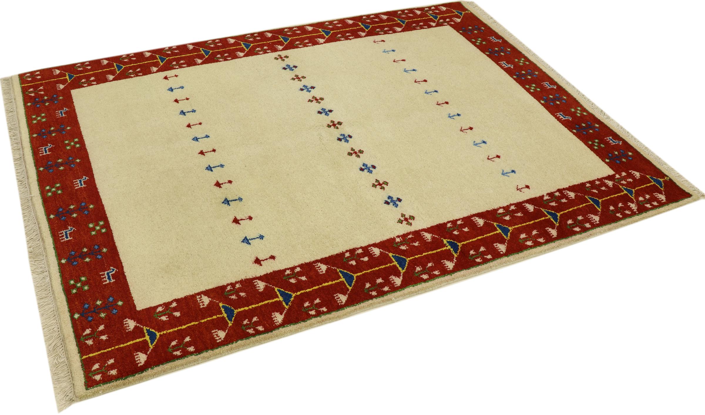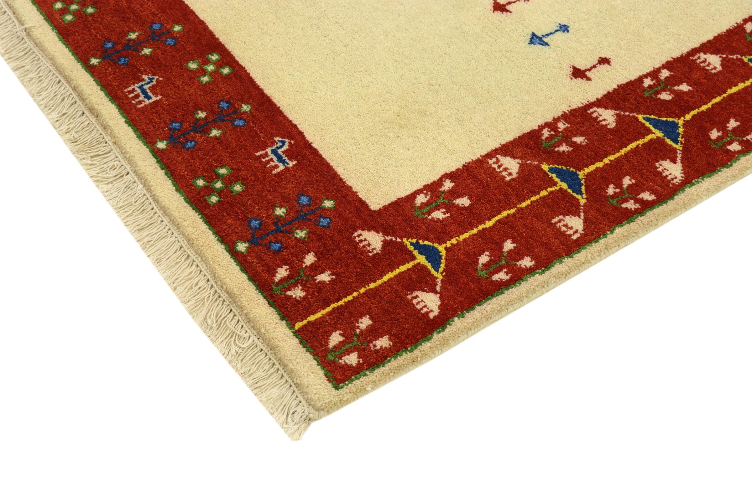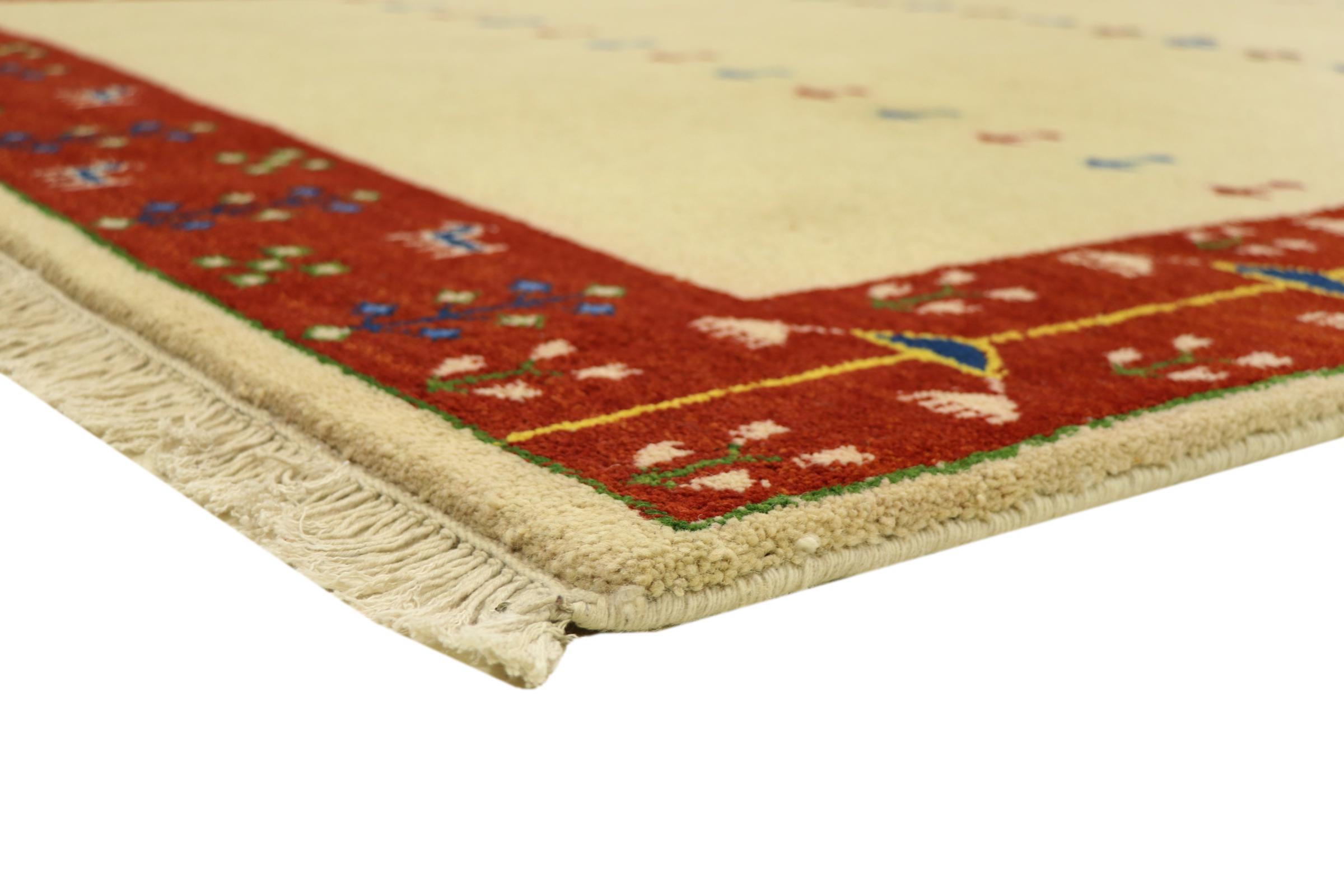 Esta hermosa alfombra de Gabbeh fue anudada a mano en la India. Las alfombras indias de Gabbeh están hechas de suave lana de oveja, son cómodas para los pies y tienen propiedades de aislamiento térmico. La mayoría de sus diseños son simples y modernos atemporales. Se inspiraron en los pueblos nómadas, que dejaban fluir en las alfombras motivos muy simples de su entorno. Las alfombras de Gabbeh de la India no se acercan mucho a la calidad de las de Gabbeh de Persia, pero tienen una muy buena relación precio-rendimiento. Por lo tanto, son perfectamente adecuadas como alfombras anudadas a mano para principiantes.