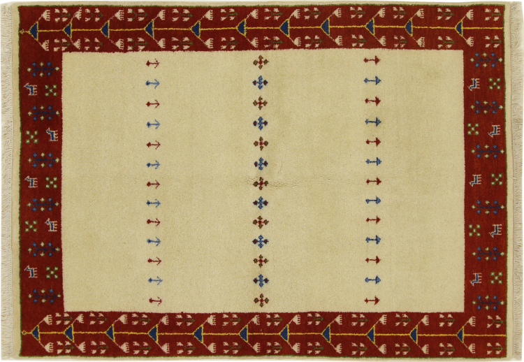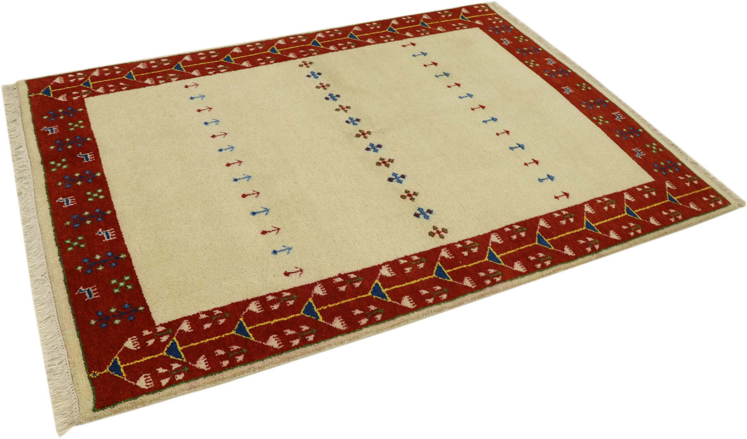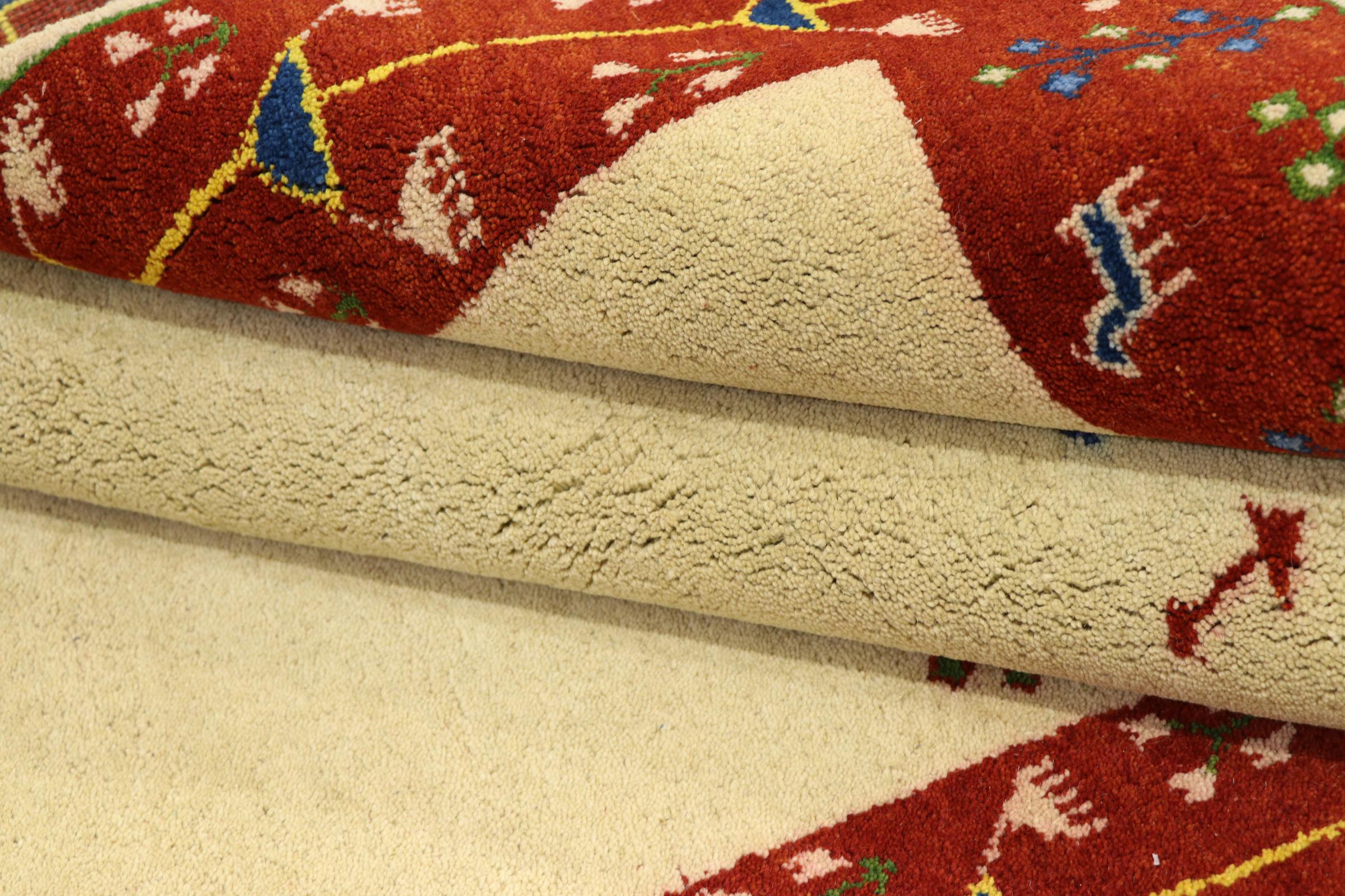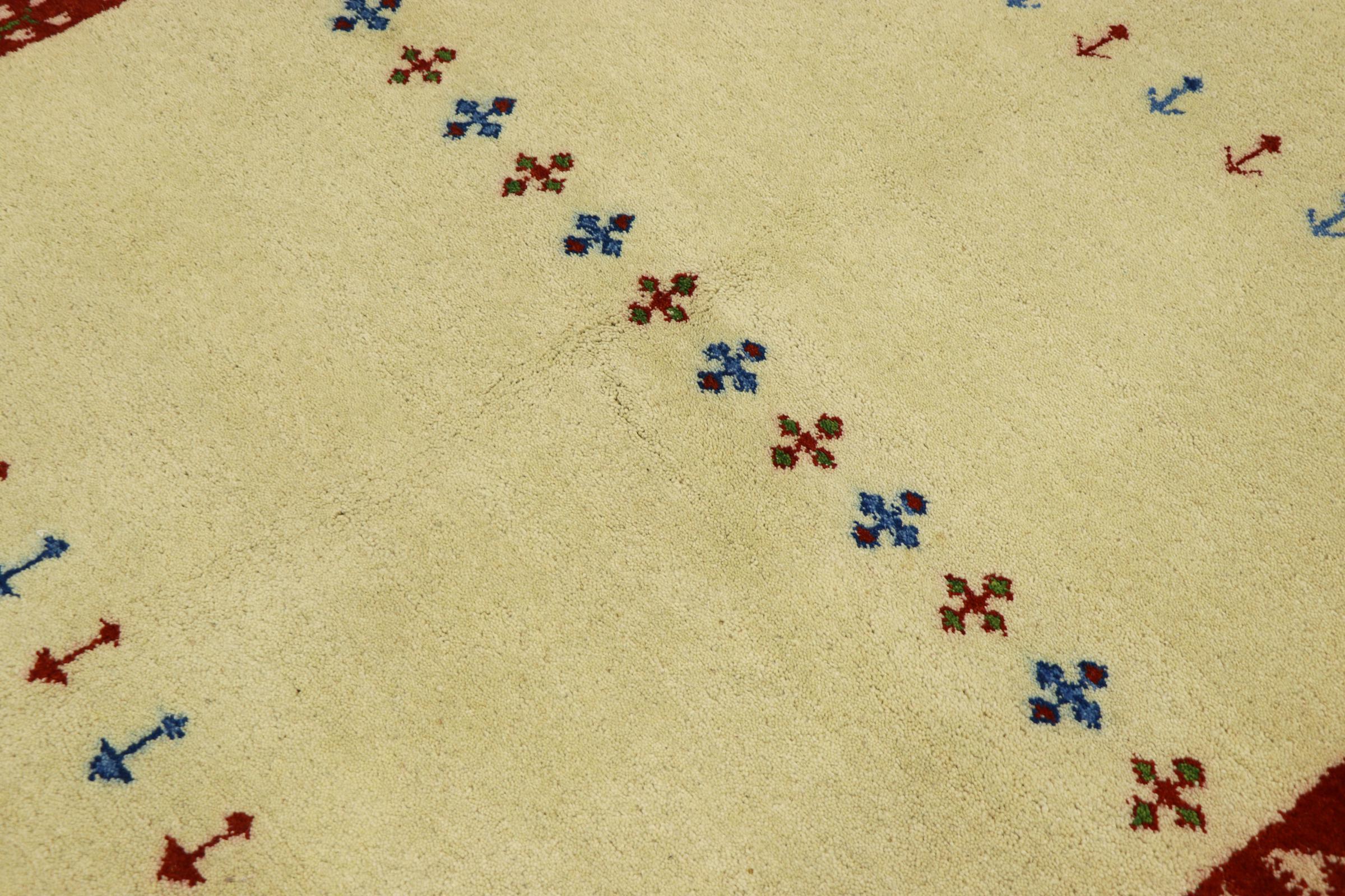 Esta hermosa alfombra de Gabbeh fue anudada a mano en la India. Las alfombras indias de Gabbeh están hechas de suave lana de oveja, son cómodas para los pies y tienen propiedades de aislamiento térmico. La mayoría de sus diseños son simples y modernos atemporales. Se inspiraron en los pueblos nómadas, que dejaban fluir en las alfombras motivos muy simples de su entorno. Las alfombras de Gabbeh de la India no se acercan mucho a la calidad de las de Gabbeh de Persia, pero tienen una muy buena relación precio-rendimiento. Por lo tanto, son perfectamente adecuadas como alfombras anudadas a mano para principiantes.