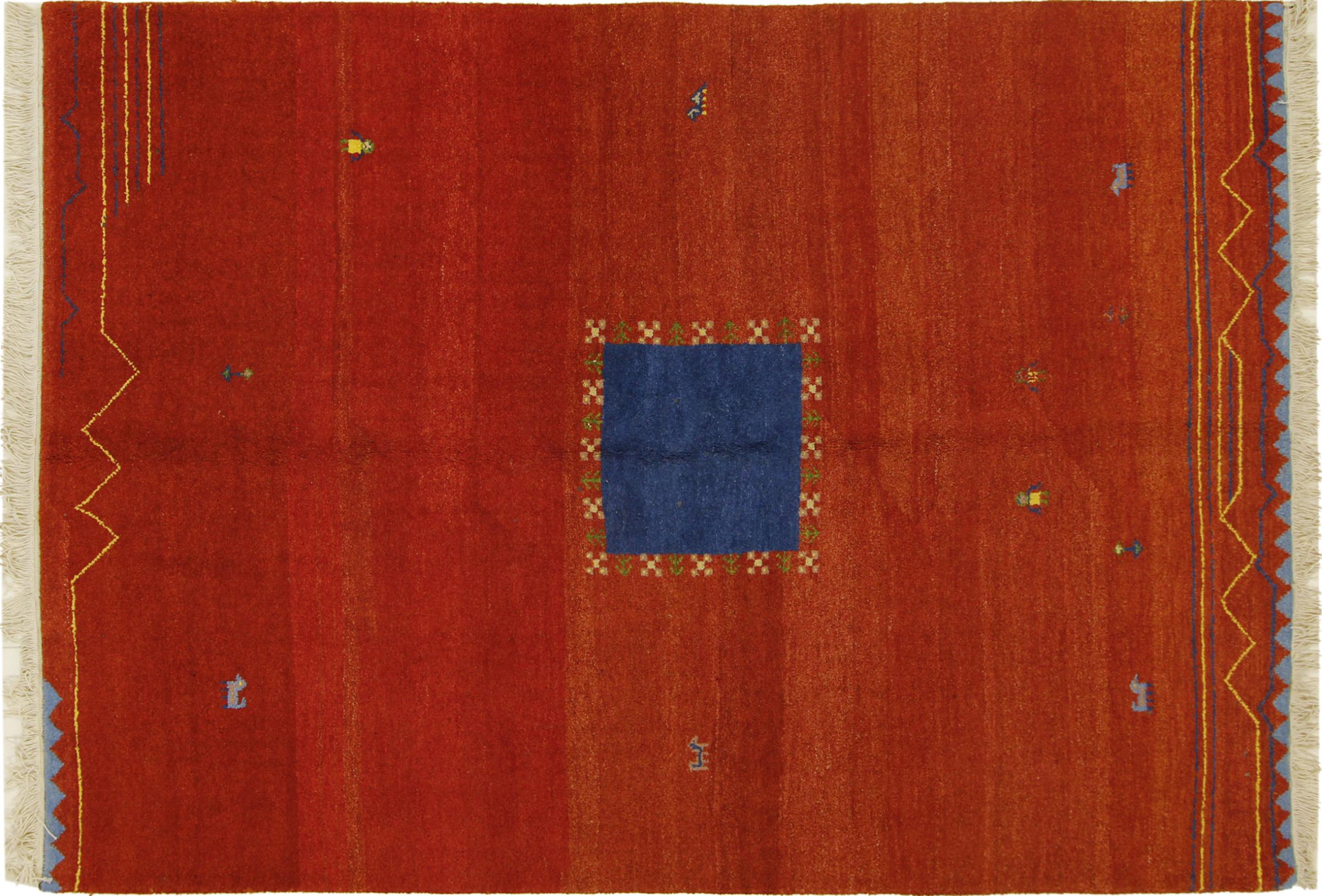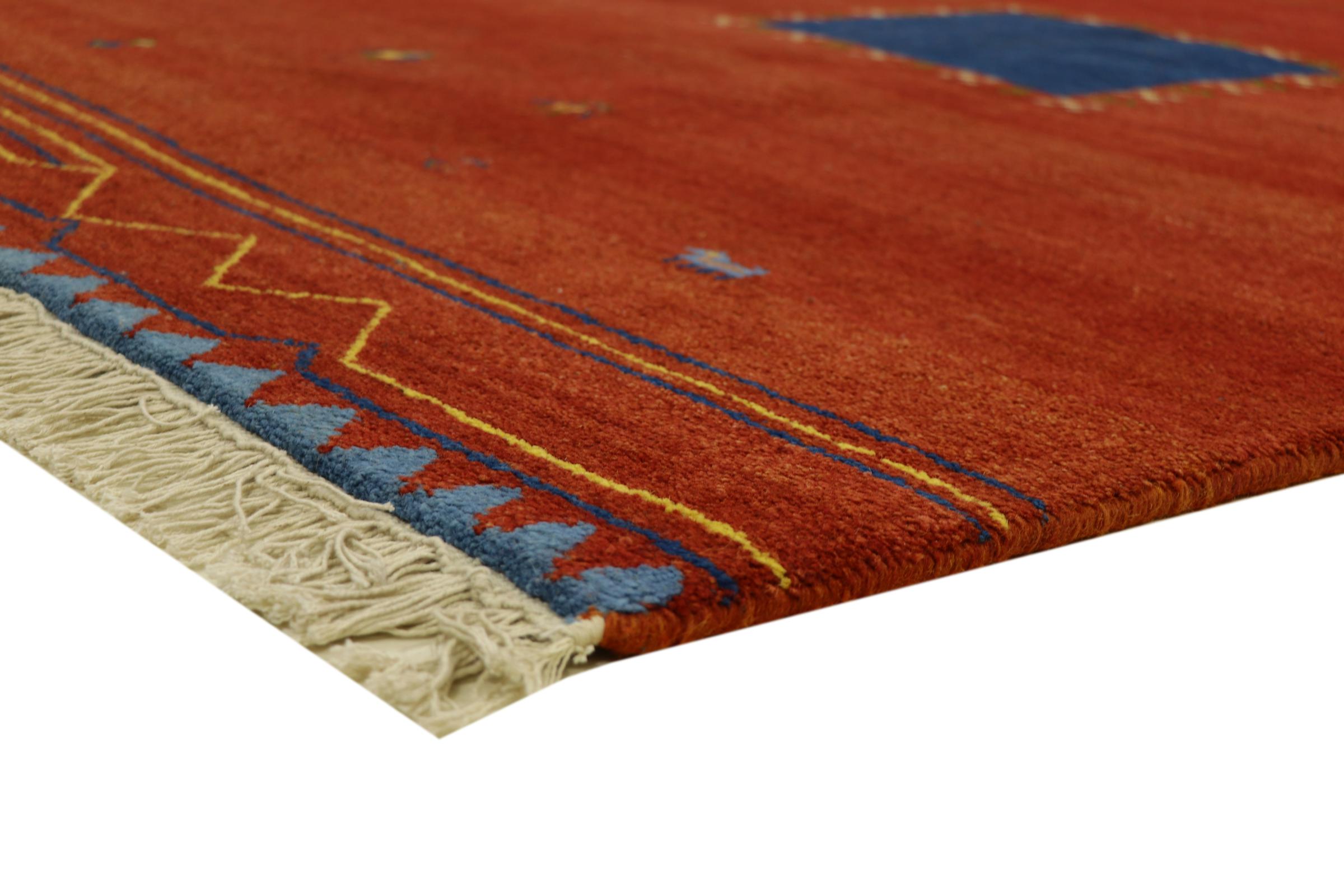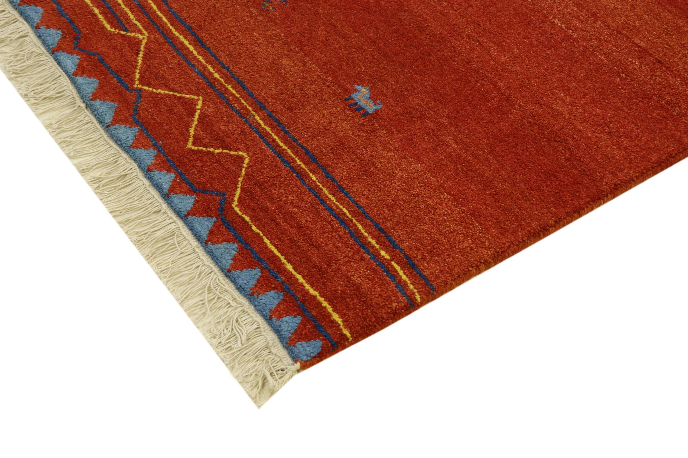 Esta hermosa alfombra de Gabbeh fue anudada a mano en la India. Las alfombras indias de Gabbeh están hechas de suave lana de oveja, son cómodas para los pies y tienen propiedades de aislamiento térmico. La mayoría de sus diseños son simples y modernos atemporales. Se inspiraron en los pueblos nómadas, que dejaban fluir en las alfombras motivos muy simples de su entorno. Las alfombras de Gabbeh de la India no se acercan mucho a la calidad de las de Gabbeh de Persia, pero tienen una muy buena relación precio-rendimiento. Por lo tanto, son perfectamente adecuadas como alfombras anudadas a mano para principiantes.
