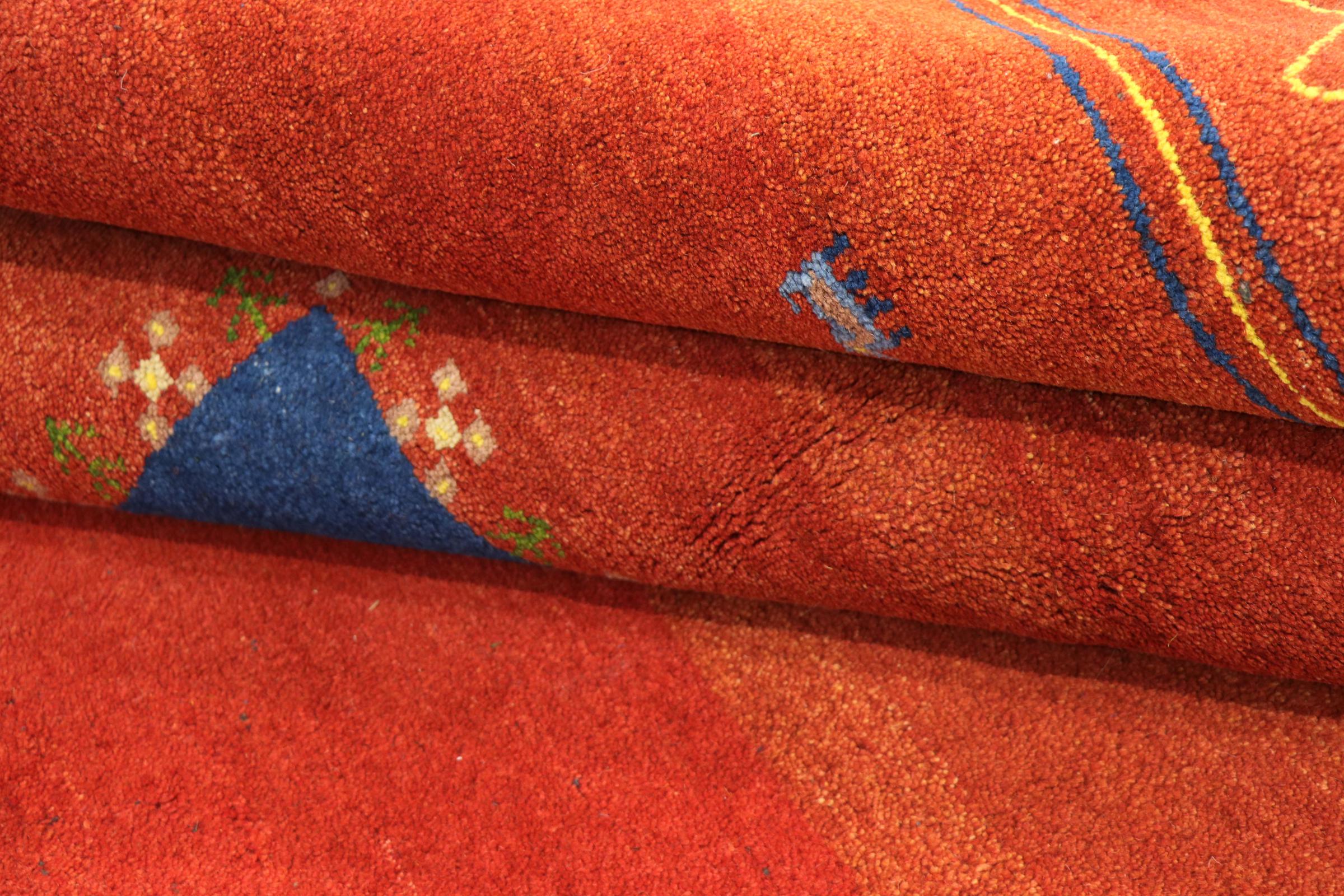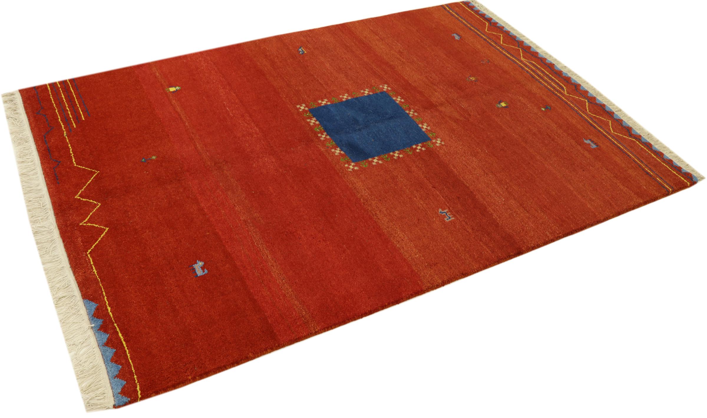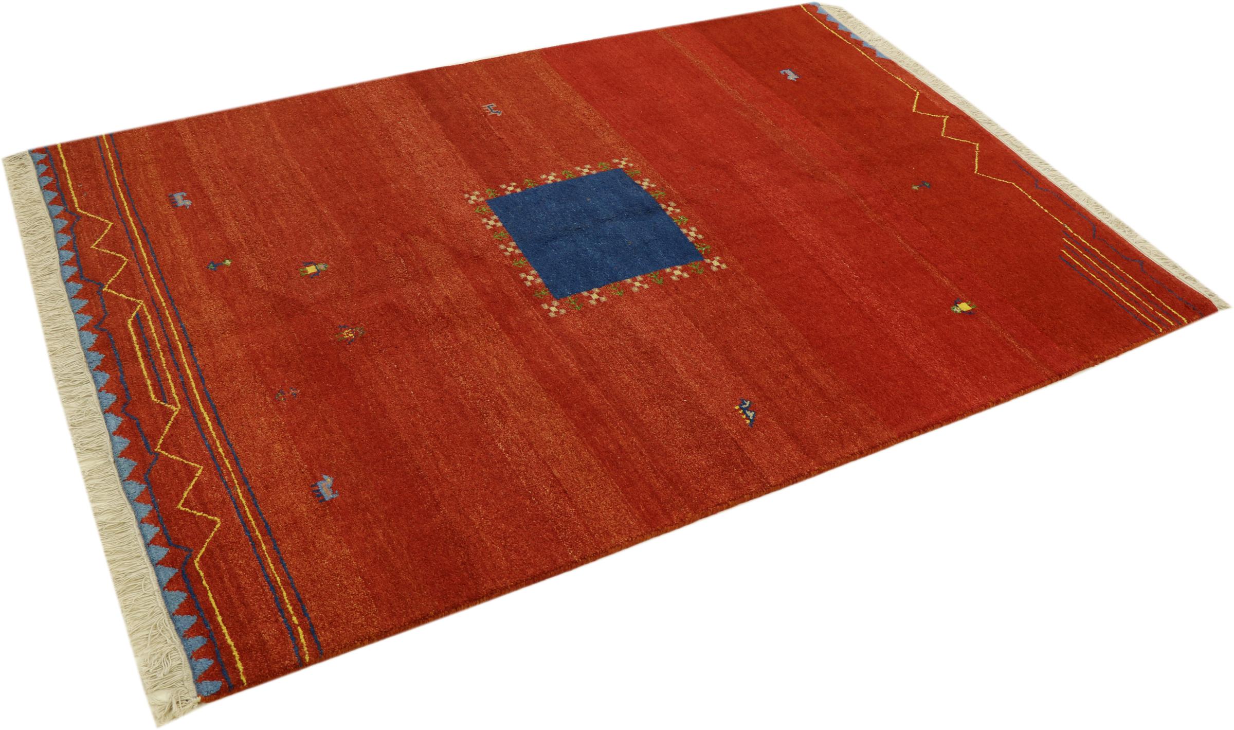 Esta hermosa alfombra de Gabbeh fue anudada a mano en la India. Las alfombras indias de Gabbeh están hechas de suave lana de oveja, son cómodas para los pies y tienen propiedades de aislamiento térmico. La mayoría de sus diseños son simples y modernos atemporales. Se inspiraron en los pueblos nómadas, que dejaban fluir en las alfombras motivos muy simples de su entorno. Las alfombras de Gabbeh de la India no se acercan mucho a la calidad de las de Gabbeh de Persia, pero tienen una muy buena relación precio-rendimiento. Por lo tanto, son perfectamente adecuadas como alfombras anudadas a mano para principiantes.