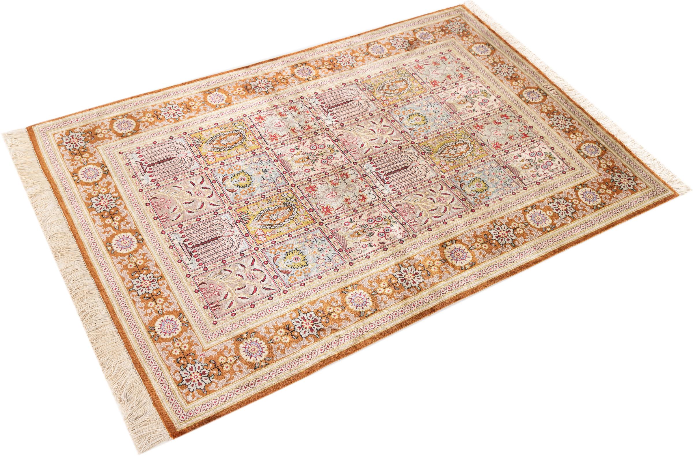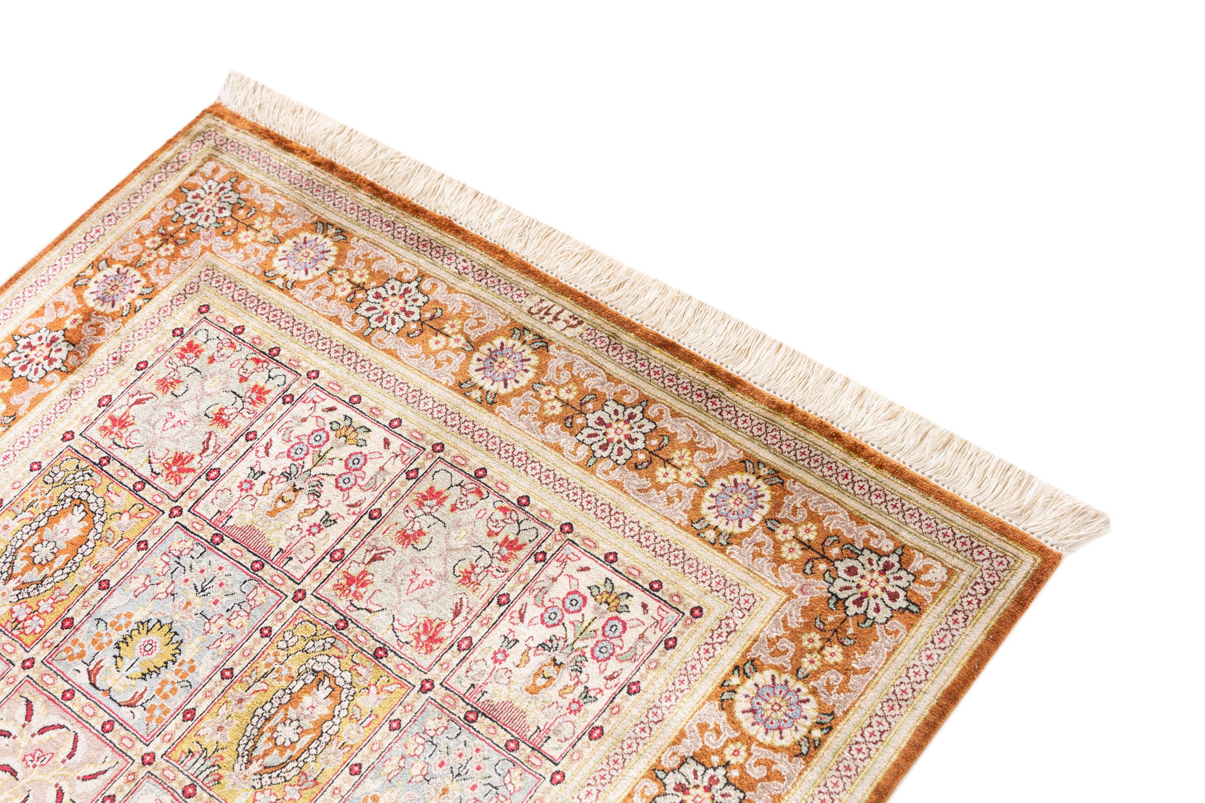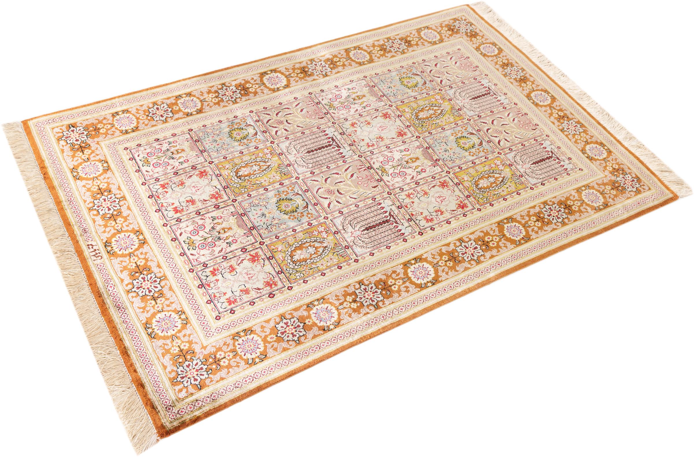 Alfombra número: 1223100103 Tamaño: 150x100 cm Espesor: alrededor de 4 mm Nudos: 1 000 000 / m² Elaboración: Anudado a mano Crespón: Seda Urdimbre: Seda Origen: Persia / Iran Edad: Nuevo Peso: alrededor de 3 kg Cantidad en stock: Única - Solo 1 en stock