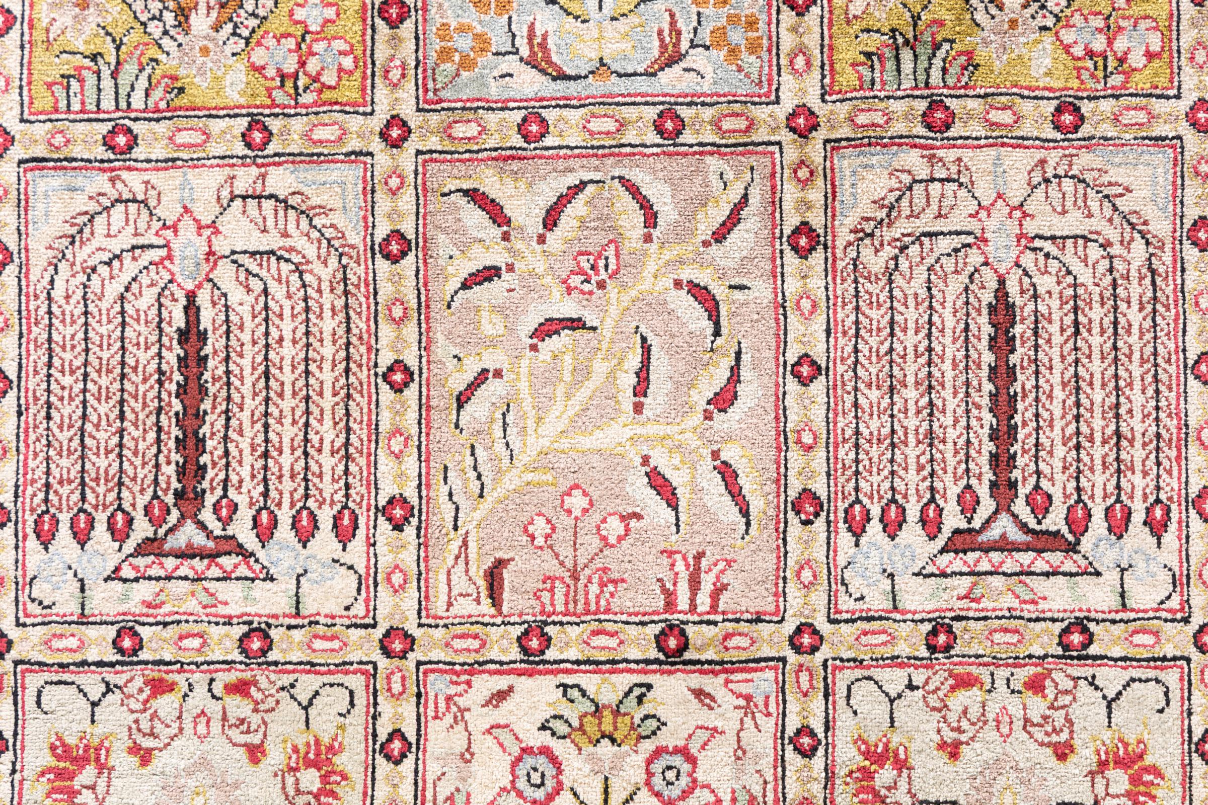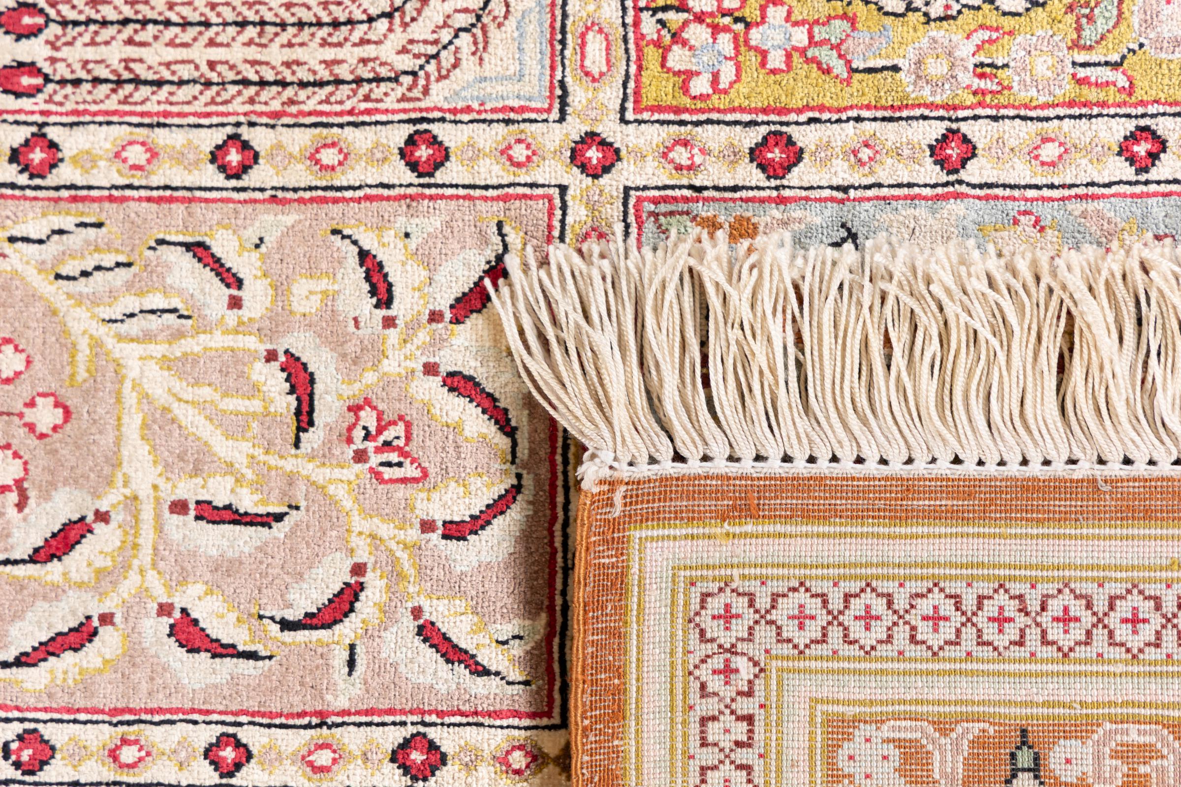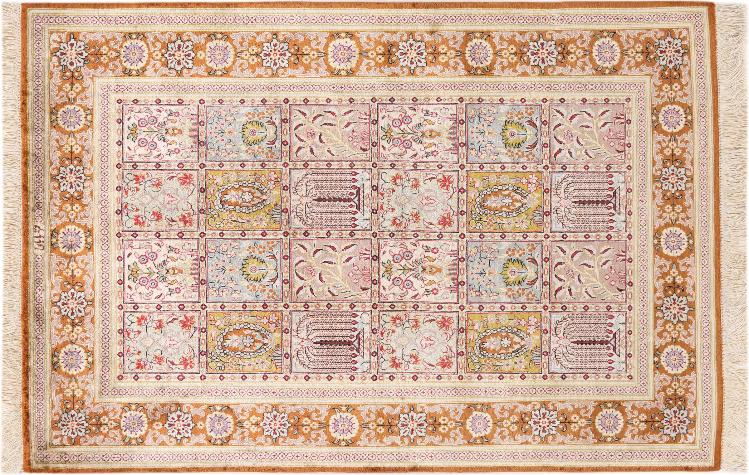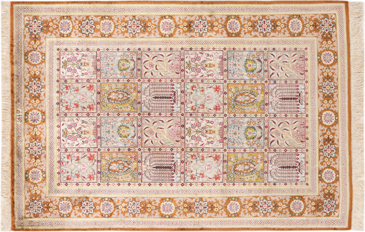 Alfombra número: 1223100103 Tamaño: 150x100 cm Espesor: alrededor de 4 mm Nudos: 1 000 000 / m² Elaboración: Anudado a mano Crespón: Seda Urdimbre: Seda Origen: Persia / Iran Edad: Nuevo Peso: alrededor de 3 kg Cantidad en stock: Única - Solo 1 en stock