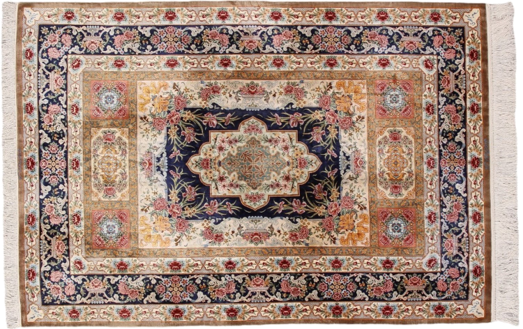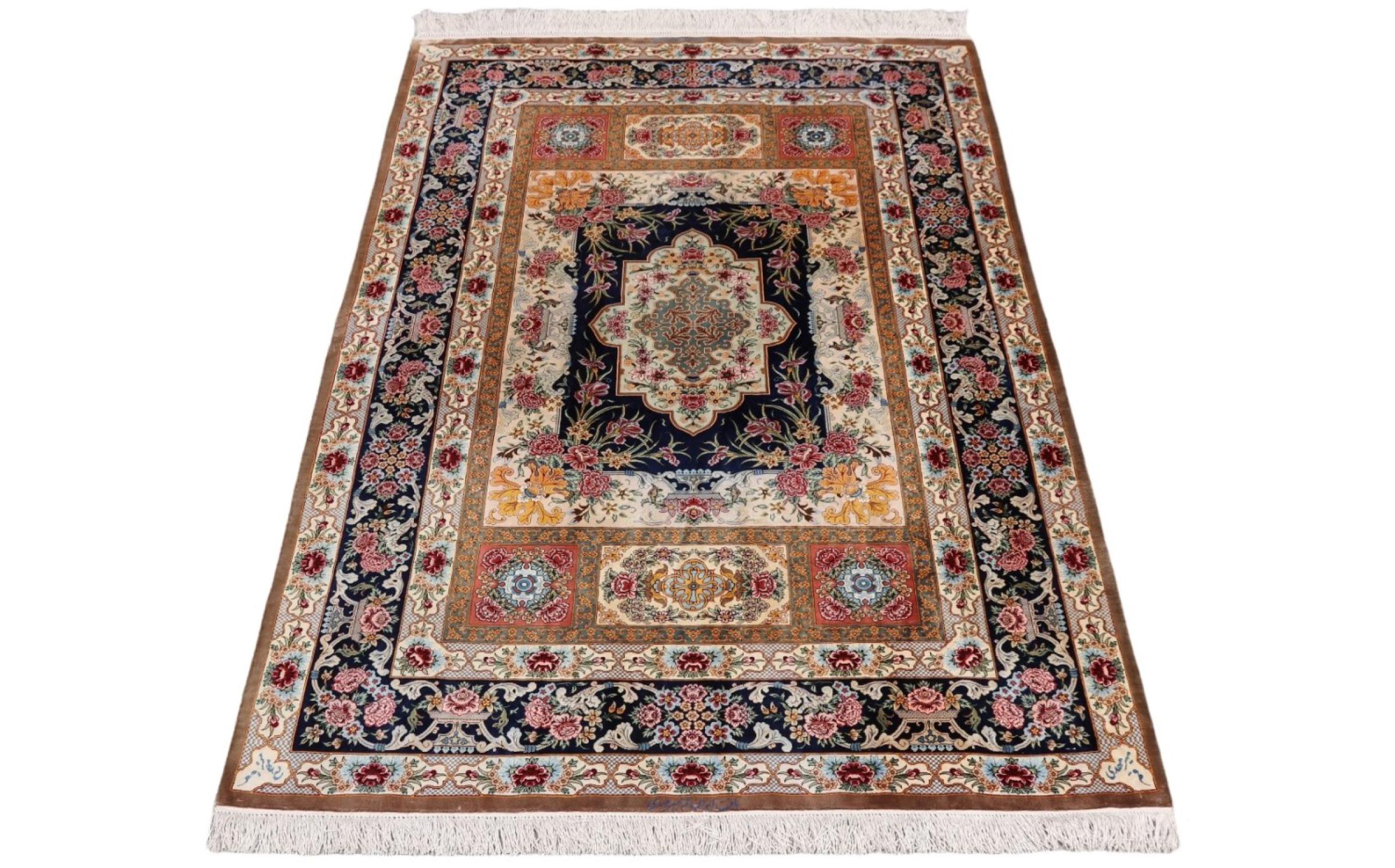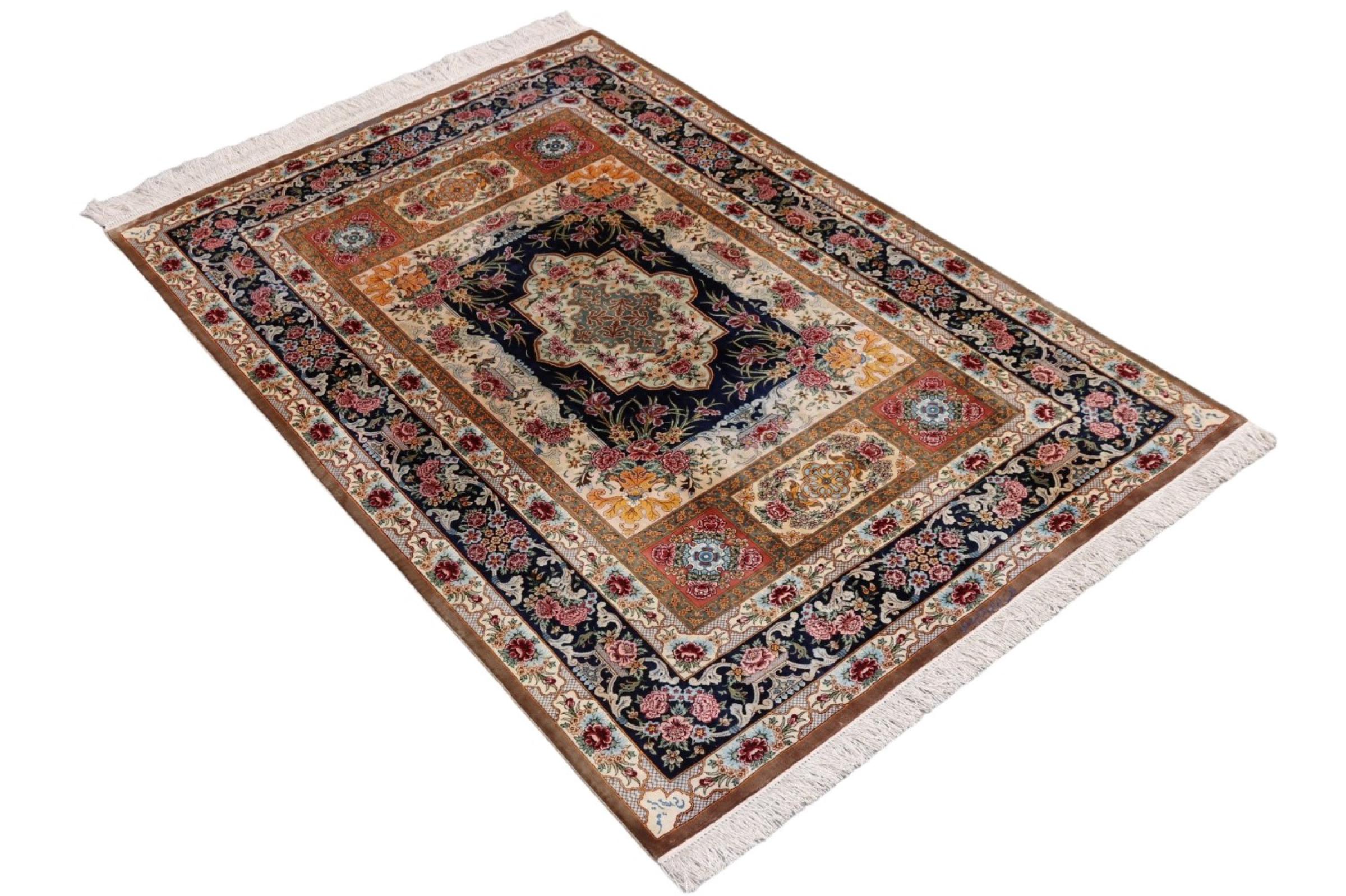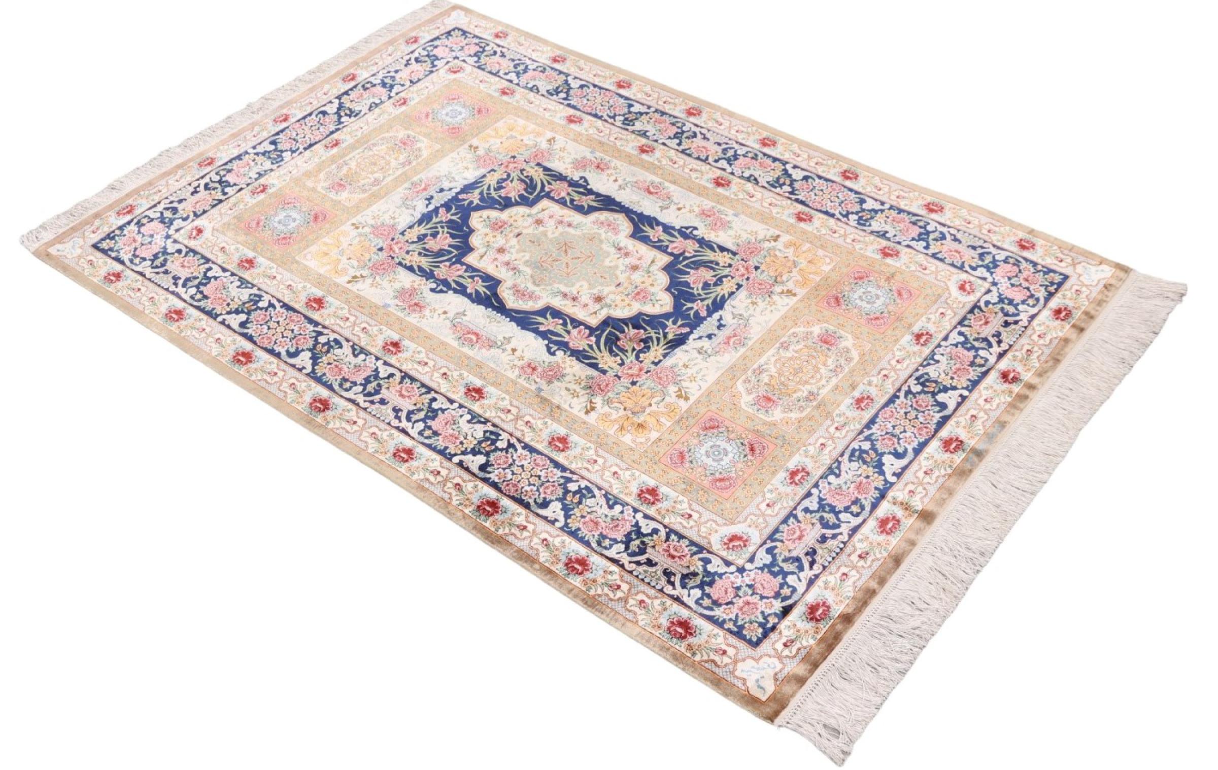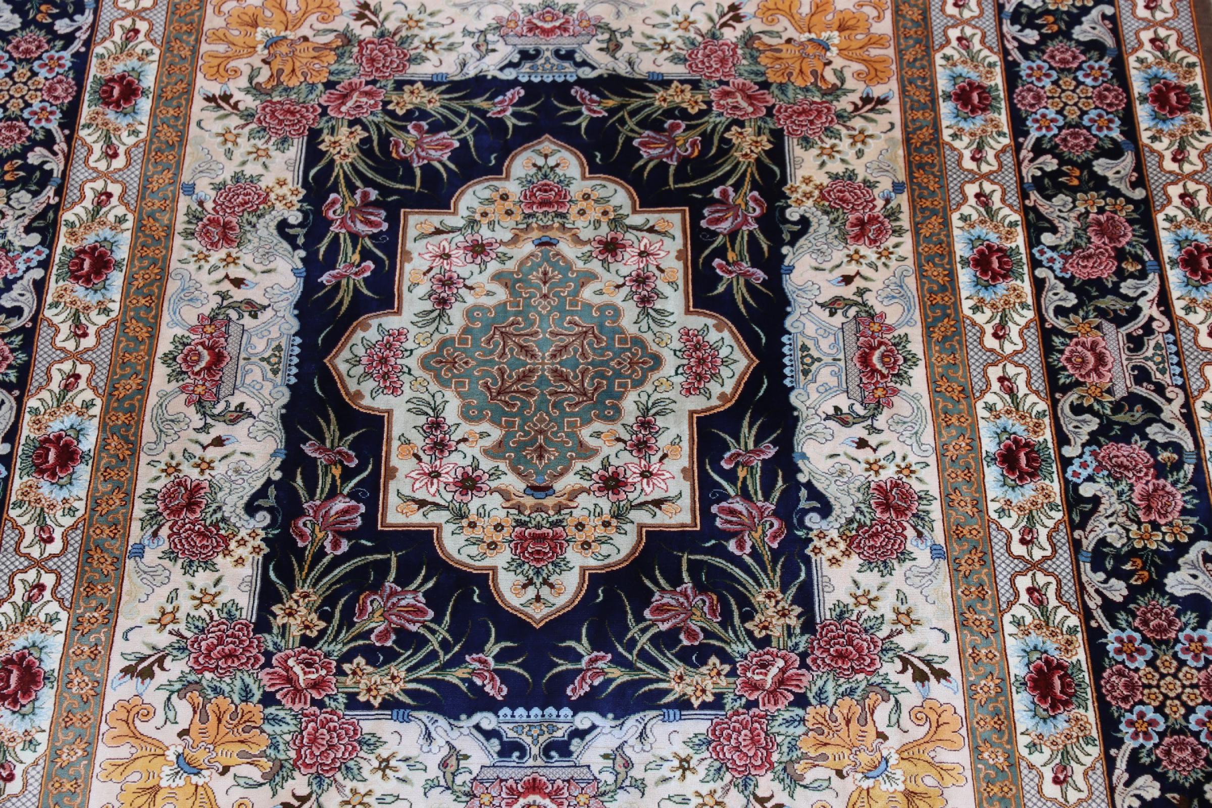 Alfombra número: 262514005877670 Tamaño: 147x100 cm Espesor: alrededor de 3 mm Nudos: 1 080 000 - 1 200 000 / m² Elaboración: Anudado a mano Crespón: Seda Urdimbre: Algodón Origen: Persia / Iran Edad: Nuevo Peso: alrededor de 3 kg Cantidad en stock: Única - Solo 1 en stock