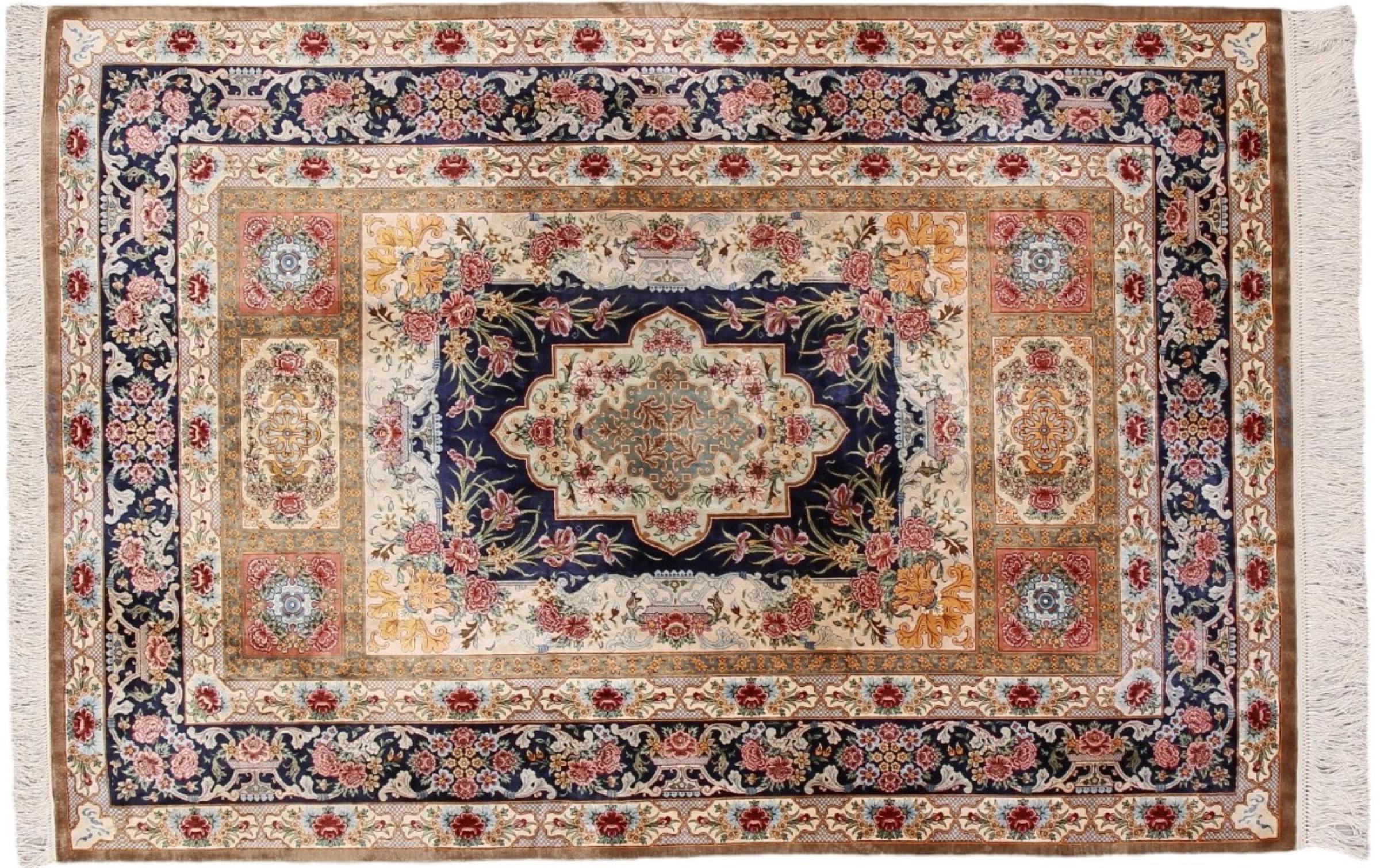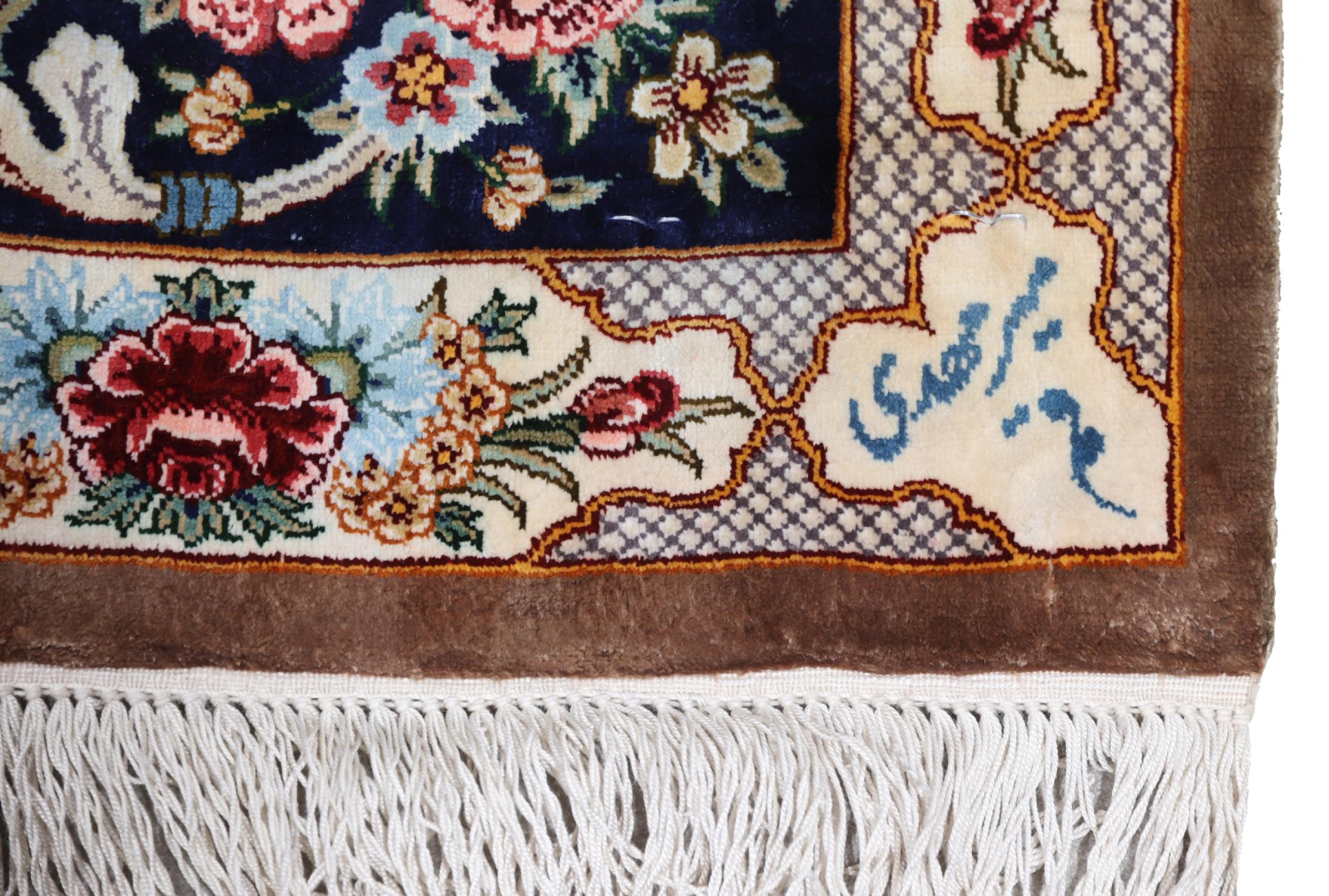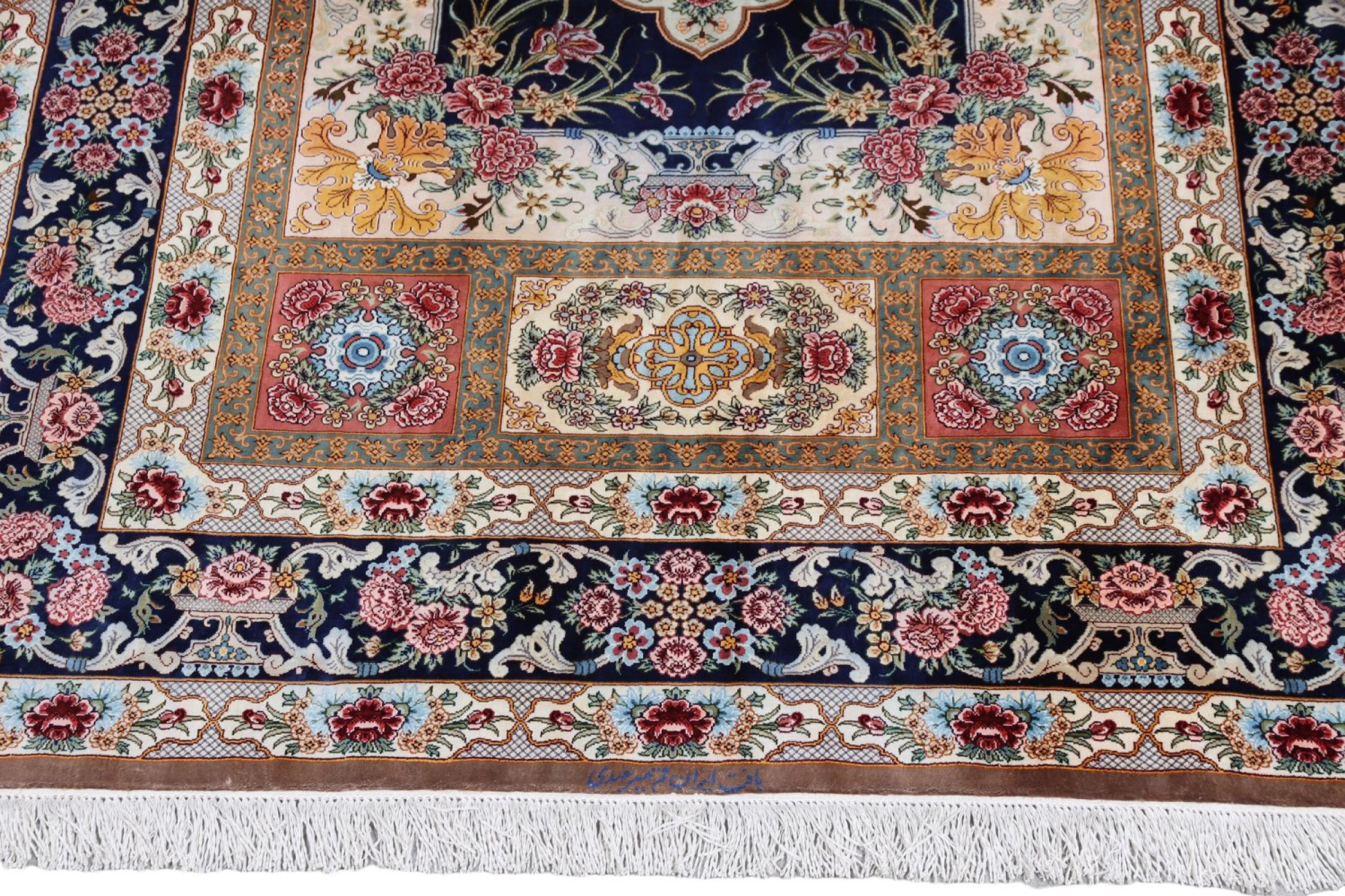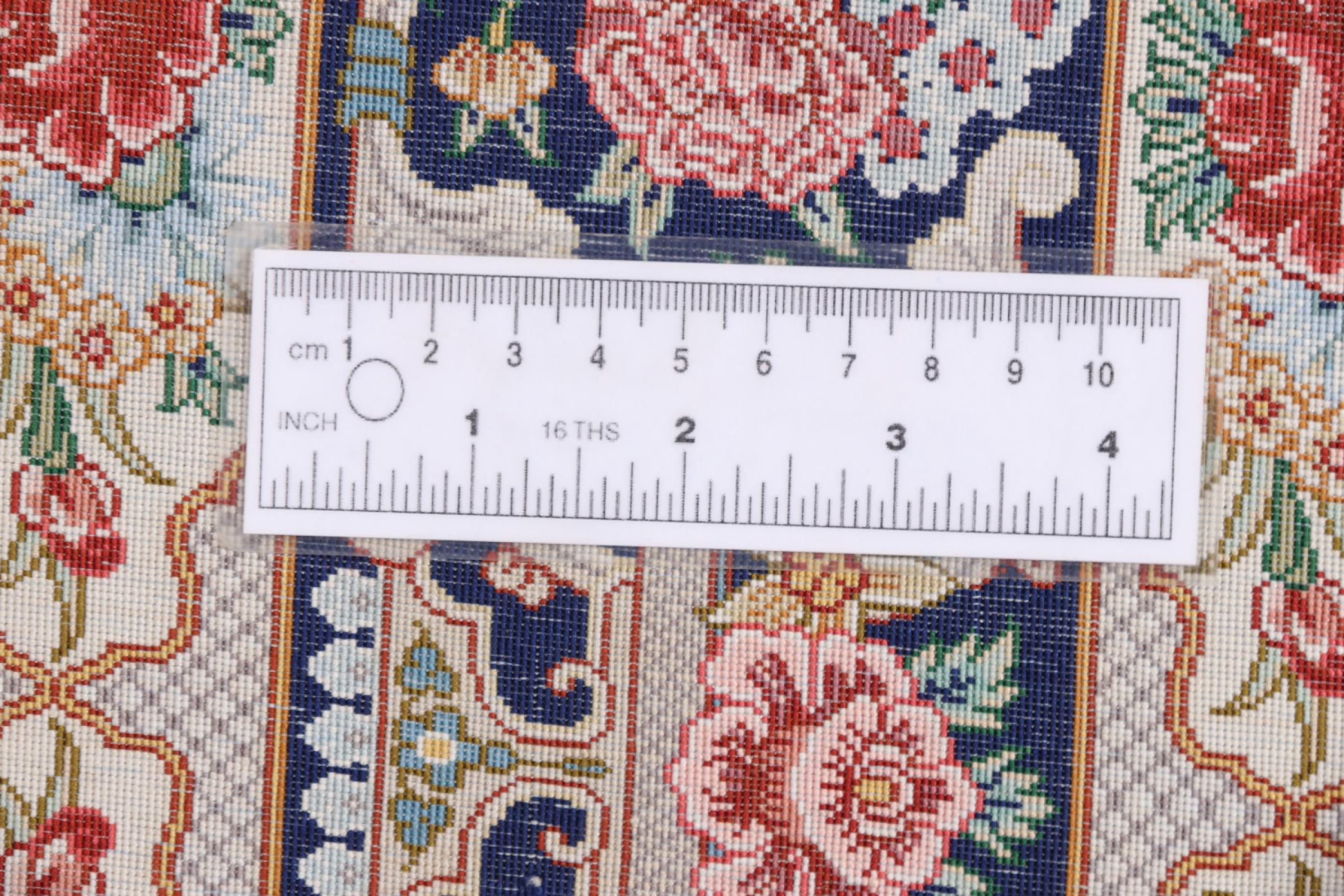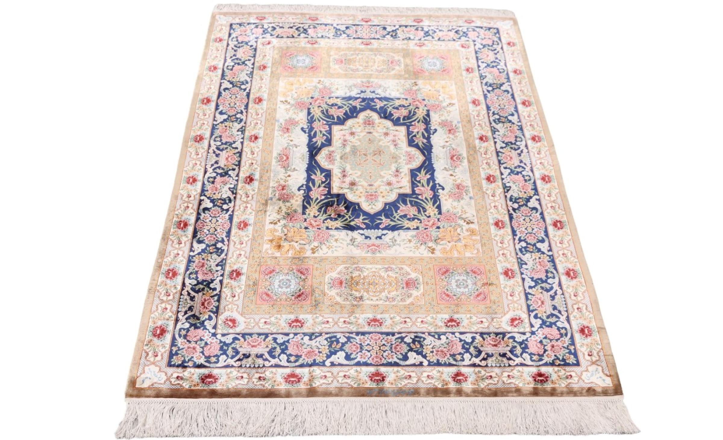 Alfombra número: 262514005877670 Tamaño: 147x100 cm Espesor: alrededor de 3 mm Nudos: 1 080 000 - 1 200 000 / m² Elaboración: Anudado a mano Crespón: Seda Urdimbre: Algodón Origen: Persia / Iran Edad: Nuevo Peso: alrededor de 3 kg Cantidad en stock: Única - Solo 1 en stock