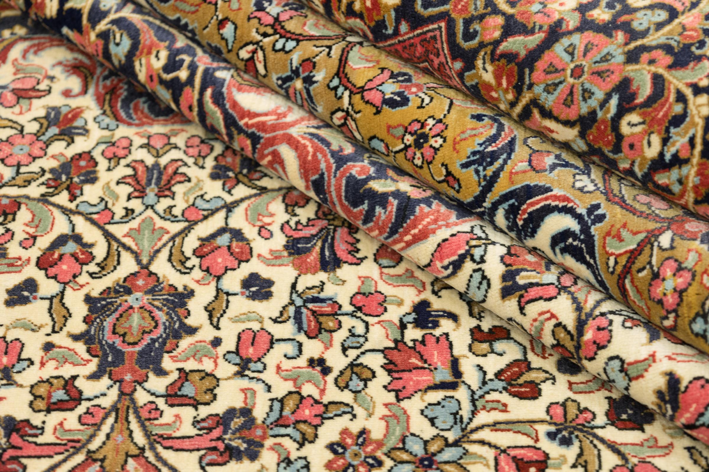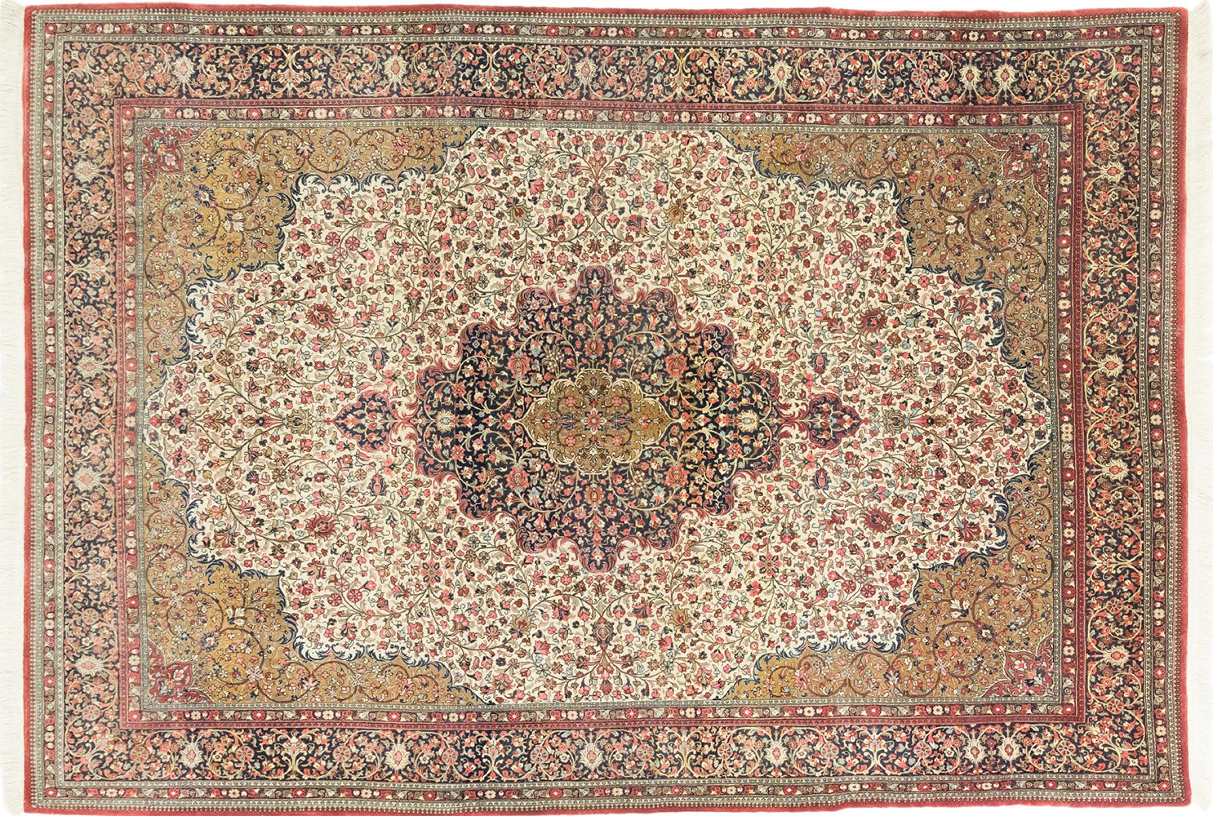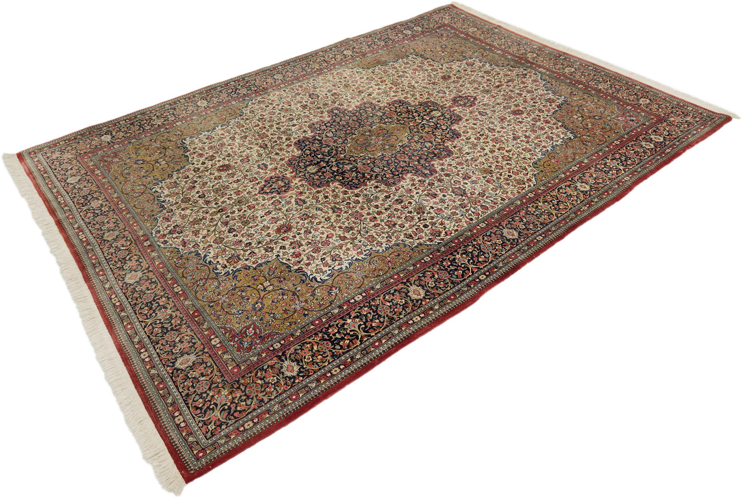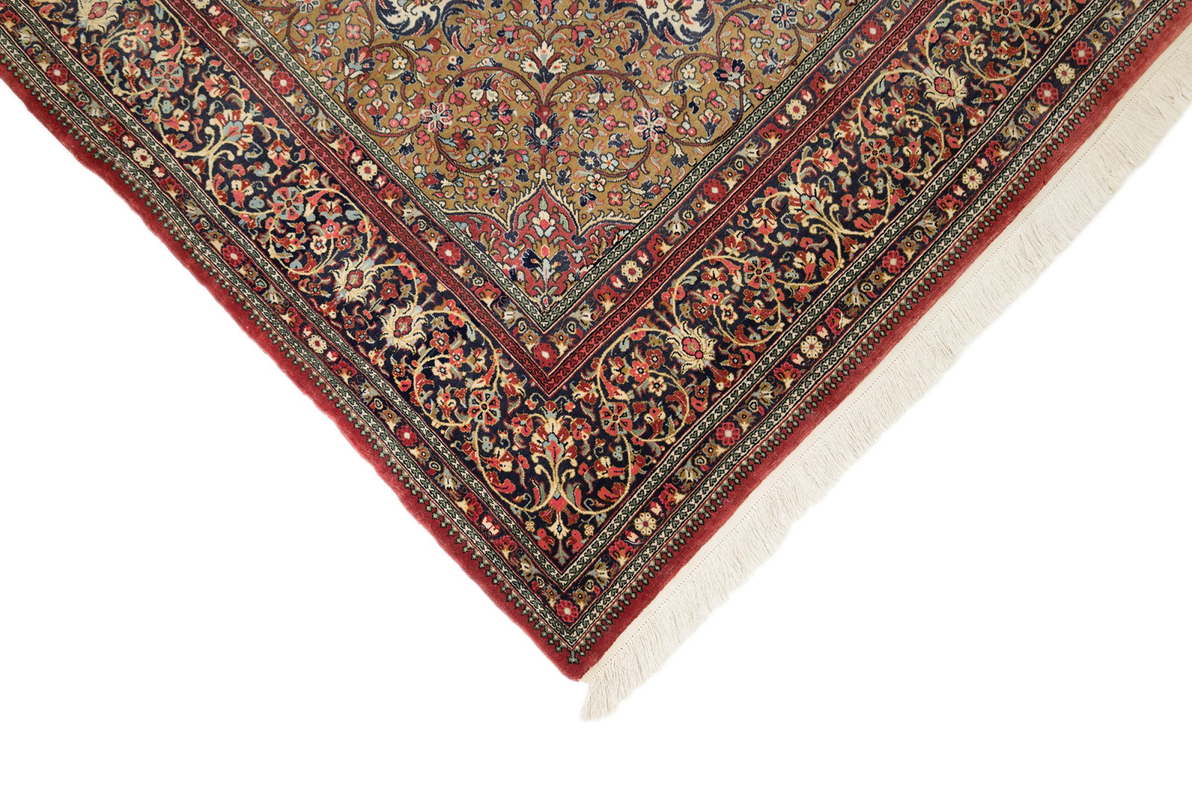 Esta Ghom Cork es una verdadera obra de arte de la artesanía. Su fino terciopelo y su urdimbre complacen a cualquier conocedor de alfombras. Esta alfombra persa fue elaborada en la ciudad santa de Ghom, con la más fina lana de corcho existente. Sus motivos y diseño hacen palpitar corazones. Una alfombra persa no podría ser más hermosa.
