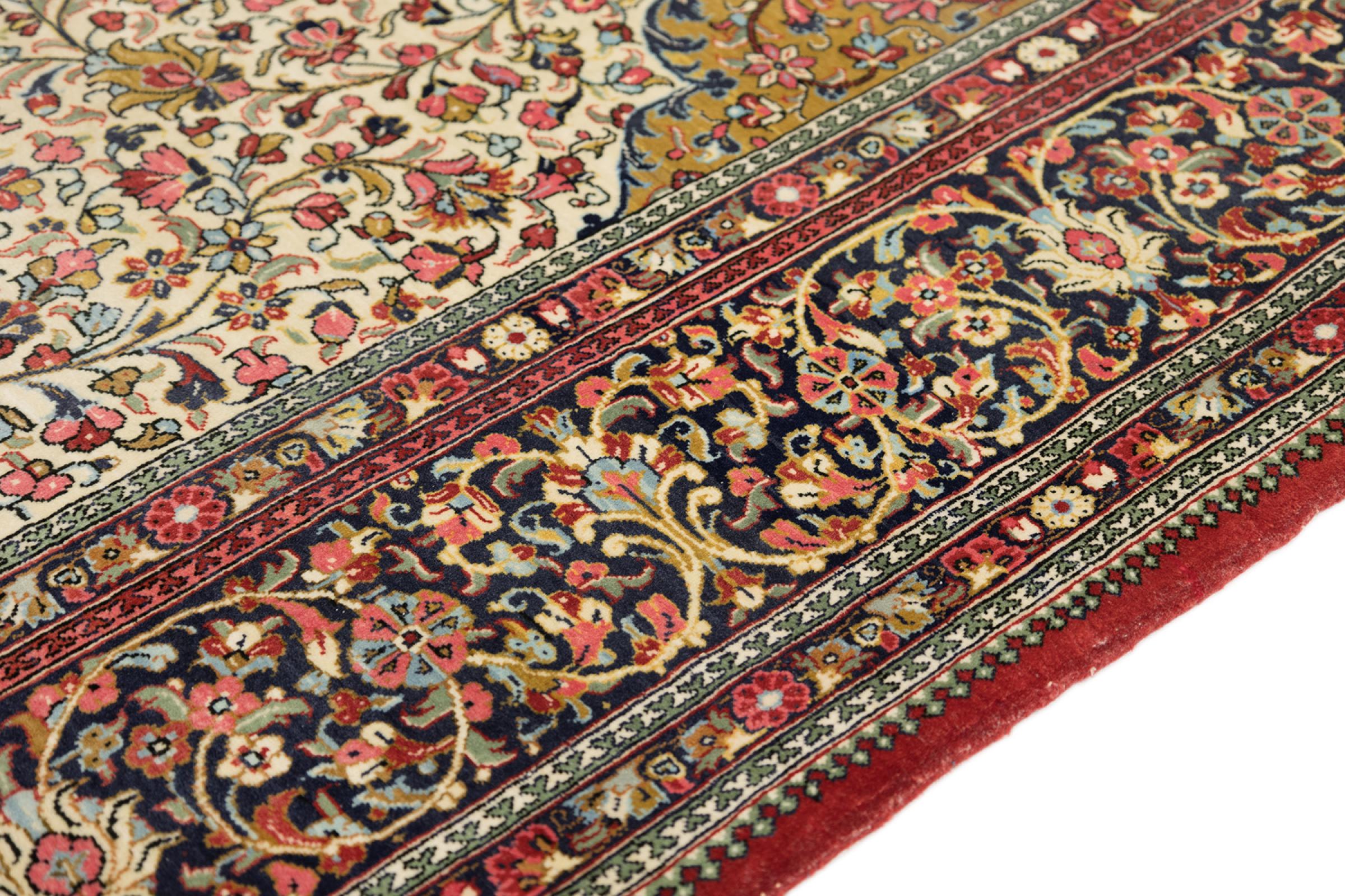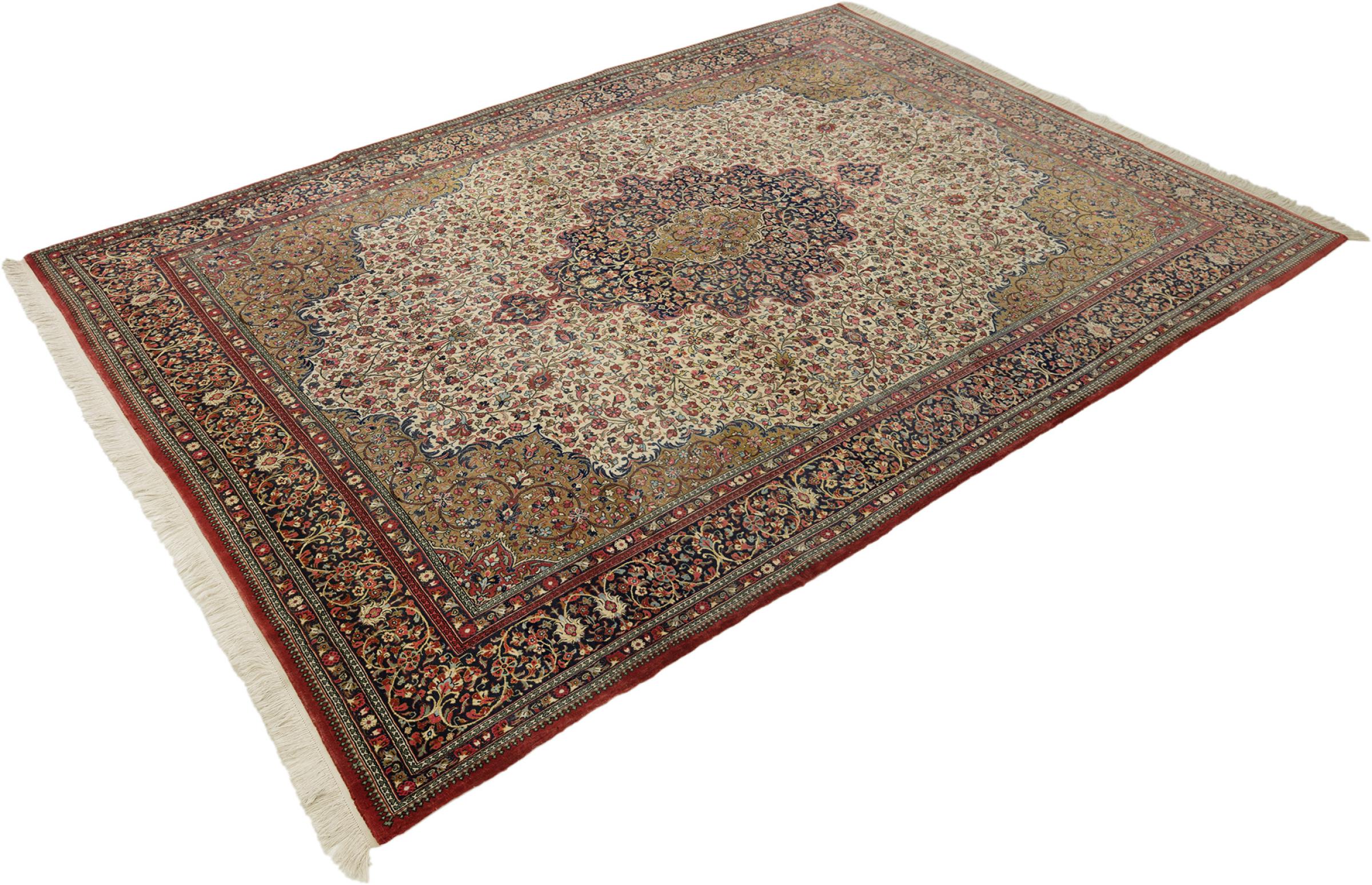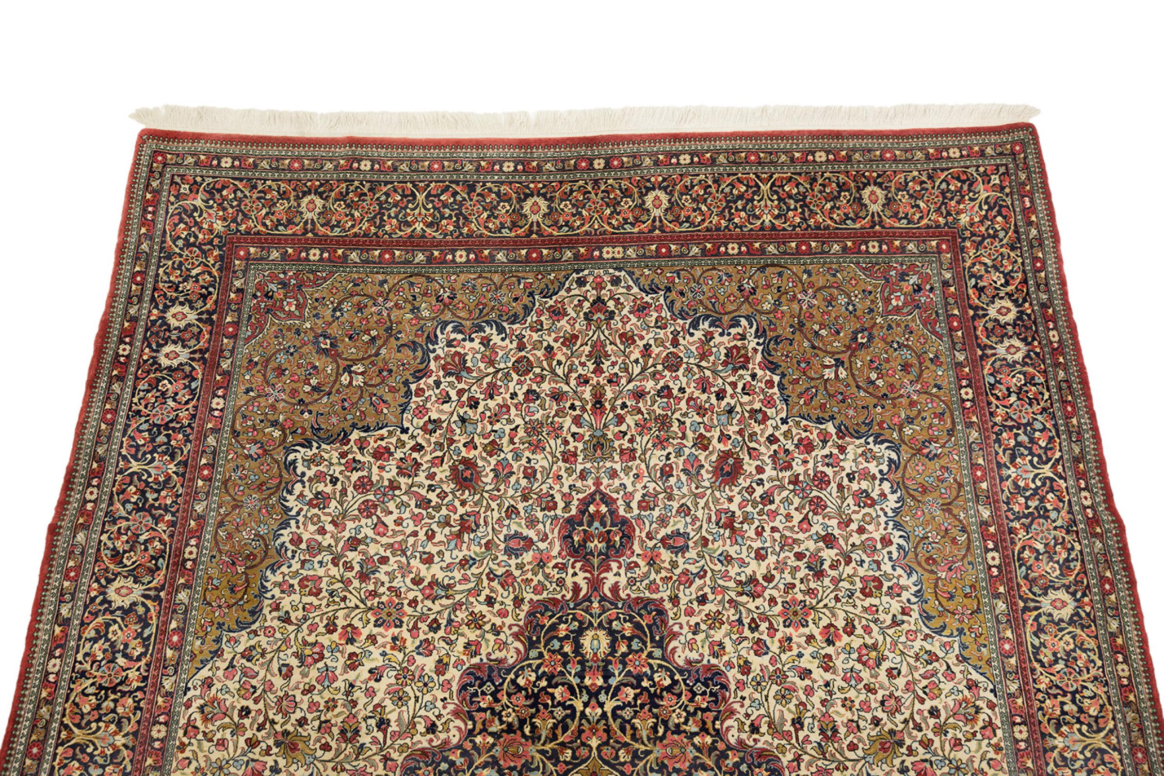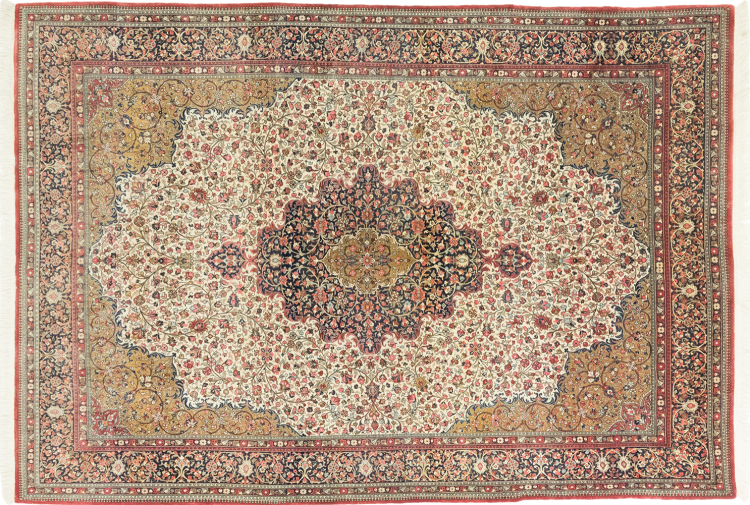 Esta Ghom Cork es una verdadera obra de arte de la artesanía. Su fino terciopelo y su urdimbre complacen a cualquier conocedor de alfombras. Esta alfombra persa fue elaborada en la ciudad santa de Ghom, con la más fina lana de corcho existente. Sus motivos y diseño hacen palpitar corazones. Una alfombra persa no podría ser más hermosa.