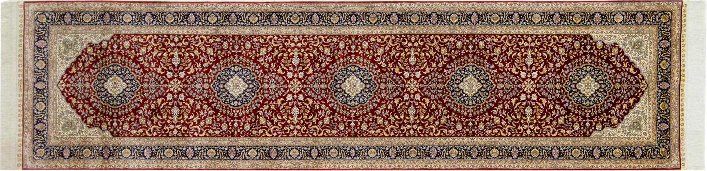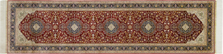 Alfombra número: 303892006341714 Tamaño: 309x79 cm Espesor: alrededor de 5 mm Nudos: 640 000 / m² Elaboración: Anudado a mano Crespón: Seda Urdimbre: Seda Origen: China Edad: Nuevo Peso: alrededor de 7 kg Cantidad en stock: Única - Solo 1 en stock