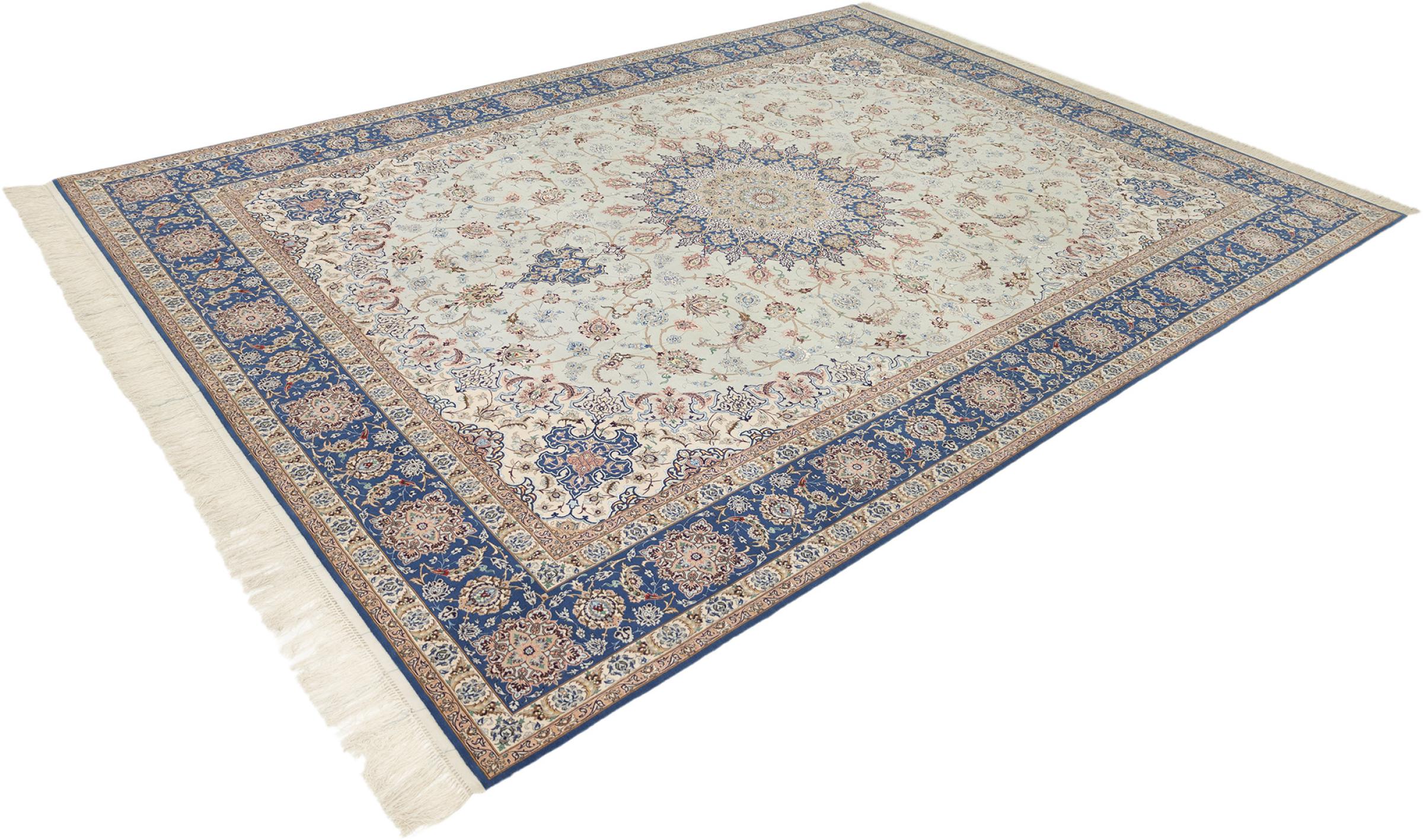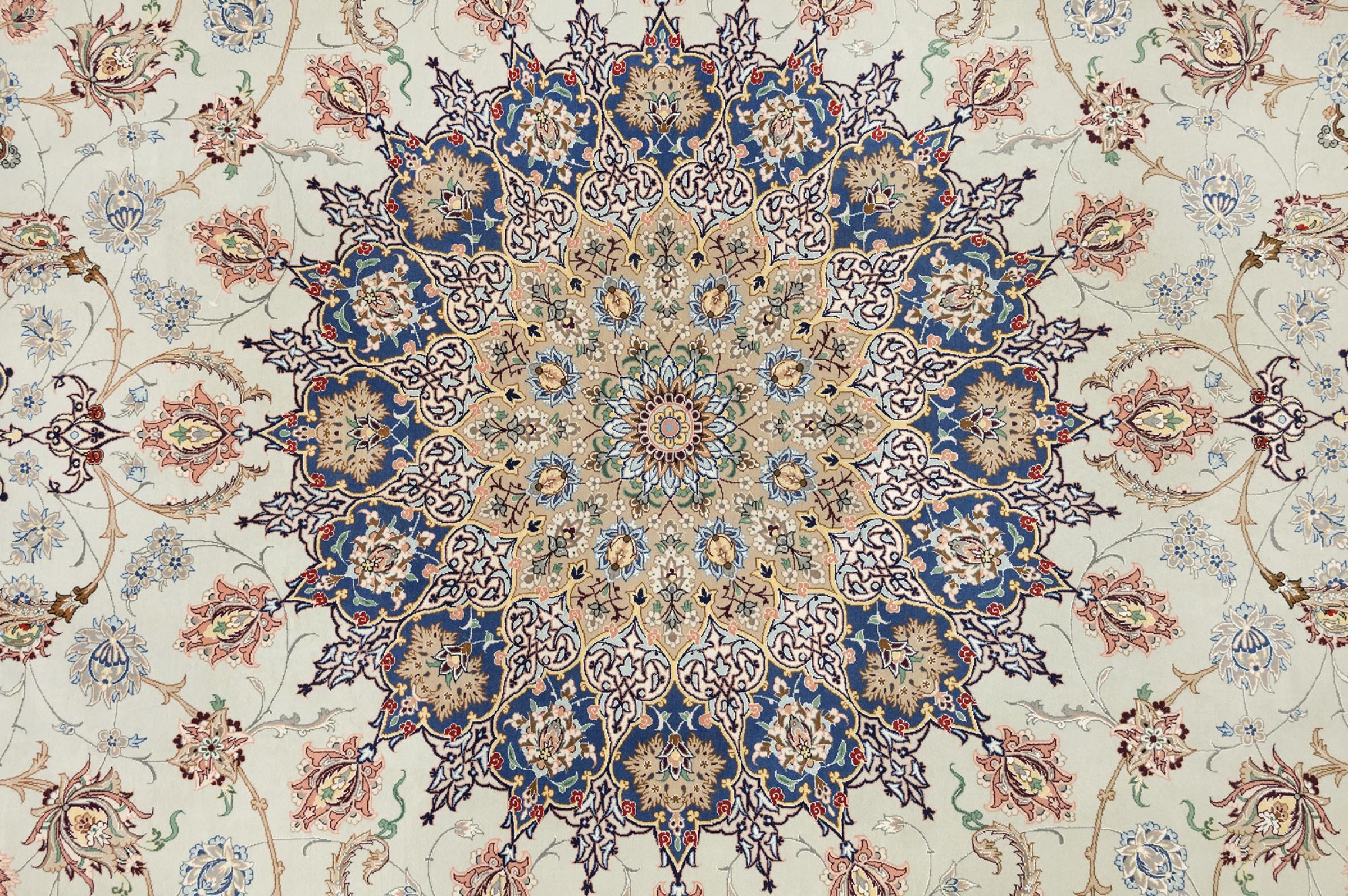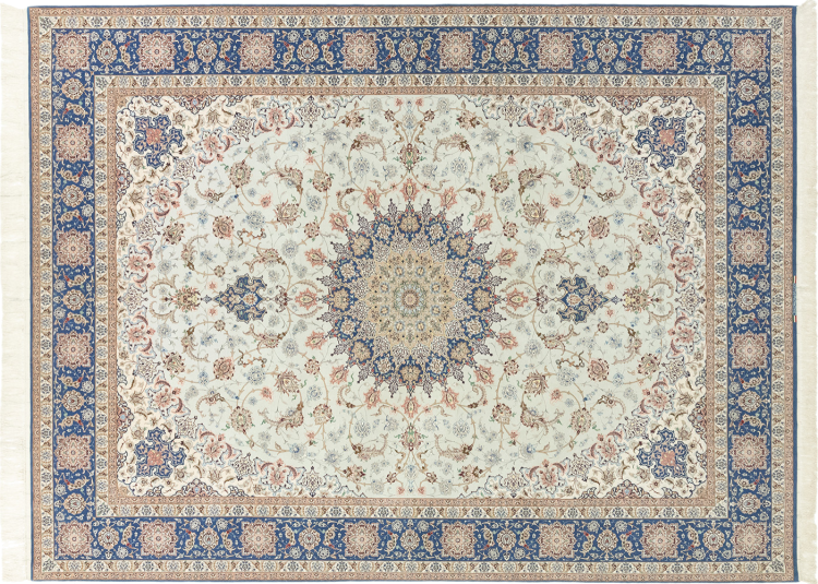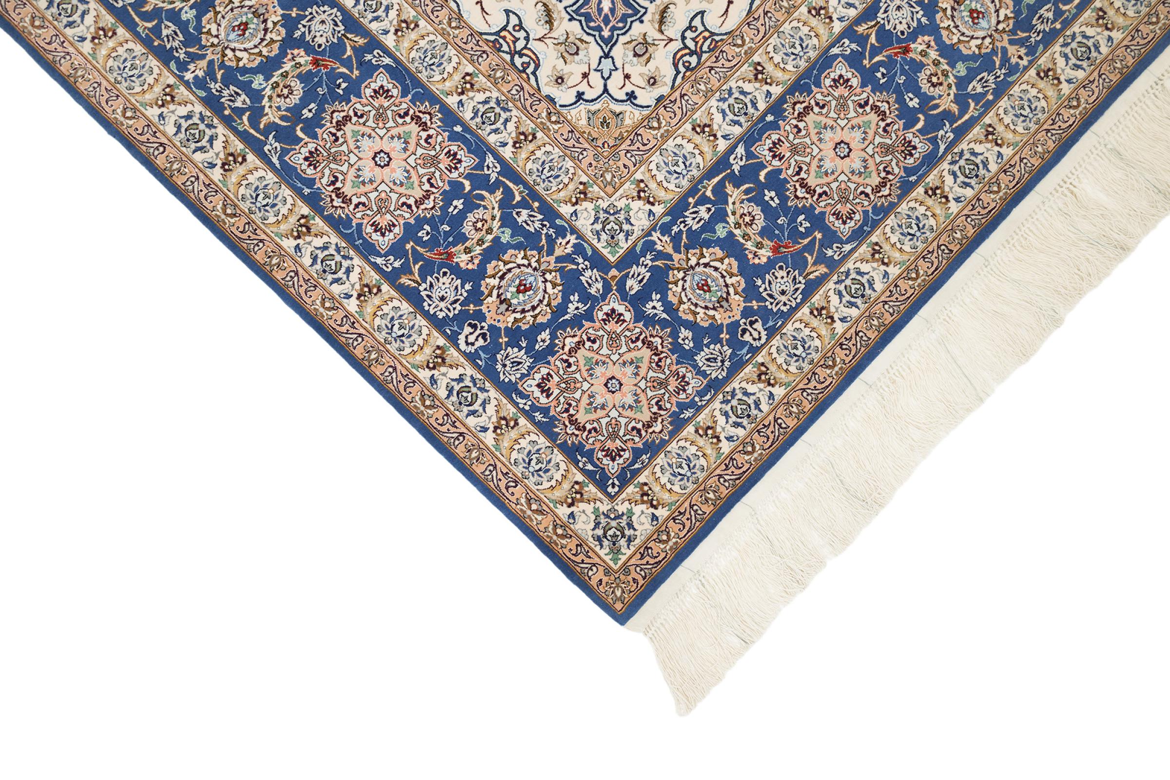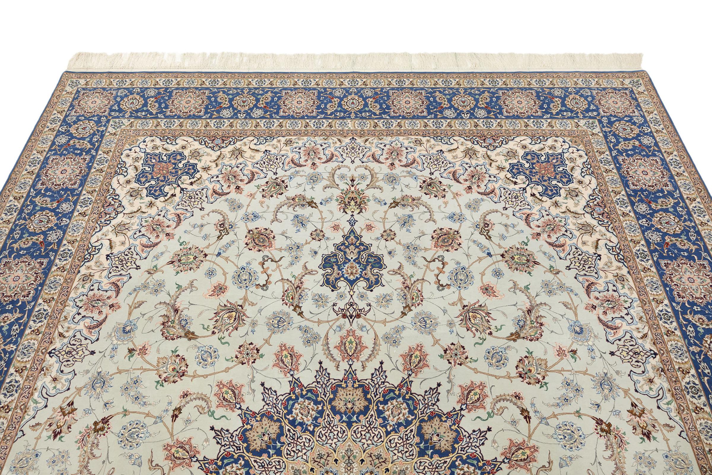 Esta alfombra de Ispahán está hecha con el arte del anudado más tradicional y elevado. Está magistralmente elaborada y decorada con fascinantes ornamentos. La alfombra persa fue anudada a mano en Isfahan, probablemente la ciudad más bella de Irán, a partir de los hilos más finos. Las alfombras de Isfahán se encuentran entre las persas más valiosas y pueden ser una verdadera inversión.