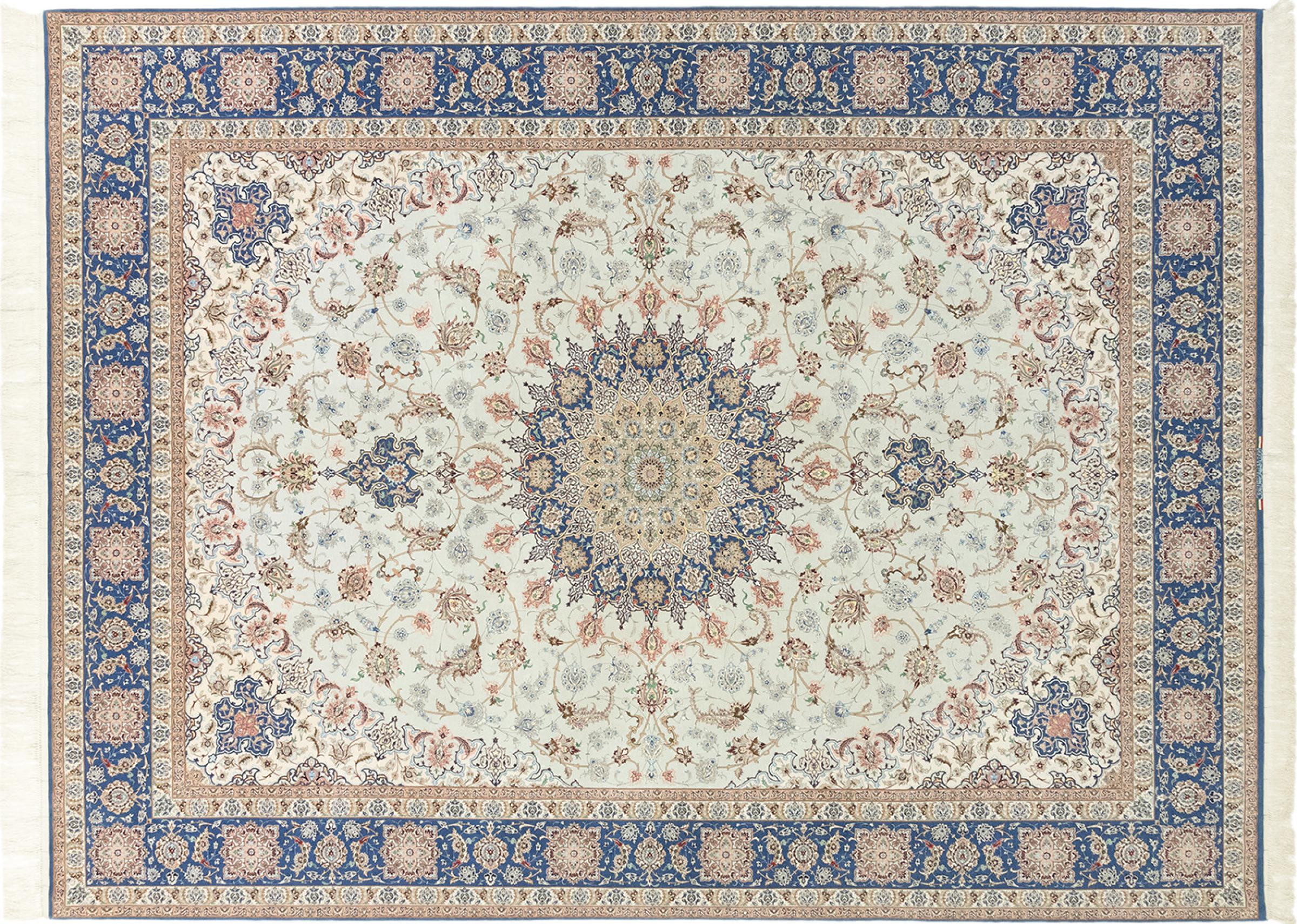 Alfombra número: 316634004022696 Tamaño: 406x300 cm Espesor: alrededor de 8 mm Nudos: 810 000 / m² Elaboración: Anudado a mano Crespón: Lana hilada a mano Urdimbre: Algodón Origen: Persia / Iran Edad: Nuevo Peso: alrededor de 30 kg Cantidad en stock: Única - Solo 1 en stock