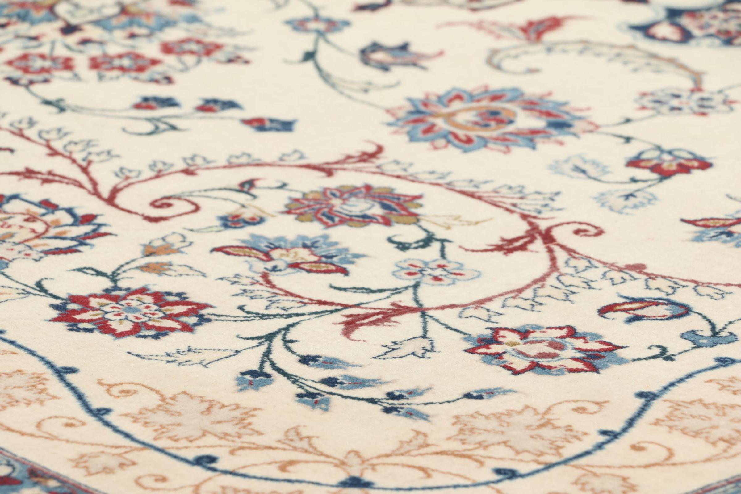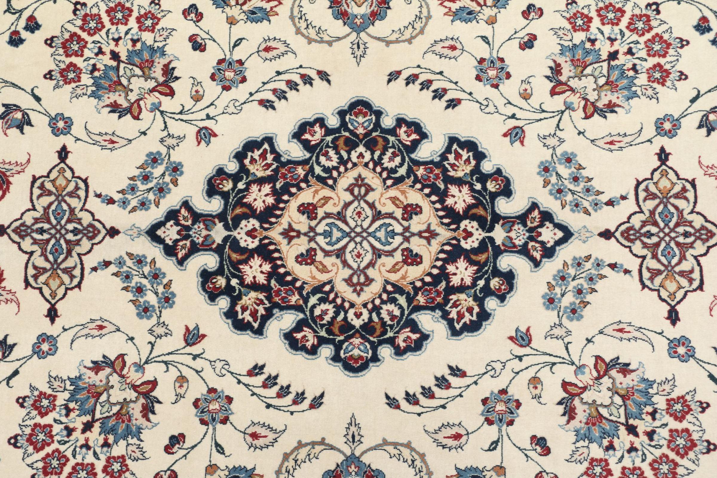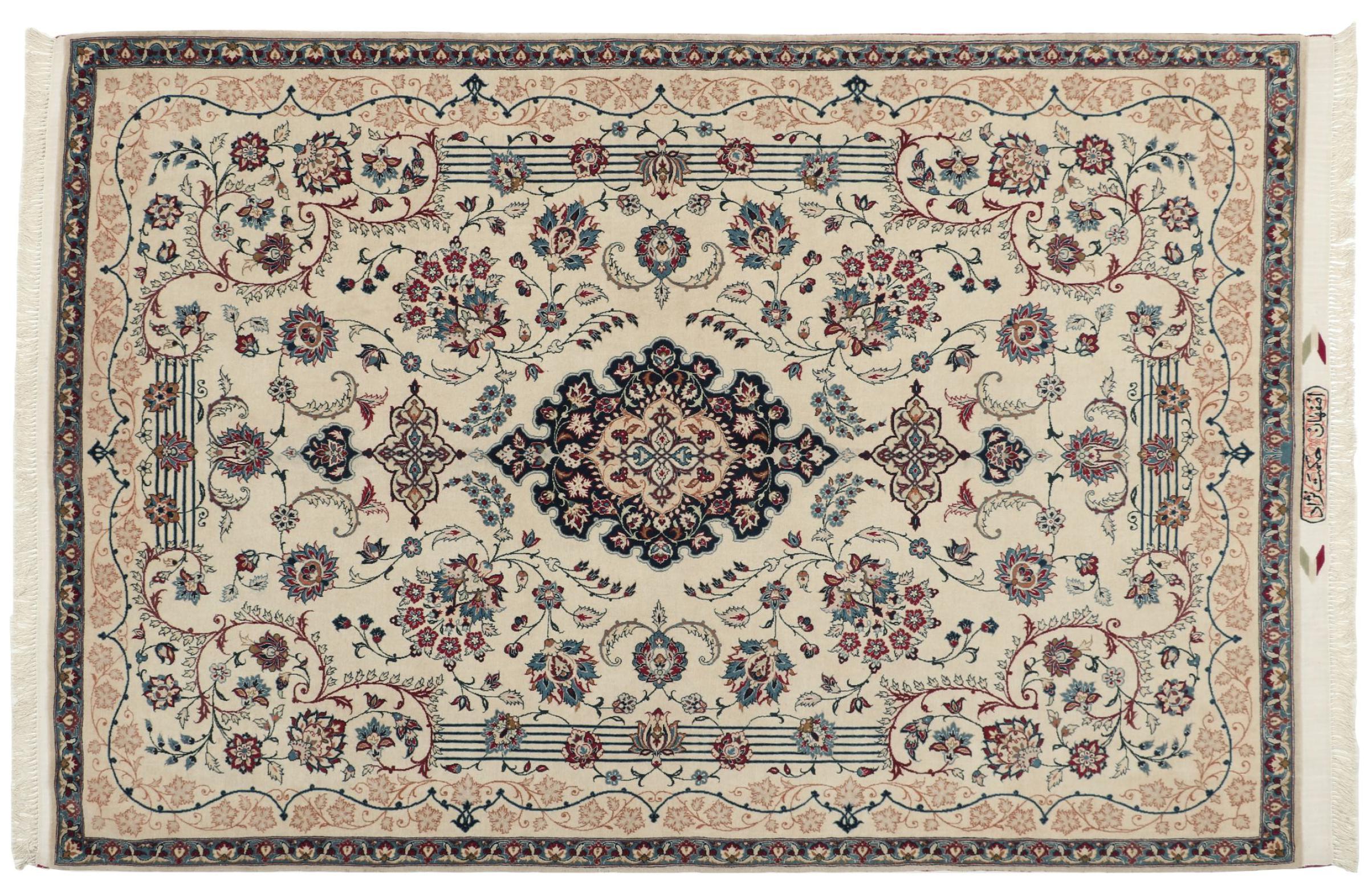 Esta alfombra de Ispahán está hecha con el arte del anudado más tradicional y elevado. Está magistralmente elaborada y decorada con fascinantes ornamentos. La alfombra persa fue anudada a mano en Isfahan, probablemente la ciudad más bella de Irán, a partir de los hilos más finos. Las alfombras de Isfahán se encuentran entre las persas más valiosas y pueden ser una verdadera inversión.