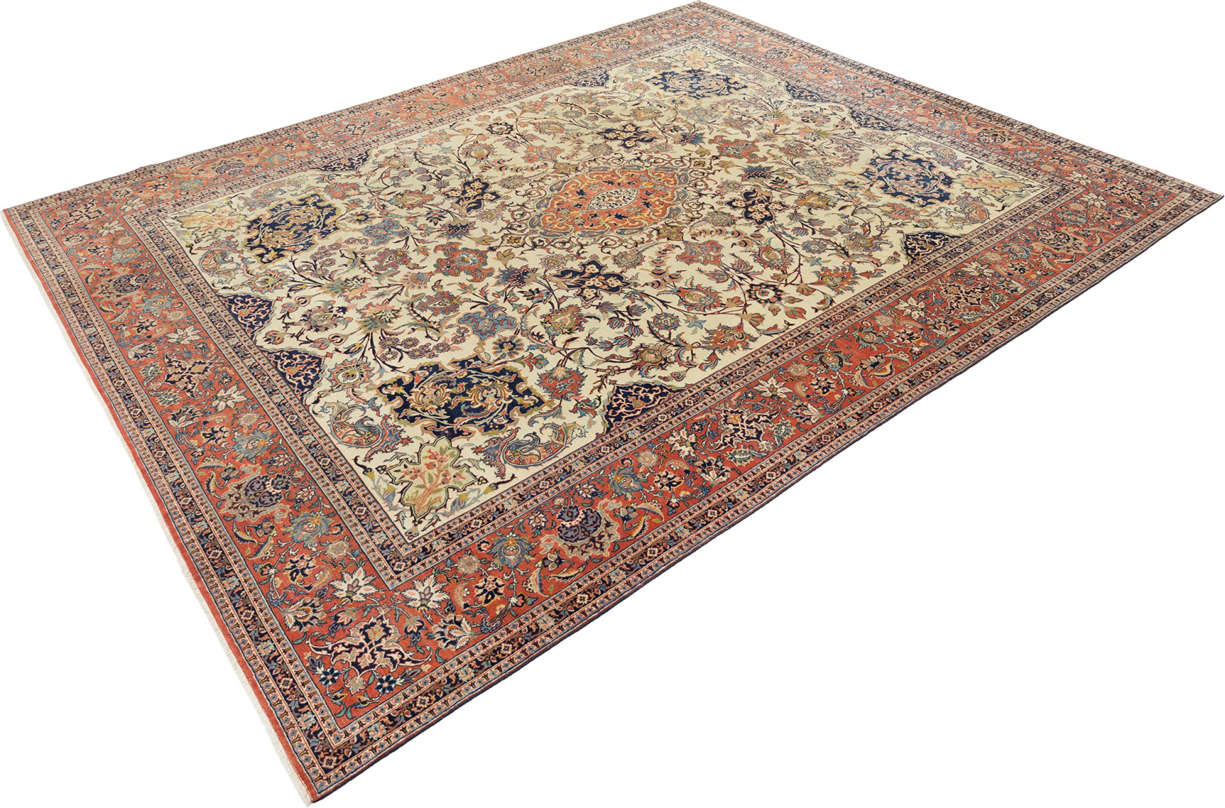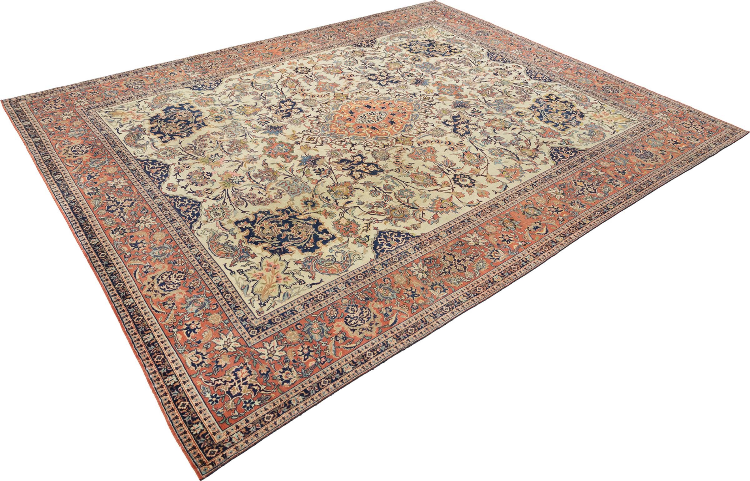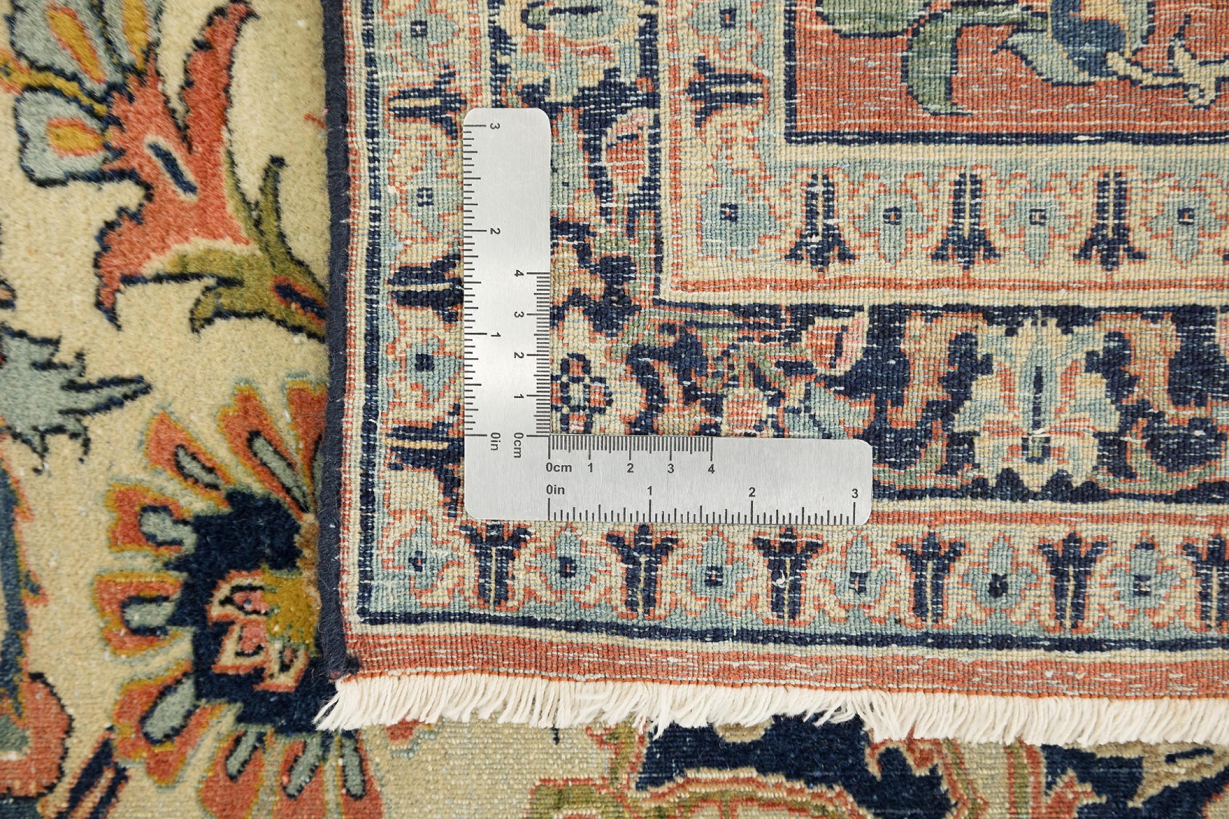 Alfombra número: 316626007984690 Tamaño: 391x313 cm Espesor: alrededor de 8 mm Nudos: 810 000 / m² Elaboración: Anudado a mano Crespón: Lana hilada a mano Urdimbre: Algodón Estado / Conservación Perfecta Origen: Persia / Iran Edad: Antigua, mayor de 80 años Peso: alrededor de 31 kg Cantidad en stock: Única - Solo 1 en stock
