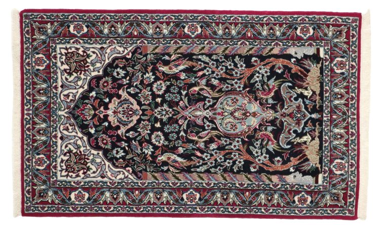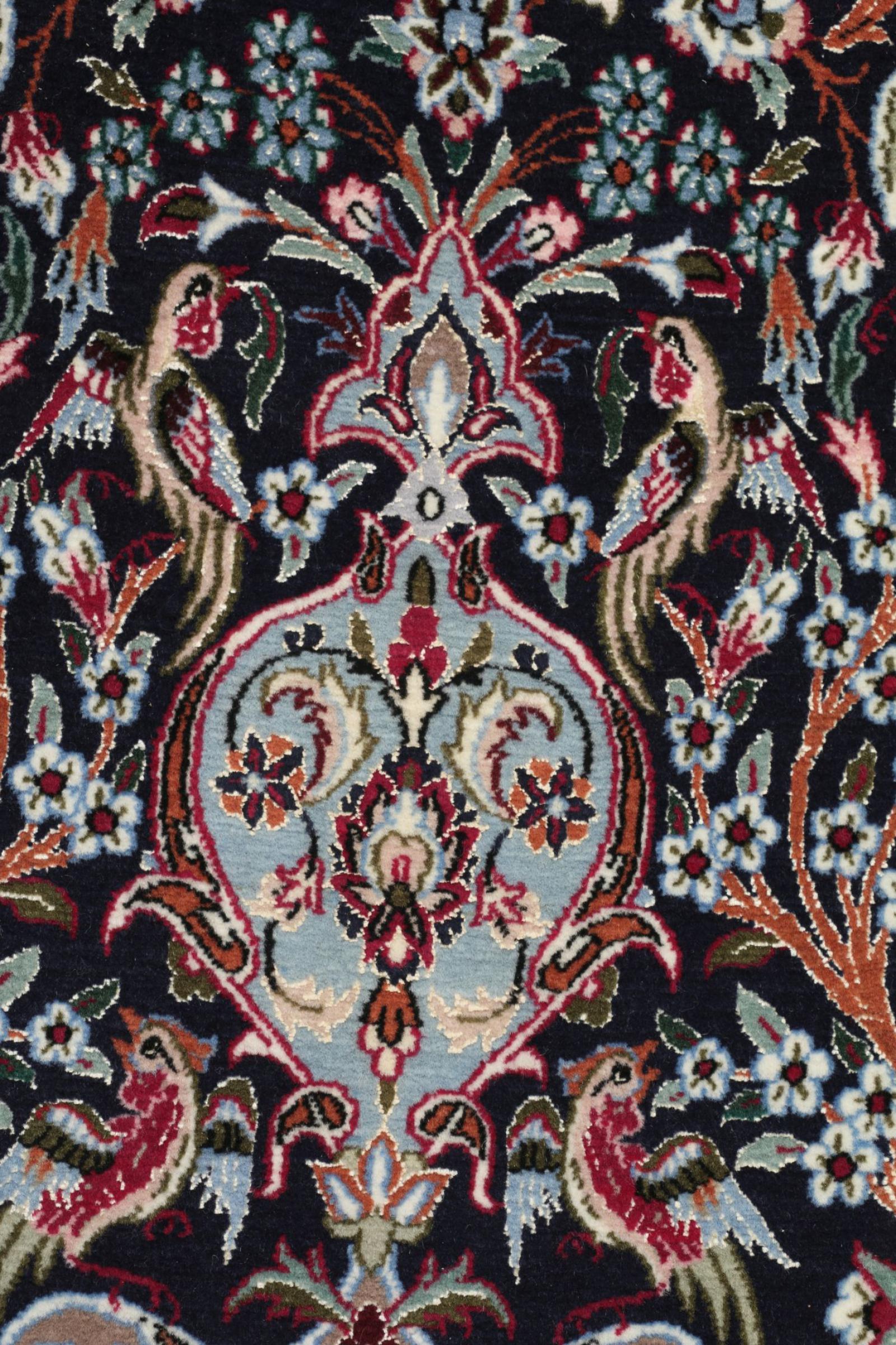 Alfombra número: 308895006435777 Tamaño: 118x70 cm Espesor: alrededor de 6 mm Nudos: 810 000 / m² Elaboración: Anudado a mano Crespón: Lana con seda Urdimbre: Seda Origen: Persia / Iran Edad: Nuevo Peso: alrededor de 2 kg Cantidad en stock: Única - Solo 1 en stock