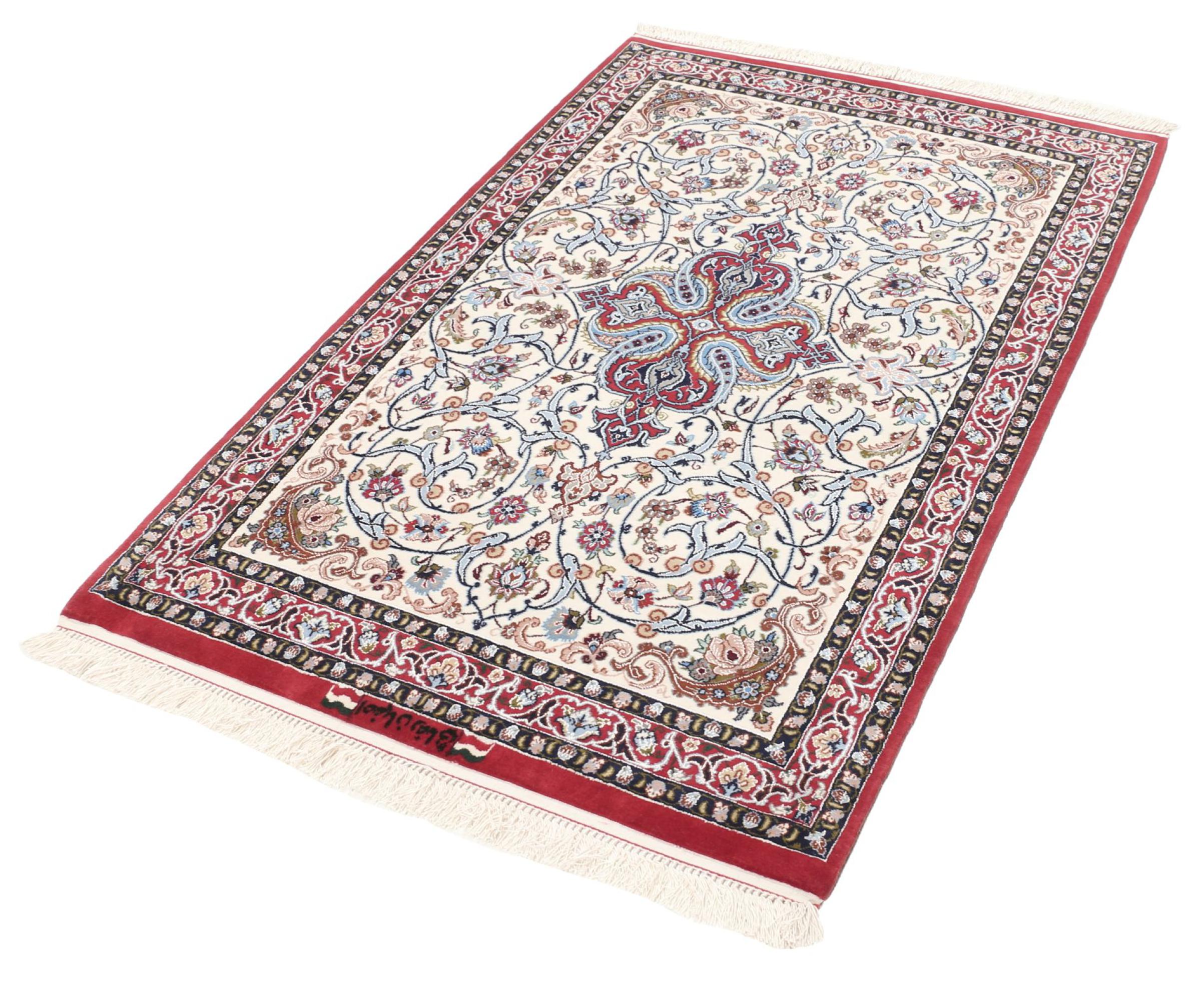Alfombra número: 308692004170180 Tamaño: 121x77 cm Espesor: alrededor de 6 mm Nudos: 810 000 / m² Elaboración: Anudado a mano Crespón: Lana con seda Urdimbre: Seda Origen: Persia / Iran Edad: Nuevo Peso: alrededor de 3 kg Cantidad en stock: Única - Solo 1 en stock