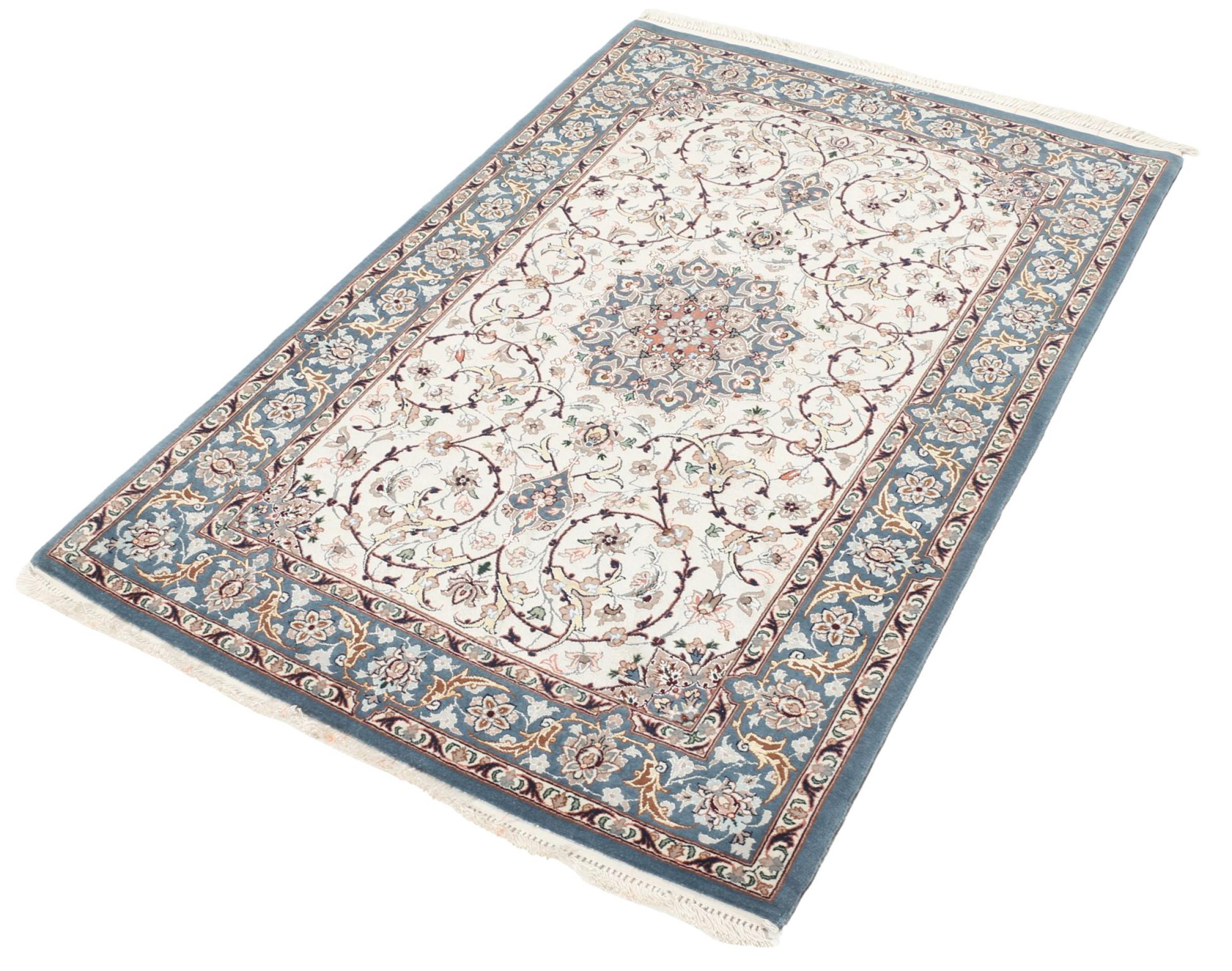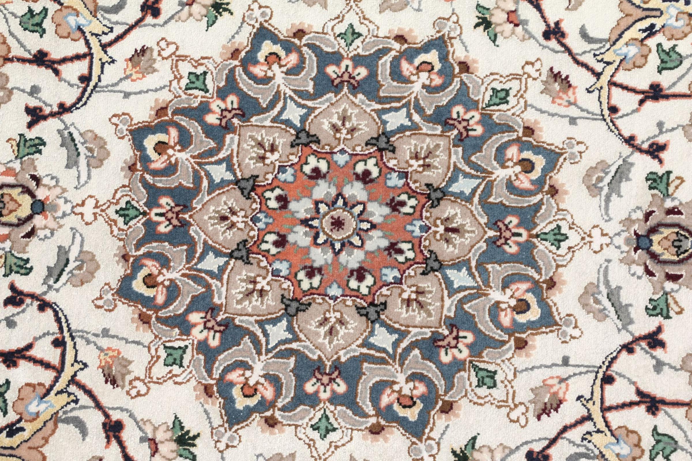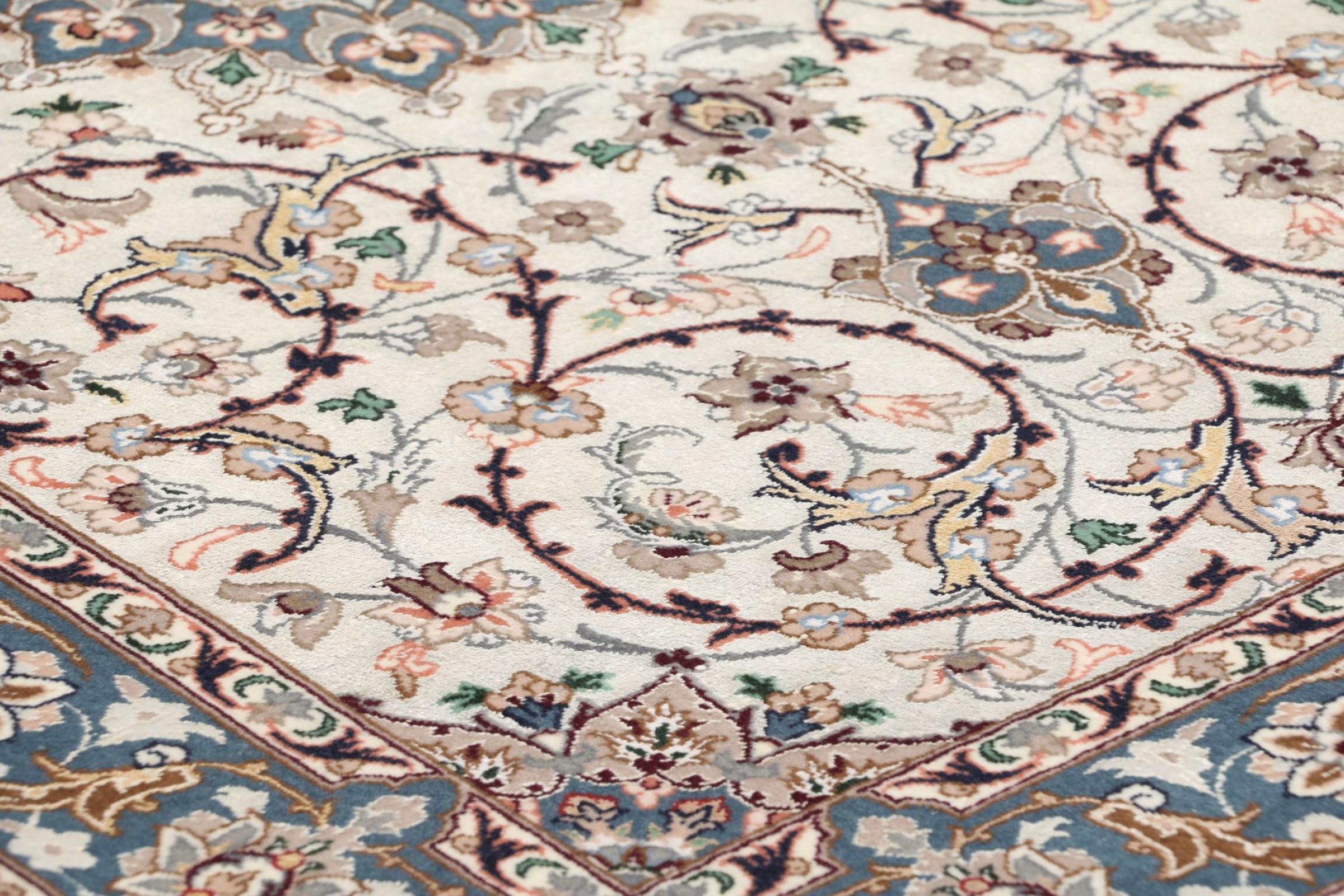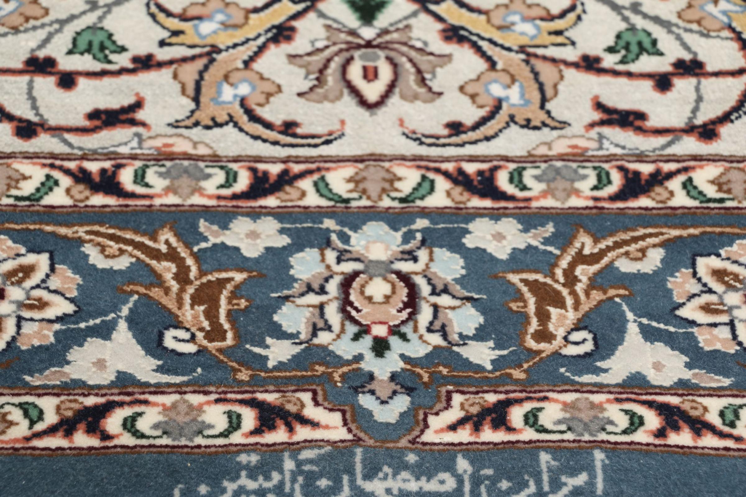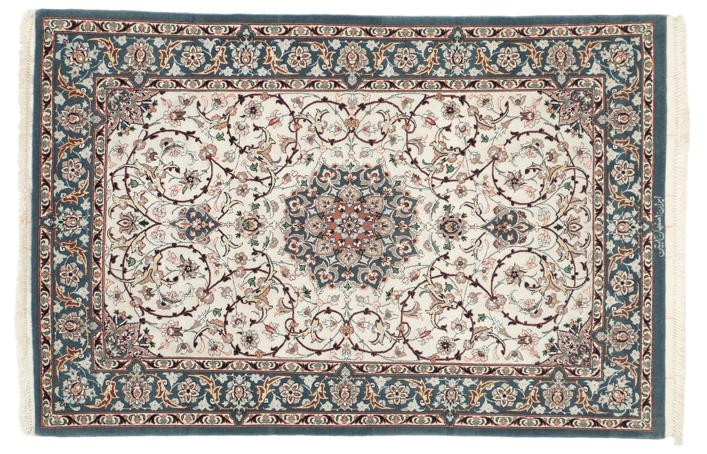 Esta alfombra de Ispahán está hecha con el arte del anudado más tradicional y elevado. Está magistralmente elaborada y decorada con fascinantes ornamentos. La alfombra persa fue anudada a mano en Isfahan, probablemente la ciudad más bella de Irán, a partir de los hilos más finos. Las alfombras de Isfahán se encuentran entre las persas más valiosas y pueden ser una verdadera inversión.