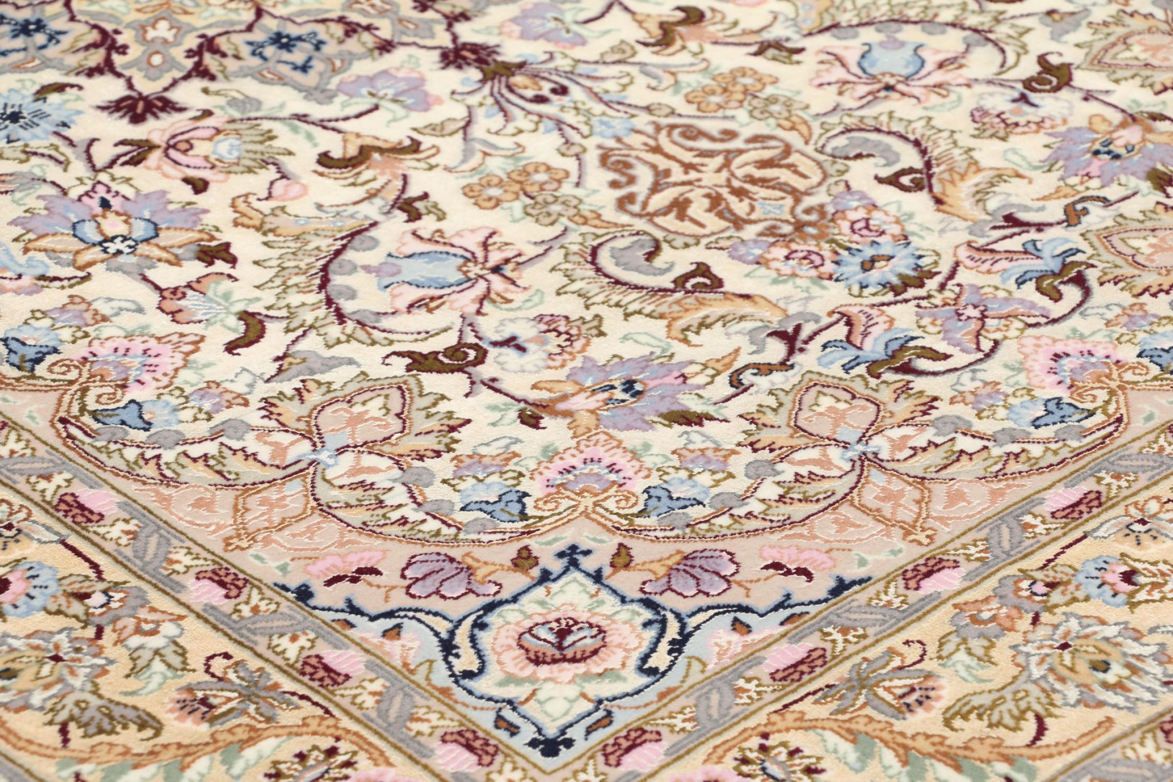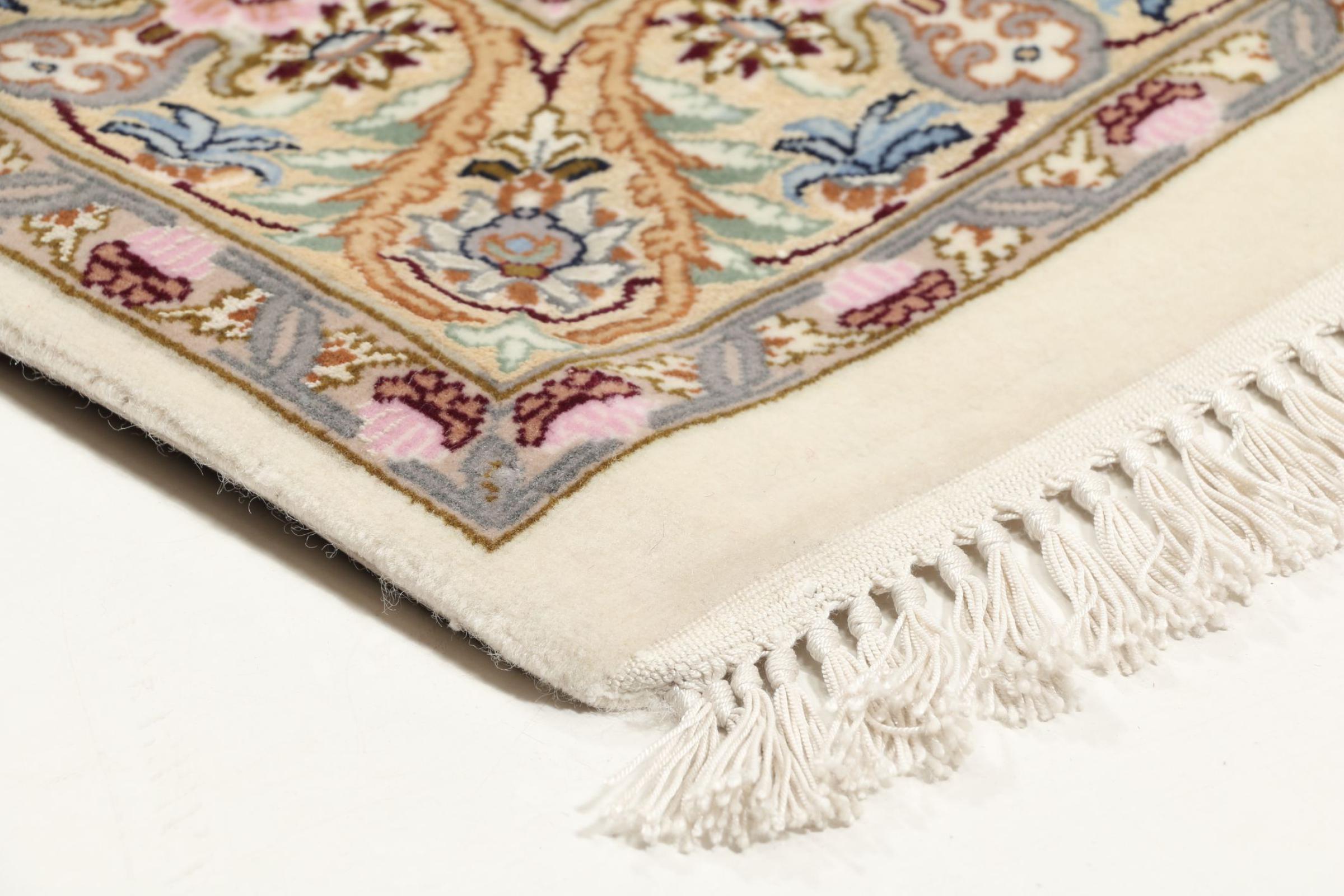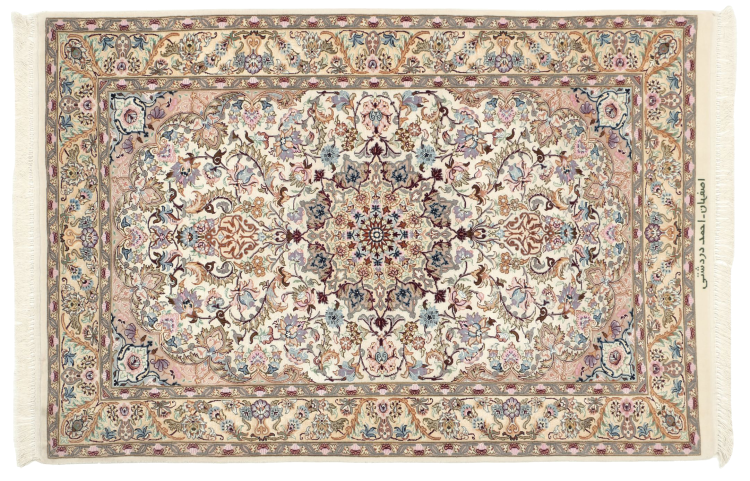Alfombra número: 309304007343452 Tamaño: 139x89 cm Espesor: alrededor de 6 mm Nudos: 810 000 / m² Elaboración: Anudado a mano Crespón: Lana con seda Urdimbre: Seda Origen: Persia / Iran Edad: Nuevo Peso: alrededor de 4 kg Cantidad en stock: Única - Solo 1 en stock