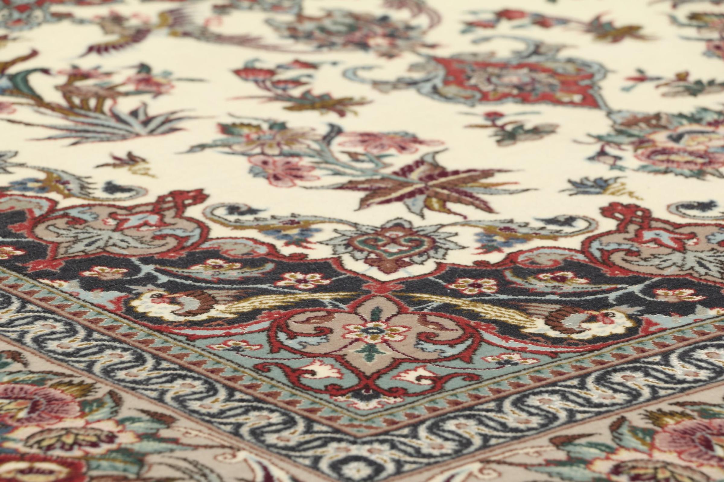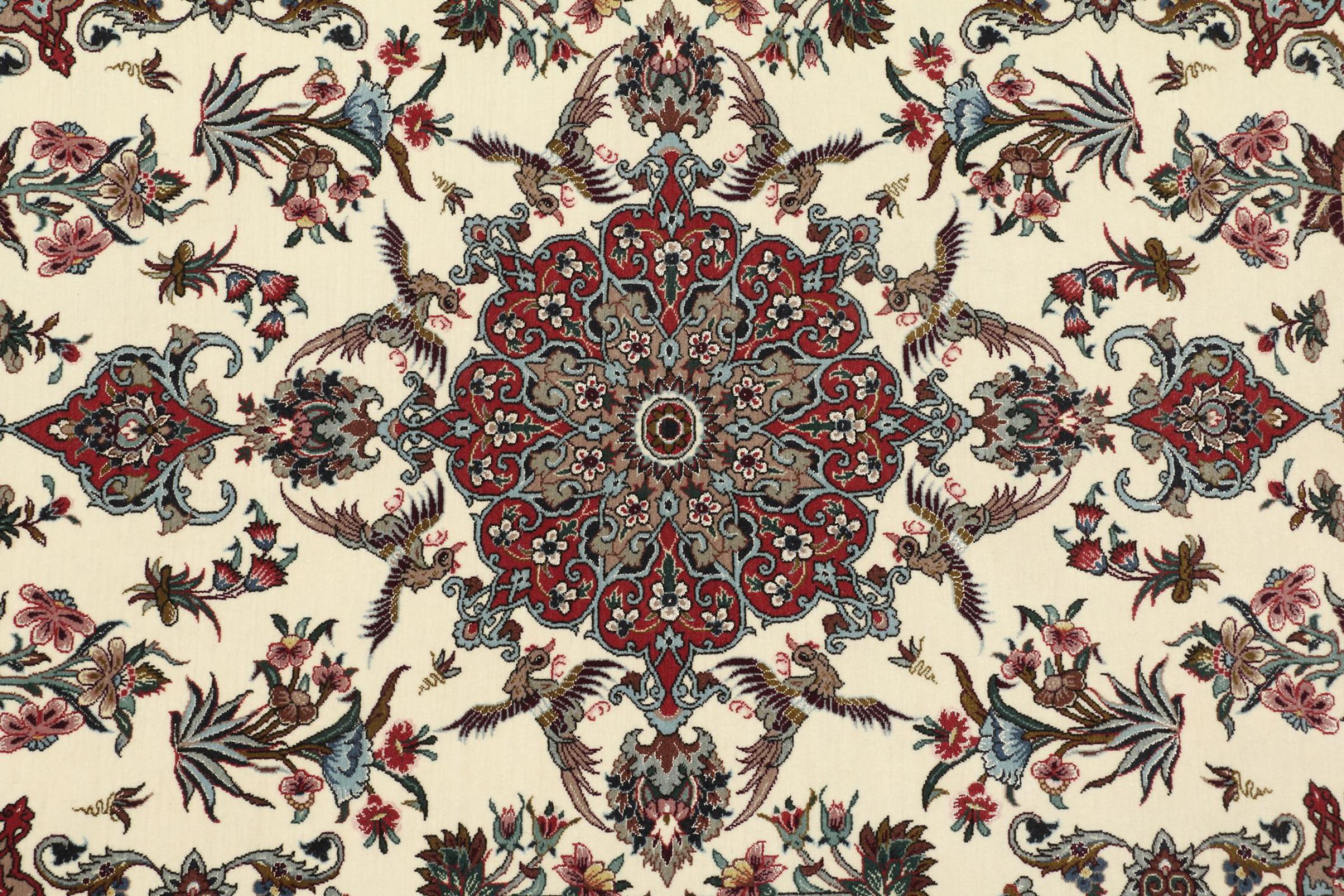 Esta alfombra de Ispahán está hecha con el arte del anudado más tradicional y elevado. Está magistralmente elaborada y decorada con fascinantes ornamentos. La alfombra persa fue anudada a mano en Isfahan, probablemente la ciudad más bella de Irán, a partir de los hilos más finos. Las alfombras de Isfahán se encuentran entre las persas más valiosas y pueden ser una verdadera inversión.